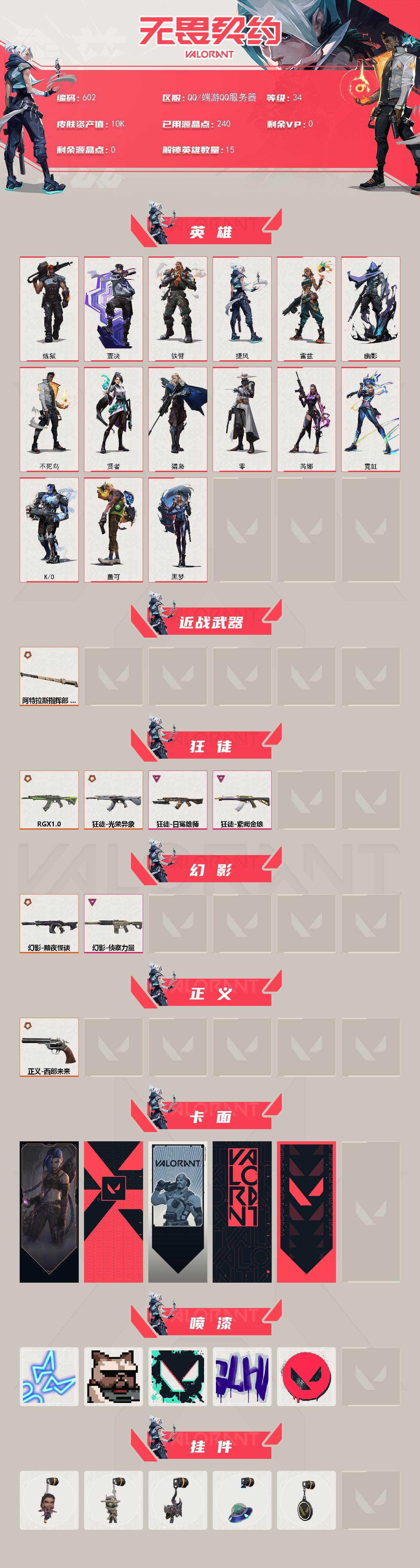 [15249316]【英雄】:炼狱,壹决,铁臂,捷风,雷兹,幽影,不死鸟,贤者,猎枭,零,芮娜,霓虹,K/O,盖可,黑梦 【近战武器】:近战武器-阿特拉斯指挥部 甩棍 【狂徒】:狂徒-RGX 11z Pro,狂徒-光荣异象,狂徒-日冕雄师,狂徒-紫阙金琅 【幻影】:幻影-黯夜怪谈,幻影-侦察力量 【正义】:正义-西部未来 【卡面】:《双城之战》金克丝 卡面,代号红色 卡面,新兵报到 卡面,V契约 卡面,无畏契约 卡面 【喷漆】:霓光四射 喷漆,关门放狗 喷漆,胜利属于无畏契约 喷漆,GLHF 喷漆,无畏契约 喷漆 【挂饰】:无畏契约GO!第一卷 芮娜 挂饰,无畏契约GO!第一卷 零 挂饰,鱼骨头 挂饰,天外飞客 挂饰,无畏契约 纪念币 挂饰
