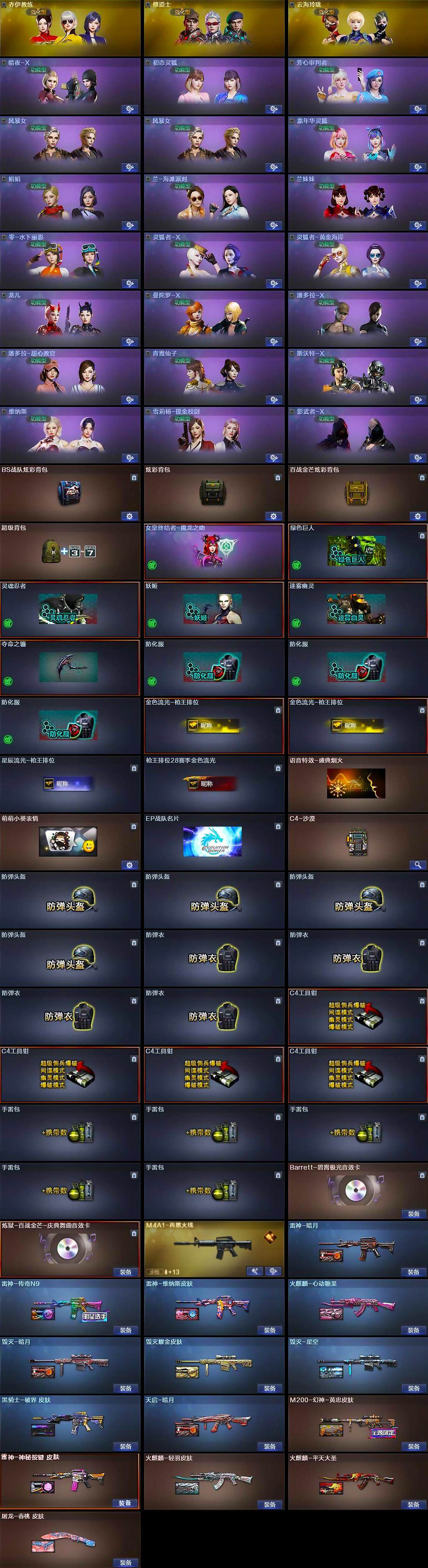 【道具】:BS战队炫彩背包,炫彩背包,百战金芒炫彩背包,超级背包,女皇终结者-魔龙之吻,绿色巨人,灵魂忍者,妖姬,迷雾幽灵,夺命之镰,防化服*3,金色流光-枪王排位*2,星辰流光-枪王排位,枪王排位28赛季金色流光,语音特效-盛典烟火,萌萌小葵表情,EP战队名片,C4-沙漠,防弹头盔*4,防弹衣*4,C4工具钳*4,手雷包*5