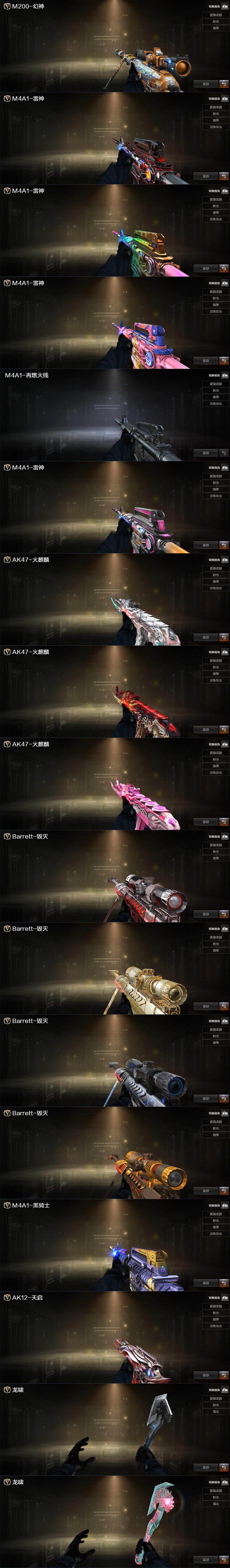 【英雄级武器】:AK47-火麒麟*2,M4A1-雷神,AK12-天启,AK47-黑鲨,无影-神兵利器,黑武士-锦绣游龙,M4A1-玫瑰精灵,QBZ03-金色蔷薇,M4A1-猎神,黑骑士-海王*3,Barrett-毁灭,M200-幻神,炼狱-百战金芒,汤姆逊-烈龙,沙鹰-修罗,屠龙,龙啸,擎天,斩神刀-雷暴,麒麟刺-百战金芒,丛林匕首-玄豹,高爆手雷-雷暴,高爆手雷-竞技荣光*3,高爆手雷-玄豹,闪光弹-雷暴,闪光弹-竞技荣光*4,闪光弹-玄豹,烟雾弹-雷暴,烟雾弹-竞技荣光*3,烟雾弹-玄豹*2,M4A1-苍鸣雷神