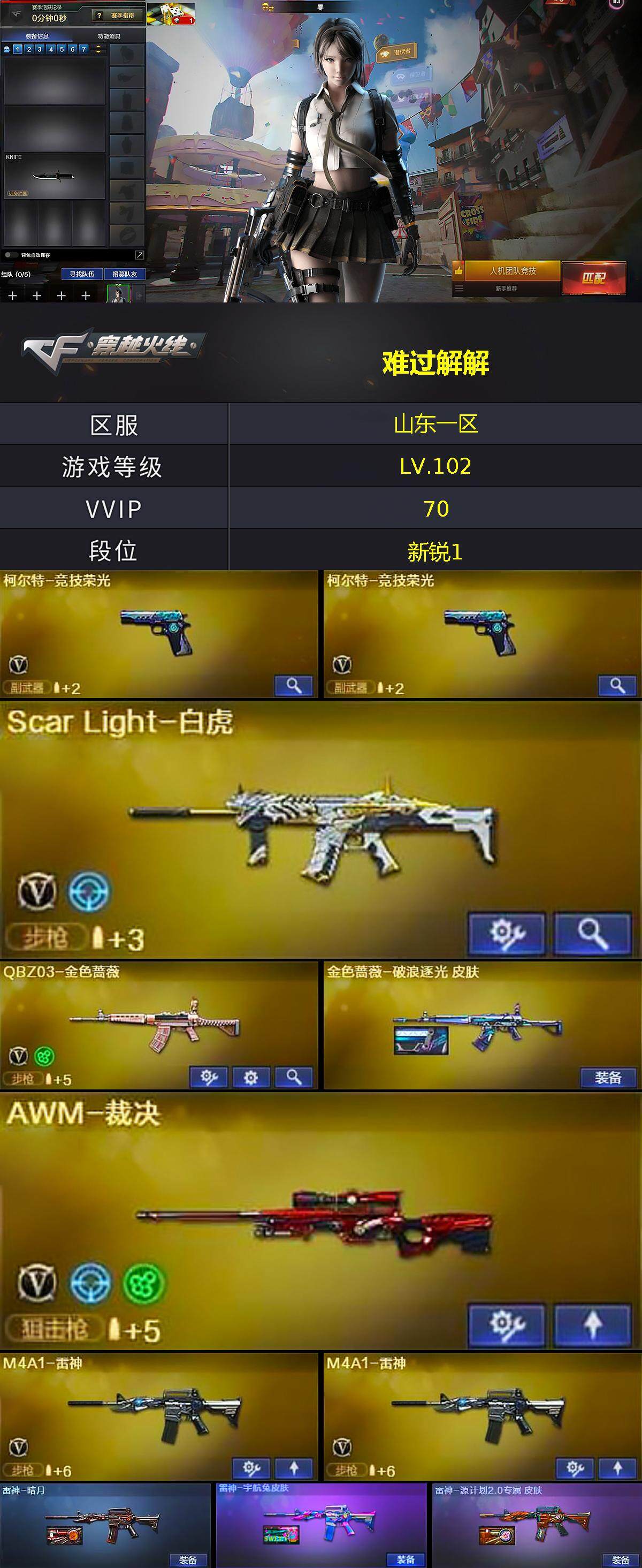 [15249658]山东一区-65V-2王者-4炫金 【热门武器】:QBZ03-金色蔷薇,Scar Light-白虎,死亡之眼,QBZ03-街机,M4A1-黑骑士,沙鹰-修罗*6 【王者炫金武器】:王者之怒,王者之啸,炫金千变,炫金毁灭*2,炫金天神 【音效卡】:死神-雪域霜狐-怀旧音效卡 【皮肤】:金色蔷薇-破浪逐光 皮肤,雷神-暗月,雷神-宇航兔皮肤,雷神-源计划2.0专属 皮肤,毁灭-星空,毁灭-黑曼巴 皮肤,黑龙-暗月,黑骑士-冠军之势,无影-能量核心,天龙-秘银,天龙-能量核心*2,修罗-能量核心*2 【角色】:零,葵,战地猎狐,狐影,雪域霜狐,蛇隐宗,奇洋探员,北极狐-X,电竞少女,风暴女,娟娟,灵狐-花神,灵狐者-黄金海岸,玫瑰花神,青霞仙子,蛇姬,斯沃特-X,铁骑荣耀,维纳斯,新娜塔莎,影武者-X,智影 【人偶武器】:COP-旗袍,夺魂,迷你牛牛,生化手雷-机甲核心 【暴走生化】:死亡之眼,超级对讲机 【挑战大师】:神圣爆裂者-末日III 【英雄级武器】:AK47-火麒麟,M4A1-黑龙,M4A1-雷神*2,M4A1-黑骑士,AK47-无影,AK47-黑武士,AN94-超新星*3,M4A1-武圣,Scar Light-白虎,黑武士-锦绣游龙,超新星-热带奇洋,死神-雪域霜狐,QBZ03-金色蔷薇,AWM-天龙,Barrett-毁灭,AWM-裁决,Barrett-金色蔷薇,沙鹰-修罗*6,沙鹰-天神,柯尔特-竞技荣光*2,Glock18-武圣,屠龙*5,龙啸*2,擎天,麒麟刺*2,龙啸-热带奇洋,高爆手雷-雷霆,高爆手雷-竞技荣光*6,手雷-热带奇洋,高爆手雷-古蛇迷踪,闪光弹-雷霆,闪光弹-竞技荣光*6,烟雾弹-雷霆,烟雾弹-竞技荣光*6,烟雾弹-古蛇迷踪,M4A1-赤狱骑士 【道具】:云山科技背包,亚洲杯纪念炫彩背包,古蛇迷踪炫彩背包,奇洋探员-海龟背包,战舰背包,炫彩背包,热带奇洋炫彩背包,超级背包,雪域霜狐炫彩背包,女皇终结者-魔龙之吻,救世主-黑桃战神,绿色巨人,灵魂忍者,迷雾幽灵,夺命之镰,防化服*3,星辰流光-枪王排位,流光-再燃火线,枪王排位28赛季金色流光,枪王排位29赛季金色流光,语音特效-怀旧,古蛇迷踪打击特效,雪域霜狐表情,蛇隐宗表情,热带奇洋表情,防弹头盔*4,防弹衣*4,C4工具钳*4,手雷包*4 【特殊枪械】:1白虎,1黑骑士