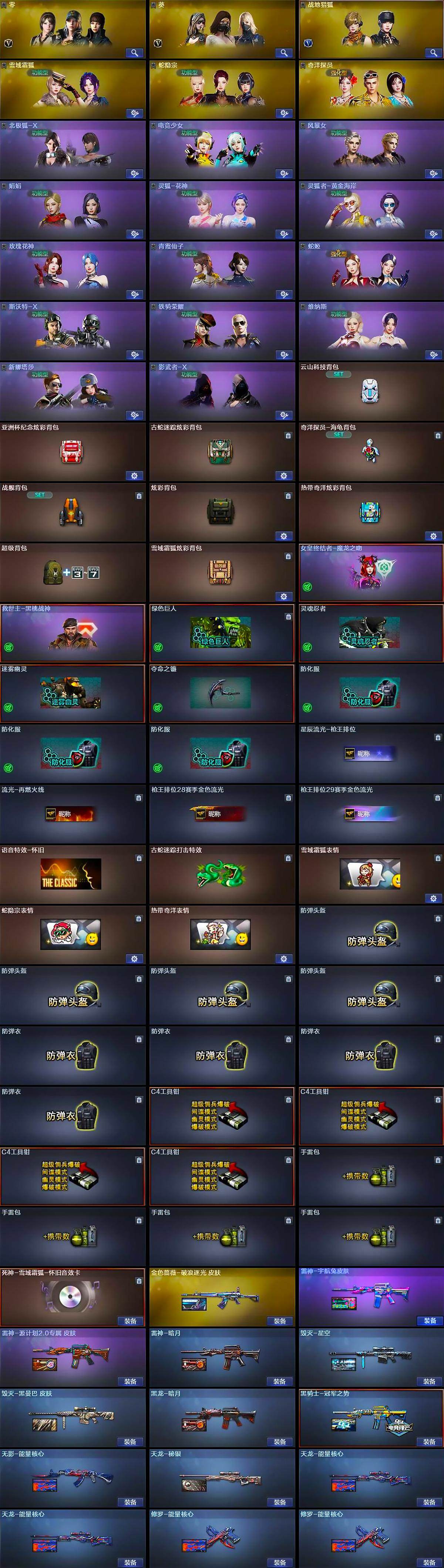 【道具】:云山科技背包,亚洲杯纪念炫彩背包,古蛇迷踪炫彩背包,奇洋探员-海龟背包,战舰背包,炫彩背包,热带奇洋炫彩背包,超级背包,雪域霜狐炫彩背包,女皇终结者-魔龙之吻,救世主-黑桃战神,绿色巨人,灵魂忍者,迷雾幽灵,夺命之镰,防化服*3,星辰流光-枪王排位,流光-再燃火线,枪王排位28赛季金色流光,枪王排位29赛季金色流光,语音特效-怀旧,古蛇迷踪打击特效,雪域霜狐表情,蛇隐宗表情,热带奇洋表情,防弹头盔*4,防弹衣*4,C4工具钳*4,手雷包*4