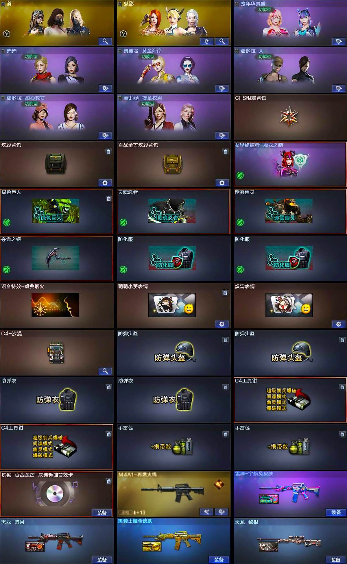 【道具】:CFS限定背包,炫彩背包,百战金芒炫彩背包,女皇终结者-魔龙之吻,绿色巨人,灵魂忍者,迷雾幽灵,夺命之镰,防化服*2,语音特效-盛典烟火,萌萌小葵表情,炽雪表情,C4-沙漠,防弹头盔*2,防弹衣*2,C4工具钳*2,手雷包*2