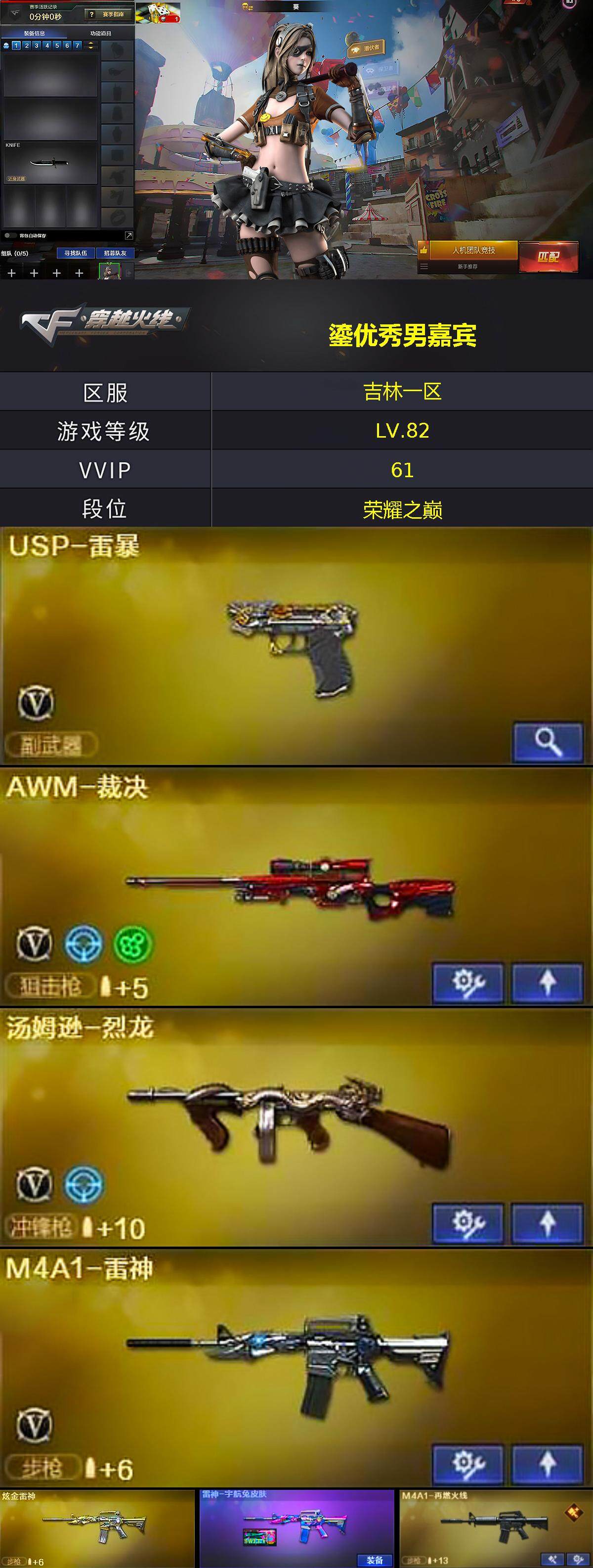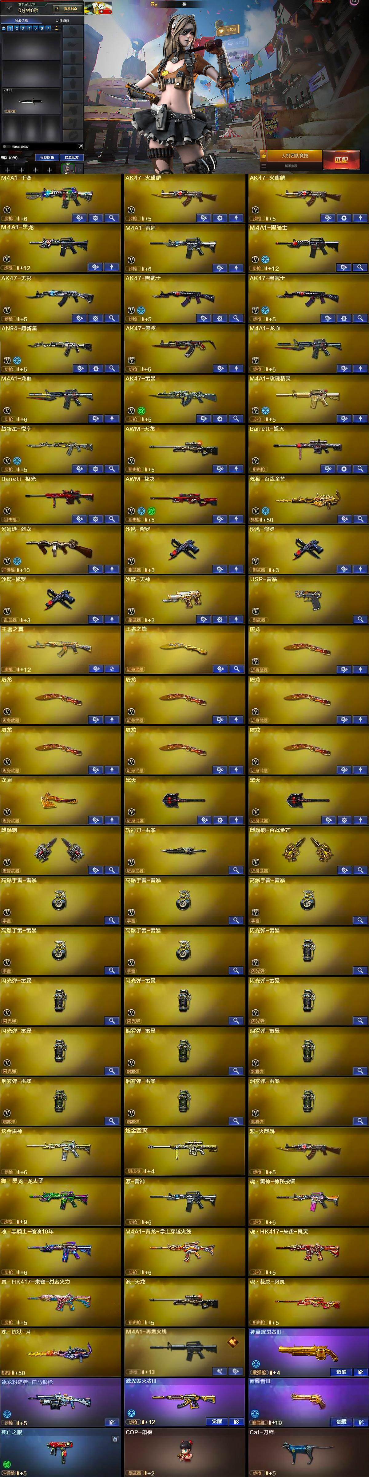 【英雄级武器】:M4A1-千变,AK47-火麒麟*2,M4A1-黑龙,M4A1-雷神,M4A1-黑骑士,AK47-无影,AK47-黑武士*2,AN94-超新星,AK47-黑鲨,M4A1-龙血*2,AK47-雷暴,M4A1-玫瑰精灵,超新星-悦享-觉醒版,AWM-天龙,Barrett-毁灭,Barrett-极光,AWM-裁决,炼狱-百战金芒,汤姆逊-烈龙,沙鹰-修罗*3,沙鹰-天神,USP-雷暴,屠龙*7,龙啸,擎天*2,麒麟刺,斩神刀-雷暴,麒麟刺-百战金芒,高爆手雷-雷暴*5,闪光弹-雷暴*5,烟雾弹-雷暴*5