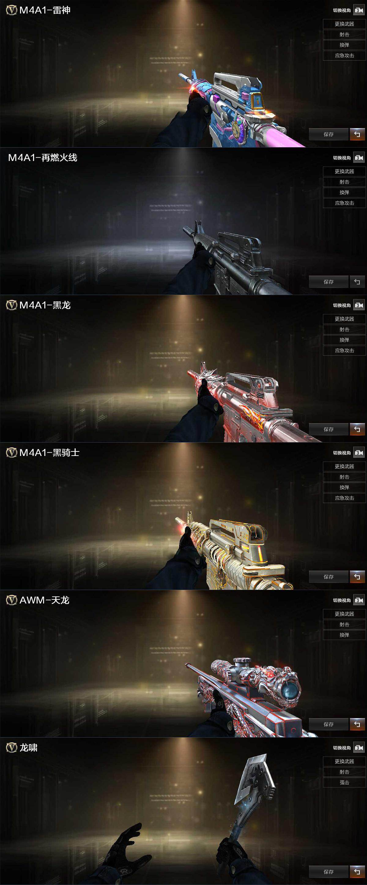 【皮肤】:雷神-宇航兔皮肤,M4A1-再燃火线,黑龙-暗月,黑骑士耀金皮肤,天龙-秘银,轻型军用手斧-再燃火线