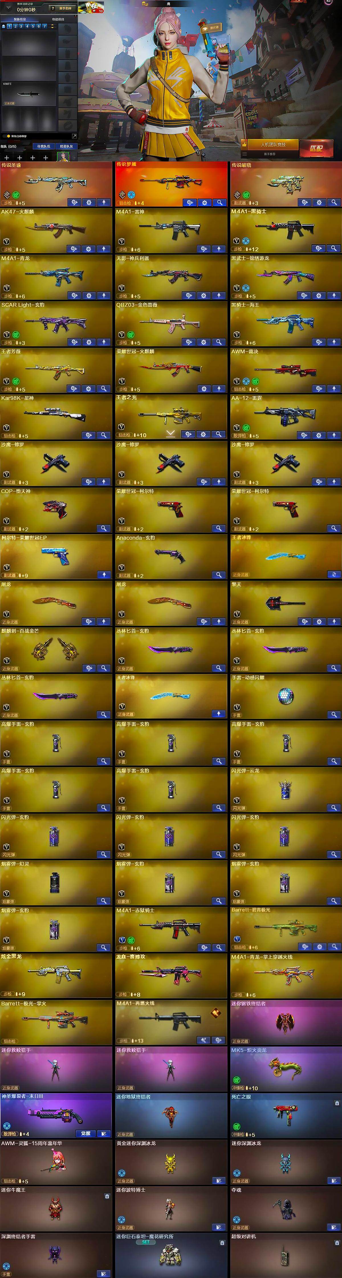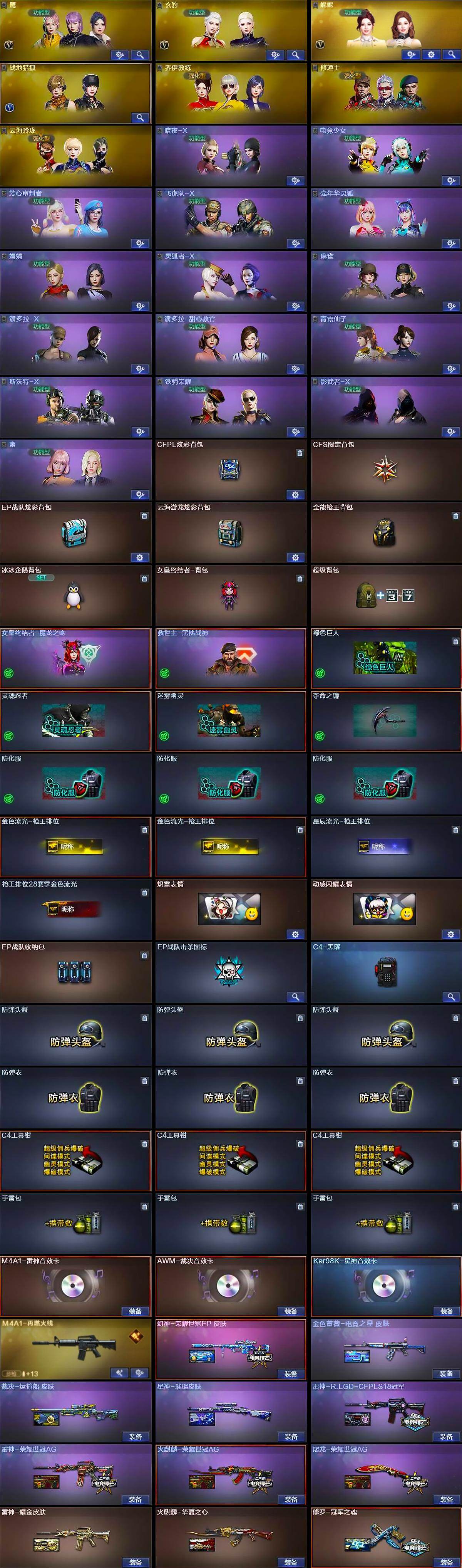 【英雄级武器】:AK47-火麒麟,M4A1-雷神,M4A1-黑骑士,M4A1-青龙,无影-神兵利器,黑武士-锦绣游龙,SCAR Light-玄豹,QBZ03-金色蔷薇,黑骑士-海王,王者芳薇-觉醒版,荣耀世冠-火麒麟,AWM-裁决,Kar98K-星神,王者之光-觉醒版,AA-12-雷霆,沙鹰-修罗*3,COP-堕天神,荣耀世冠-柯尔特*2,柯尔特-荣耀世冠EP,Anaconda-玄豹,屠龙*2,擎天,麒麟刺-百战金芒,丛林匕首-玄豹*3,王者冰锋-觉醒版,手雷-动感闪耀,高爆手雷-玄豹*5,闪光弹-云龙,闪光弹-玄豹*3,烟雾弹-幻灵,烟雾弹-玄豹*3,烟雾弹-荣耀世冠EP*4,M4A1-赤狱骑士,Barrett-碧霄极光