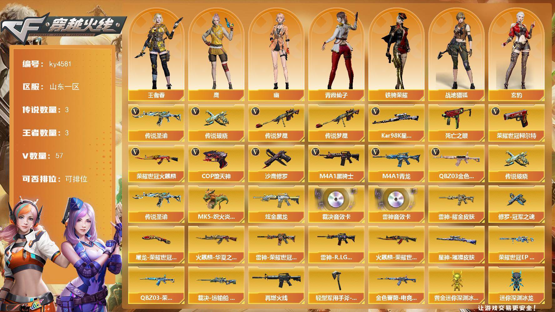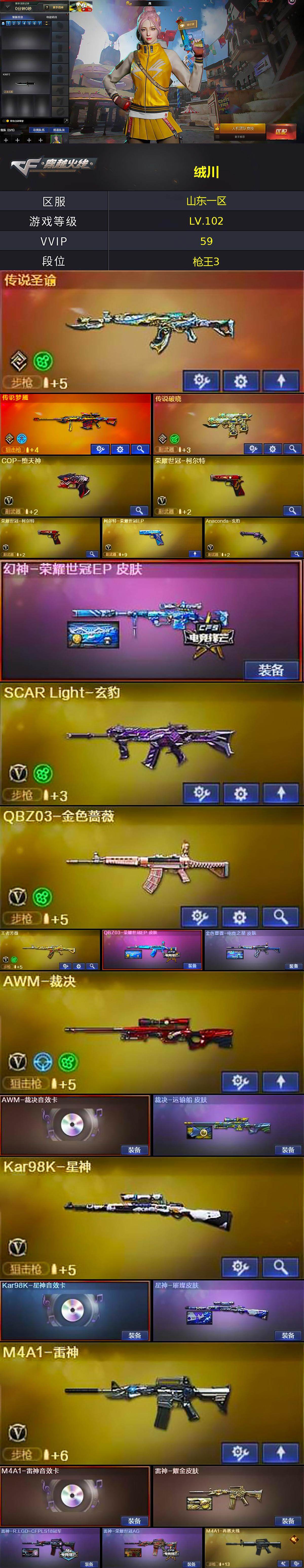[15249803]山东一区-57V-3王者-1炫金 【传说武器】:传说圣谕,传说梦魇,传说破晓 【热门武器】:传说梦魇,传说圣谕,传说破晓,QBZ03-金色蔷薇,M4A1-青龙,死亡之眼,荣耀世冠-火麒麟,荣耀世冠-柯尔特*2,Kar98K-星神,M4A1-黑骑士,MK5-炽火炎龙,COP-堕天神,沙鹰-修罗*3 【王者炫金武器】:炫金黑龙 【音效卡】:M4A1-雷神音效卡,AWM-裁决音效卡 【皮肤】:幻神-荣耀世冠EP 皮肤,QBZ03-荣耀世冠EP 皮肤,金色蔷薇-电竞之星 皮肤,裁决-运输船 皮肤,星神-璀璨皮肤,雷神-耀金皮肤,雷神-R.LGD-CFPLS18冠军,雷神-荣耀世冠AG,M4A1-再燃火线,火麒麟-华夏之心,火麒麟-荣耀世冠AG,修罗-冠军之魂,屠龙-荣耀世冠AG,轻型军用手斧-再燃火线 【角色】:鹰,玄豹,妮妮,战地猎狐,王者春,乔伊教练,修道士,云海玲珑,暗夜-X,电竞少女,芳心审判者,飞虎队-X,嘉年华灵狐,娟娟,灵狐者-X,麻雀,潘多拉-X,潘多拉-甜心教官,青霞仙子,斯沃特-X,铁骑荣耀,影武者-X,幽 【人偶武器】:迷你钢铁终结者,迷你救赎猎手*2,MK5-炽火炎龙,迷你地狱终结者,AWM-灵狐-15周年嘉年华,黄金迷你深渊冰龙,迷你深渊冰龙,迷你牛魔王,迷你波特博士,夺魂,深渊终结者手雷,迷你巨石泰坦-魔花研究所 【暴走生化】:死亡之眼,超级对讲机 【挑战大师】:神圣爆裂者-末日III 【英雄级武器】:AK47-火麒麟,M4A1-雷神,M4A1-黑骑士,M4A1-青龙,无影-神兵利器,黑武士-锦绣游龙,SCAR Light-玄豹,QBZ03-金色蔷薇,黑骑士-海王,王者芳薇-觉醒版,荣耀世冠-火麒麟,AWM-裁决,Kar98K-星神,王者之光-觉醒版,AA-12-雷霆,沙鹰-修罗*3,COP-堕天神,荣耀世冠-柯尔特*2,柯尔特-荣耀世冠EP,Anaconda-玄豹,屠龙*2,擎天,麒麟刺-百战金芒,丛林匕首-玄豹*3,王者冰锋-觉醒版,手雷-动感闪耀,高爆手雷-玄豹*5,闪光弹-云龙,闪光弹-玄豹*3,烟雾弹-幻灵,烟雾弹-玄豹*3,烟雾弹-荣耀世冠EP*4,M4A1-赤狱骑士,Barrett-碧霄极光 【道具】:CFPL炫彩背包,CFS限定背包,EP战队炫彩背包,云海游龙炫彩背包,全能枪王背包,冰冰企鹅背包,女皇终结者-背包,超级背包,女皇
