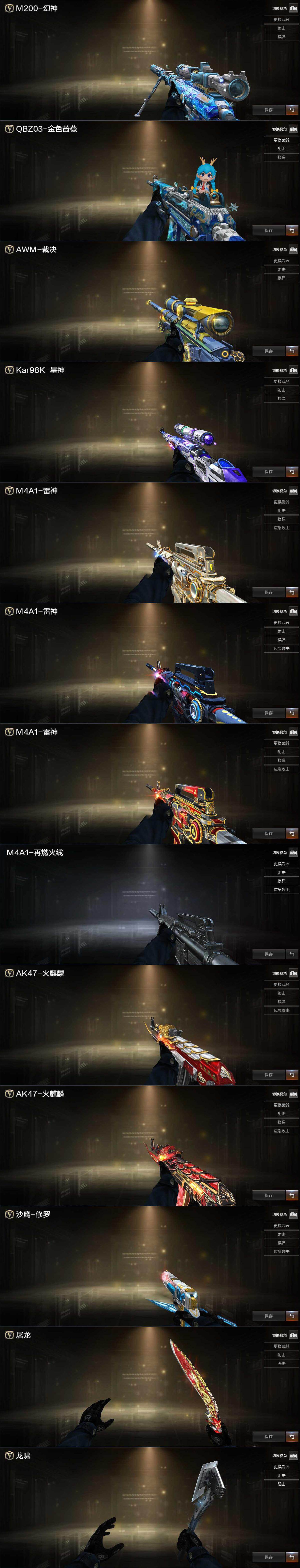 【热门武器】:传说梦魇,传说圣谕,传说破晓,QBZ03-金色蔷薇,M4A1-青龙,死亡之眼,荣耀世冠-火麒麟,荣耀世冠-柯尔特*2,Kar98K-星神,M4A1-黑骑士,MK5-炽火炎龙,COP-堕天神,沙鹰-修罗*3
