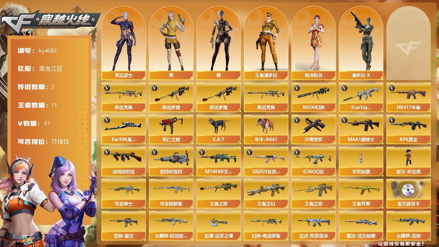 [15249819]黑龙江区-67V-11王者-2炫金 【传说武器】:传说梦魇,传说灵眸 【热门武器】:传说梦魇,传说灵眸,G36C-幻影,QBZ03-金色蔷薇,M14EBR-玄武,Scar Light-白虎,HK417-朱雀,M200-幻神,死亡之眼,Kar98K-星神,C.A.T,牛牛-AK47,M4A1-黑骑士,汤姆逊-烈龙*3,RPK-盘龙*3,加特林-炼狱*3,羊驼玩偶,毁灭-孙三炮,沙鹰-修罗*2 【王者炫金武器】:王者之幻,王者之势*2,王者芳薇,王者之怒,炫金骑士,炫金超新星 【音效卡】:Barrett-毁灭音效卡 【皮肤】:幻神-电流骇客 皮肤*2,白虎-热带奇洋 皮肤,裁决-流光秘银,雷神-星空,火麒麟-雷神,火麒麟-轻羽皮肤,黑龙-暗月,超新星-深海萌鲨 皮肤,龙啸-冠军之啸 【角色】:瞳,鹰,王者潘多拉,奇洋探员,灵动武士,潘多拉-X 【人偶武器】:毁灭-孙三炮,C.A.T,牛牛-AK47,迷你深渊冰龙-王绿豆 【暴走生化】:死亡之眼 【挑战大师】:神圣爆裂者III,激光毁灭者III,阐释者III 【英雄级武器】:AK47-火麒麟,M4A1-黑龙*2,M4A1-雷神*3,M4A1-黑骑士,M4A1-死神,AK47-黑武士,AK12-天启,AN94-超新星*2,M4A1-武圣*2,AK47-黑鲨,M4A1-龙血,HK417-朱雀,Scar Light-白虎,M14EBR-玄武,G36C-幻影,超新星-热带奇洋,M4A1-玫瑰精灵*2,QBZ03-金色蔷薇,王者之魄-觉醒版,AWM-天龙,Barrett-毁灭*3,AWM-裁决,M200-幻神,Kar98K-星神,王者之光-觉醒版*2,RPK-盘龙*3,加特林-炼狱*3,炼狱-悦蓝-觉醒版,汤姆逊-烈龙*3,AA-12-雷霆,王者之霆-觉醒版,沙鹰-修罗*2,沙鹰-天神*4,Glock18-武圣,屠龙*3,龙啸,马来剑-夜魔,擎天*2,麒麟刺*3,龙啸-热带奇洋,斩神刀-雷暴,王者之锋-觉醒版,高爆手雷-雷暴,高爆手雷-夜魔,手雷-热带奇洋,闪光弹-雷暴,闪光弹-夜魔,烟雾弹-雷暴,烟雾弹-夜魔 【道具】:奇洋探员-海龟背包,战舰背包,热带奇洋炫彩背包,超级背包,夺命之镰,防化服,热带奇洋表情,防弹头盔,防弹衣,C4工具钳,手雷包 【特殊枪械】:1白虎,1黑骑士,3烈龙,3盘龙,3炼狱