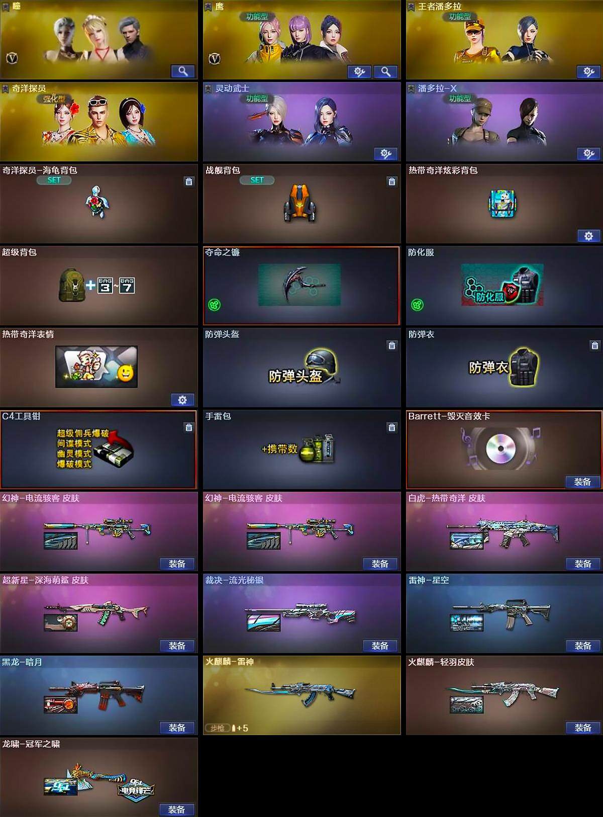 【道具】:奇洋探员-海龟背包,战舰背包,热带奇洋炫彩背包,超级背包,夺命之镰,防化服,热带奇洋表情,防弹头盔,防弹衣,C4工具钳,手雷包