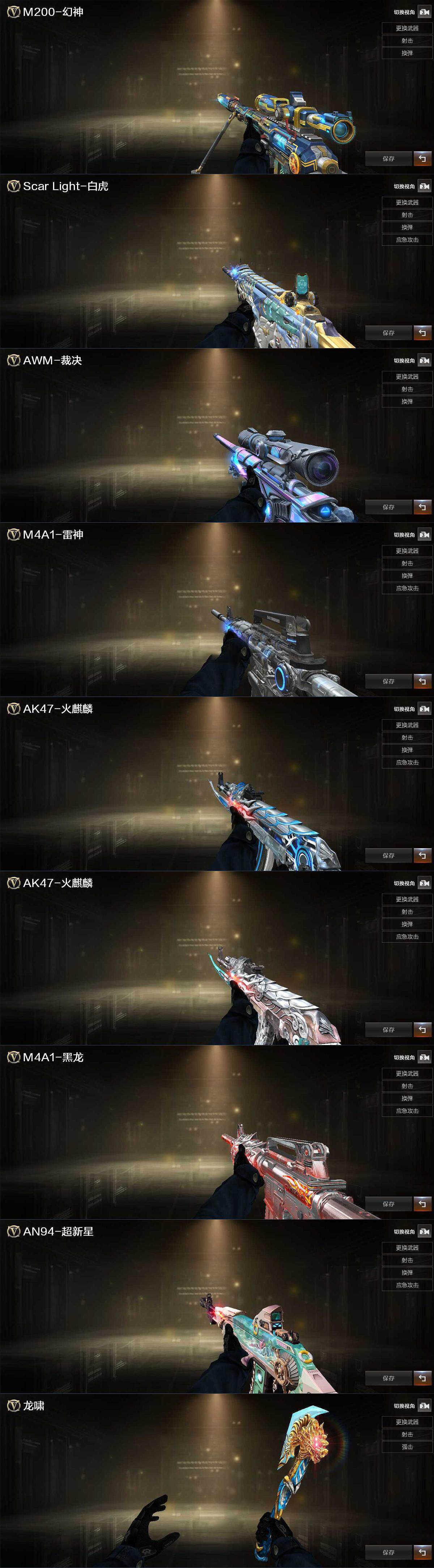 【英雄级武器】:AK47-火麒麟,M4A1-黑龙*2,M4A1-雷神*3,M4A1-黑骑士,M4A1-死神,AK47-黑武士,AK12-天启,AN94-超新星*2,M4A1-武圣*2,AK47-黑鲨,M4A1-龙血,HK417-朱雀,Scar Light-白虎,M14EBR-玄武,G36C-幻影,超新星-热带奇洋,M4A1-玫瑰精灵*2,QBZ03-金色蔷薇,王者之魄-觉醒版,AWM-天龙,Barrett-毁灭*3,AWM-裁决,M200-幻神,Kar98K-星神,王者之光-觉醒版*2,RPK-盘龙*3,加特林-炼狱*3,炼狱-悦蓝-觉醒版,汤姆逊-烈龙*3,AA-12-雷霆,王者之霆-觉醒版,沙鹰-修罗*2,沙鹰-天神*4,Glock18-武圣,屠龙*3,龙啸,马来剑-夜魔,擎天*2,麒麟刺*3,龙啸-热带奇洋,斩神刀-雷暴,王者之锋-觉醒版,高爆手雷-雷暴,高爆手雷-夜魔,手雷-热带奇洋,闪光弹-雷暴,闪光弹-夜魔,烟雾弹-雷暴,烟雾弹-夜魔
