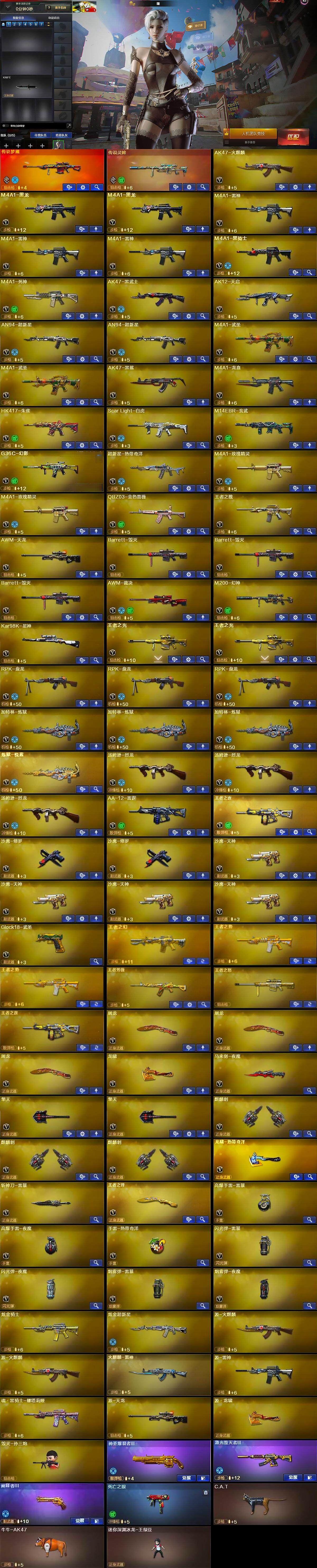 【热门武器】:传说梦魇,传说灵眸,G36C-幻影,QBZ03-金色蔷薇,M14EBR-玄武,Scar Light-白虎,HK417-朱雀,M200-幻神,死亡之眼,Kar98K-星神,C.A.T,牛牛-AK47,M4A1-黑骑士,汤姆逊-烈龙*3,RPK-盘龙*3,加特林-炼狱*3,羊驼玩偶,毁灭-孙三炮,沙鹰-修罗*2
