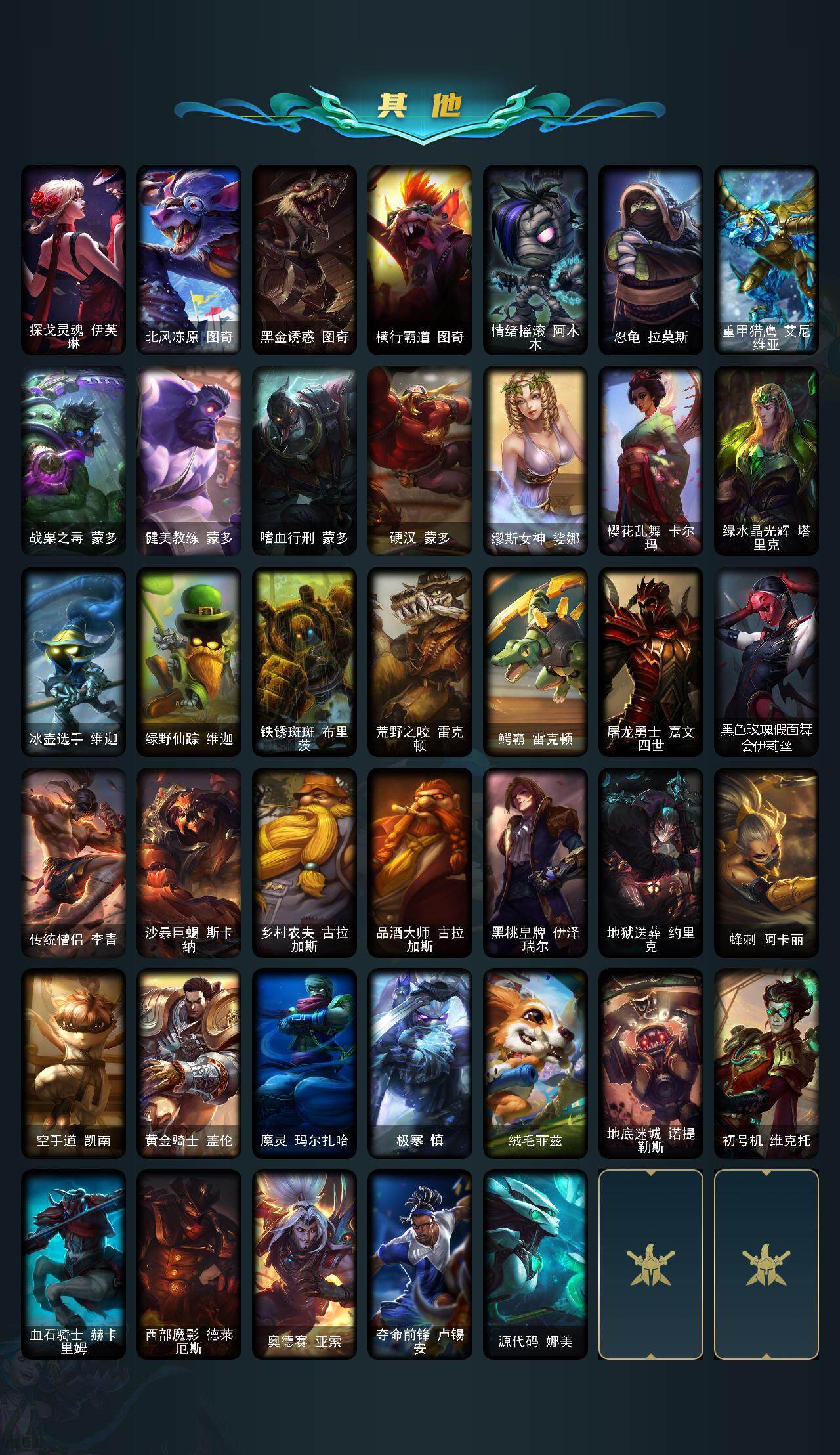 【其他皮肤1】:深渊巨蟹厄加特,电锯狂人厄加特,暗影易,斗牛士阿利斯塔,部落精神瑞兹,瑞兹白须,蕉泥座人索拉卡,约德尔海贼团崔丝塔娜,脏兮兮努努和威朗普,极地女神艾希,梦魇泰达米尔,嘻哈精神基兰,黑暗女王伊芙琳,假面女皇伊芙琳,探戈灵魂伊芙琳,北风冻原图奇,黑金诱惑图奇,横行霸道图奇,情绪摇滚阿木木,忍龟拉莫斯,重甲猎鹰艾尼维亚,战栗之毒蒙多,健美教练蒙多,嗜血行刑蒙多,硬汉蒙多,缪斯女神娑娜,樱花乱舞卡尔玛,绿水晶光辉塔里克,冰壶选手维迦,绿野仙踪维迦,铁锈斑斑布里茨,荒野之咬雷克顿,鳄霸雷克顿,屠龙勇士嘉文四世,黑色玫瑰假面舞会伊莉丝,传统僧侣李青,沙暴巨蝎斯卡纳,乡村农夫古拉加斯,品酒大师古拉加斯,黑桃皇牌伊泽瑞尔,地狱送葬约里克,蜂刺阿卡丽,空手道凯南,黄金骑士盖伦,魔灵玛尔扎哈,极寒慎,绒毛菲兹,地底迷城诺提勒斯,初号机维克托,血石骑士赫卡里姆,西部魔影德莱厄斯,奥德赛亚索,夺命前锋卢锡安,源代码娜美