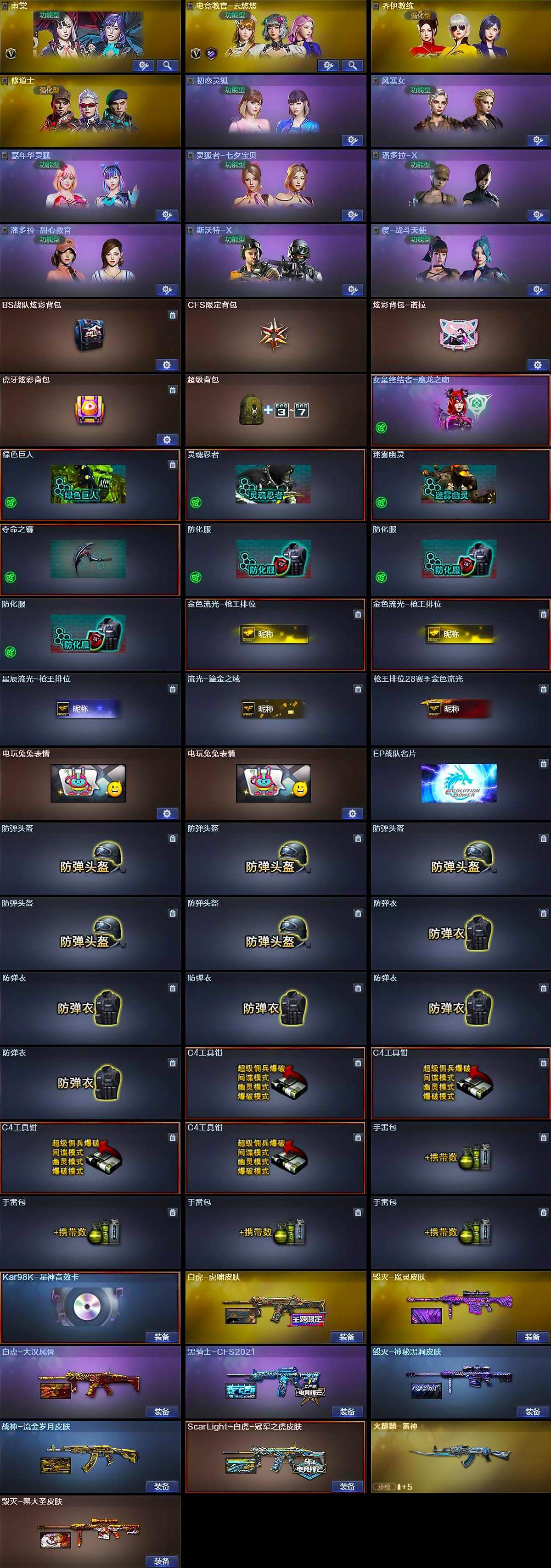 【道具】:BS战队炫彩背包,CFS限定背包,炫彩背包-诺拉,虎牙炫彩背包,超级背包,女皇终结者-魔龙之吻,绿色巨人,灵魂忍者,迷雾幽灵,夺命之镰,防化服*3,金色流光-枪王排位*2,星辰流光-枪王排位,流光-鎏金之域,枪王排位28赛季金色流光,电玩兔兔表情*2,EP战队名片,防弹头盔*5,防弹衣*5,C4工具钳*4,手雷包*4