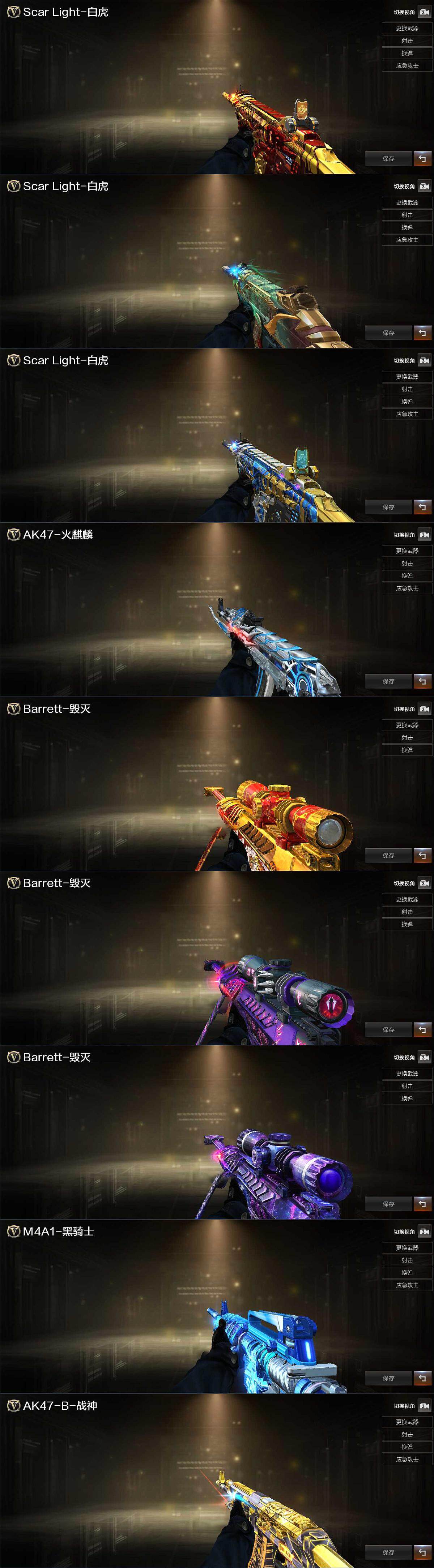 【热门武器】:M14EBR-玄武,Scar Light-白虎,HK417-朱雀,M4A1-青龙,M200-竞技荣光,白虎-电玩蓝兔,炼狱-迷你小钢,M4A1-黑骑士*2,USP-雷暴,沙鹰-修罗,黄金猫猫手套-白鲨