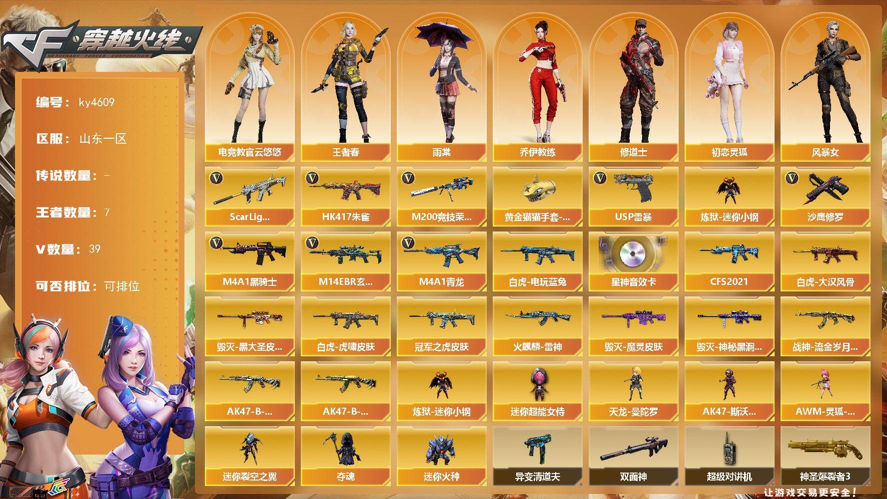 [15250195]山东一区-39V-7王者-0炫金 【热门武器】:M14EBR-玄武,Scar Light-白虎,HK417-朱雀,M4A1-青龙,M200-竞技荣光,白虎-电玩蓝兔,炼狱-迷你小钢,M4A1-黑骑士*2,USP-雷暴,沙鹰-修罗,黄金猫猫手套-白鲨 【音效卡】:Kar98K-星神音效卡 【皮肤】:白虎-大汉风骨,白虎-虎啸皮肤,ScarLight-白虎-冠军之虎皮肤,火麒麟-雷神,毁灭-黑大圣皮肤,毁灭-魔灵皮肤,毁灭-神秘黑洞皮肤,黑骑士-CFS2021,战神-流金岁月皮肤,AK47-B-常胜将军-刘备*2,AK47-B-常胜将军-孙权 【角色】:雨棠,电竞教官-云悠悠,王者春,乔伊教练,修道士,初恋灵狐,风暴女,嘉年华灵狐,灵狐者-七夕宝贝,潘多拉-X,潘多拉-甜心教官,斯沃特-X,兔囡囡,樱-战斗天使 【人偶武器】:天龙-曼陀罗,炼狱-迷你小钢,AWM-灵狐-15周年嘉年华,迷你裂空之翼*2,夺魂,迷你火种,AK47-斯沃特,迷你超能女侍 【暴走生化】:异变清道夫,双面神,超级对讲机 【挑战大师】:神圣爆裂者III,冰龙粉碎者-白马银枪*2,激光毁灭者III-白马银枪,VEPR-12-金魔,激光毁灭者III,试炼破坏者III,神圣爆裂者-末日III 【英雄级武器】:M4A1-黑骑士*2,AK47-黑武士,M4A1-龙血,M4A1-青龙,HK417-朱雀,Scar Light-白虎,M14EBR-玄武,无影-神兵利器,AK-47-猩红传说*2,王者冰魄-觉醒版,AK47-B-常胜将军,王者白虎-觉醒版,白虎-电玩蓝兔,王者芳薇-觉醒版,AWM-天龙,Barrett-朱雀,M200-竞技荣光,Barrett-金色蔷薇,王者之怒-觉醒版,沙鹰-修罗,USP-雷暴,柯尔特-竞技荣光,王者之魂-觉醒版,麒麟刺,擎天-竞技荣光*2,王者之啸-觉醒版*2,高爆手雷-竞技荣光*3,闪光弹-竞技荣光*2,烟雾弹-竞技荣光*2 【道具】:BS战队炫彩背包,CFS限定背包,炫彩背包-诺拉,虎牙炫彩背包,超级背包,女皇终结者-魔龙之吻,绿色巨人,灵魂忍者,迷雾幽灵,夺命之镰,防化服*3,金色流光-枪王排位*2,星辰流光-枪王排位,流光-鎏金之域,枪王排位28赛季金色流光,电玩兔兔表情*2,EP战队名片,防弹头盔*5,防弹衣*5,C4工具钳*4,手雷包*4 【特殊枪械】:1白虎,2黑