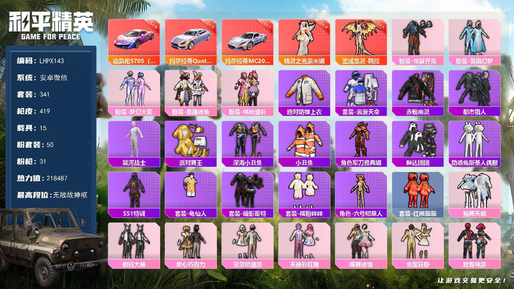 [15186506]【特价出售/店主推荐】安卓 微信-无敌战神框-2神装-50粉装-31特效枪-15载具-15粉色飞行器-218487热力值-32王牌印记-341套装-419枪皮