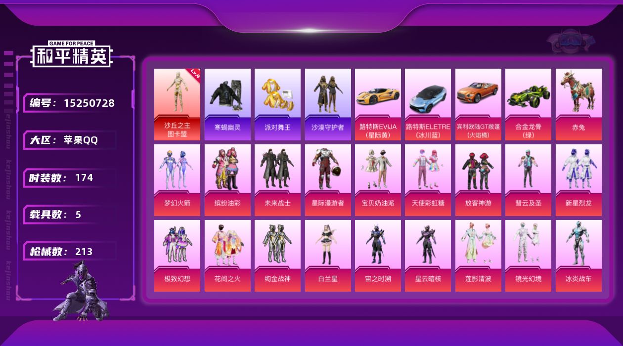 [15250728]素材身法号/沙丘之主-图卡盟(四级) 苹果 手Q-1神装-20粉装-9特效枪-5载具-4粉色飞行器-8.3w热力值-13王牌印记-174套装-213枪皮【红色神装等级】:沙丘之主-图卡盟(四级)【热门品类】:粉装-梦幻火箭,粉装-缤纷油彩,套装-寒蝎幽灵,套装-浪漫天命,套装-派对舞王,角色-军刀雅典娜,套装-金羽特工,套装-沙漠守护者,角色-忠猛周仓,套装-龟仙人,套装-暗影哥特,熔岩游骑兵面罩,大砍刀-青龙偃月刀,撬棍-龙胆亮银枪,熔岩游骑兵连帽夹克【粉色载具】:路特斯EVIJA(星际黄),路特斯ELETRE(冰川蓝),宾利欧陆GT敞篷(火焰橘),合金龙骨(绿),赤兔【粉色套装】:粉装-未来战士,粉装-星际漫游者,粉装-宝贝奶油派,粉装-天使彩虹糖,粉装-梦幻火箭,粉装-缤纷油彩,粉装-放客神游,粉装-彗云及圣,粉装-新星烈龙,粉装-极致幻想,粉装-花间之火,粉装-绚金战神,角色-白兰星,角色-宙之时溯,角色-星云暗核,粉装-莲影清波,粉装-镜光幻境,角色-冰炎战车,角色-紫钛骑兵,角色-圣堂之誓【粉色枪皮等级】:AKM-熔岩统帅(三级),SCAR-L-纯梦嫁纱(六级),M416-心之恋语(五级),M416-风花雪月(二级),P90-沙丘之主(三级),Kar98K-巳巳如意(五级),AWM-花间之火(五级),AWM-橘柚倾心(一级),DP-28-豹影疾电(一级)【粉色飞行器】:梦幻火箭飞行器,齐天大圣飞行器,镜光幻境飞行翼,沙丘之主天马