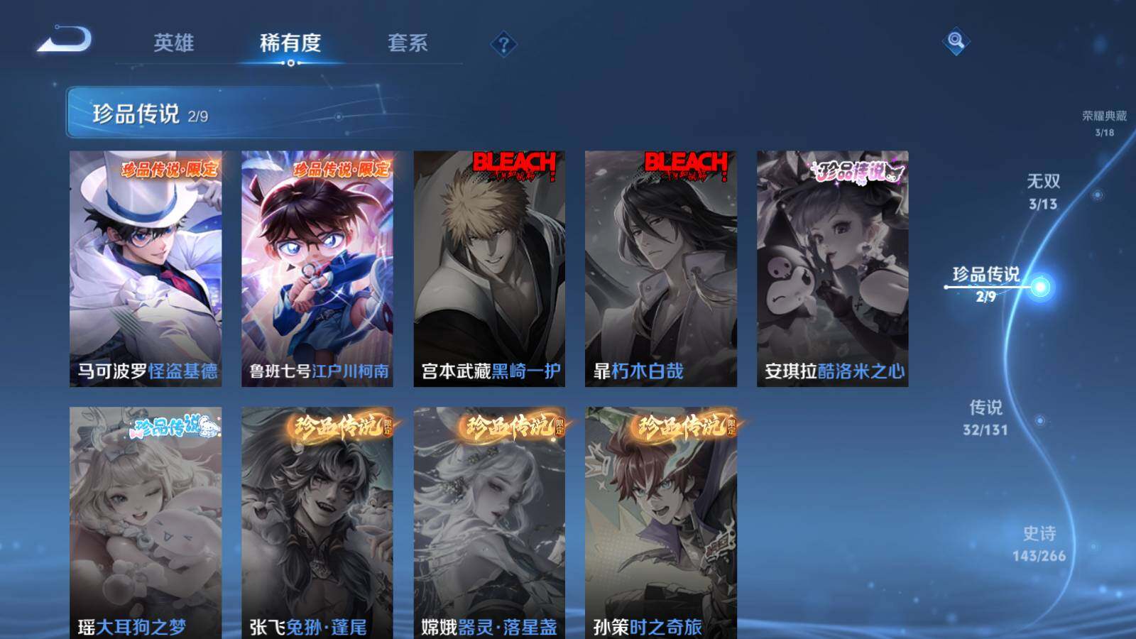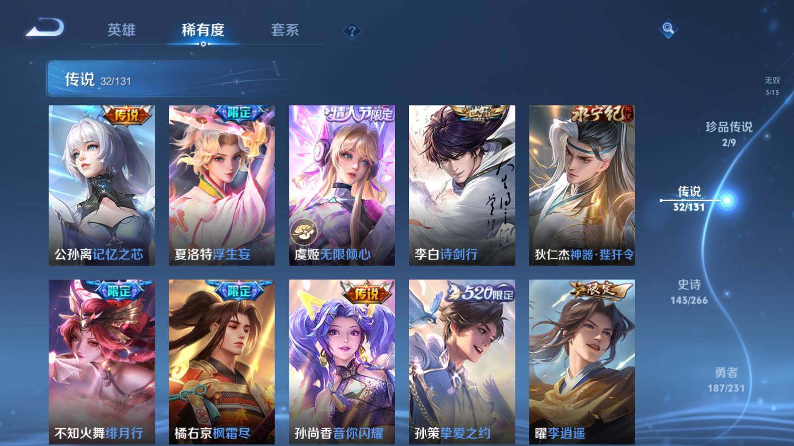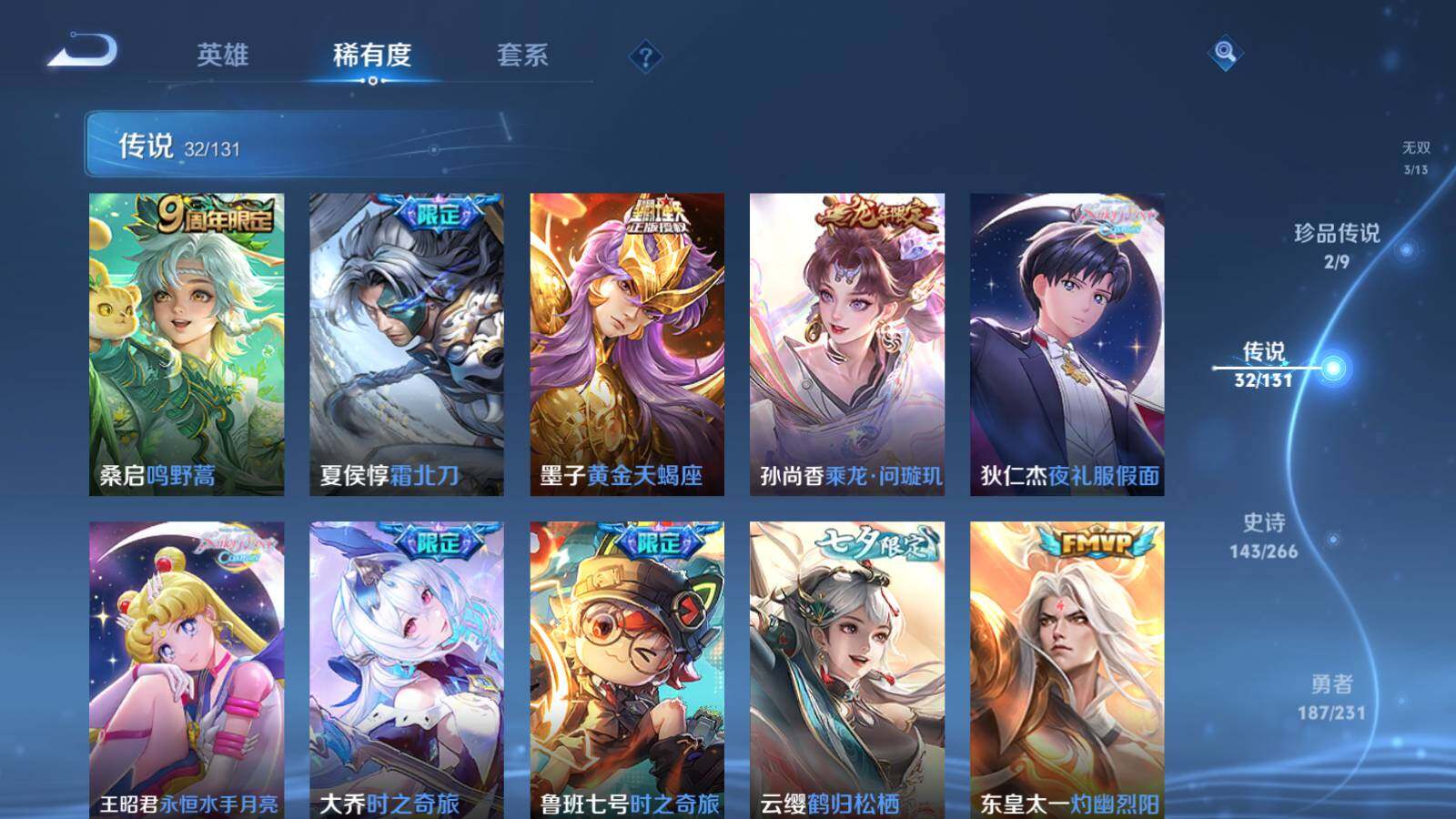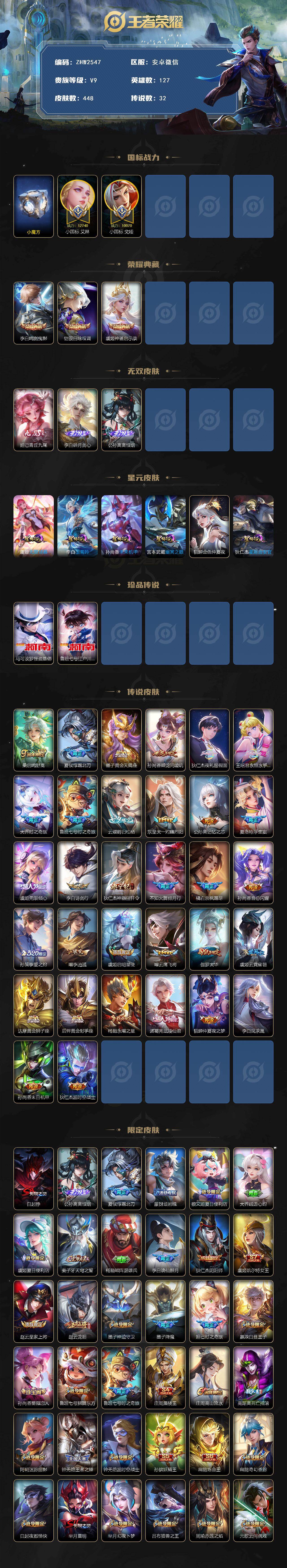 - [11232906]无双贵族 6典藏 1珍品无双 3无双 7珍品传说 66传说 124英雄 418皮肤 可修改实名 连体和平 优质装备:馥梦繁花,无限飓风号(高达),大秦宣太后,鸣剑·曳影,星域神启(倪克斯贼亮),银白咏叹调(倪克斯侍卫),韩信群星魔术团(韩信无双),器灵·螭龙剑,最初的交响(伽罗典藏),天机白泽,器灵·落星盏,酷洛米之心,大耳狗之梦,朽木白哉,黑崎一护,黄金狮子座,黄金射手座,冠军飞将,云鹰飞将(小将军),绛天战甲(鸡嘴战神),黄金白羊座,猫影幻舞,久胜战神,炽阳神光,一念神魔,云霓雀翎,末日机甲-孙尚香(绿蚂蚱),地狱火,仲夏夜之梦(大飞蛾),音你心动-小乔,海洋之心,地狱之眼,飞鸢探春,音你心动-周瑜,胖达荣荣,乞巧织情,时之恋人-刘备(电焊工),游龙清影(小青龙),淬星耀世,超时空战士-狄仁杰,末日机甲-孙策,花朝如约(花篮子),无双飞将,音你闪耀(rap皮),碎云,山海·炽霜斩(李信年限),记忆之芯(机甲兔),电玩·雷克斯,鹤羽星尊,灼幽烈阳,妄想实况,惊梅引,小动物乐团,霜月吟,澜逐花归海,艾琳觅芳踪,牧神诗旅,千劫归真 珍品传说:时之奇旅-孙策,兔狲·蓬尾 传说皮:典韦战鼓燎原,落雪白狼,死亡执政官,九山相柳,云诺千山,星之鸣奏,祥瑞亨通,幻光神枪 珍宝阁皮:万物之道,优雅恋人,玩趣恶龙 限定皮:愿照·九州拓(澜年限),愿照·福禄聚(蔡文姬年限),愿照·岁时盈(虞姬年限),愿照·山河定(司空震年限),愿照·众生和(妲己年限),愿照·千秋盛(女娲年限),鸣野蒿,寅虎·展翼(孙膑年限),白鹤梁神女,至美·乘鲤谣,至美·化雀舞,遇见飞天,高山流水,诗剑行,怒海麟威,降魔,五谷丰年,天狼运算者,天狼溯光者,祈雪灵祝(雪兔子),李小龙,永曜之星,辉光之辰,猪悟能,大圣娶亲,青春决赛季,寅虎·御盾(廉颇年限),寅虎·瑞焰(虎皮蛋子),寅虎·心曲(虎婆),寅虎·赤拳(老虎年限),百木心枪,时之奇旅-妲己,神器·万象笔,山海·玄木吟(马可年限),冰霜神祇 史诗皮:赞萌露比,鸭鸭历险记-刘禅,飞车小橘子,苍鳞隐世,器灵·浮梦炉,糖绘人间,狼魂孤将,绮世丹青,瑰影绮梦,化蝶舞,星界特工,灵蛊蚀心,龙之律动,雪豹·霜爪,藏狐·褐绒,布丁狗之誓,小牛鸭,石田雨龙,百相守梦-周瑜,戍鼓铭心,茶境仙,幻珠鲛人,怒海争锋,夜落电台,蔬乡物语(鲁班七号),琥珀纪元伽罗,守夜人