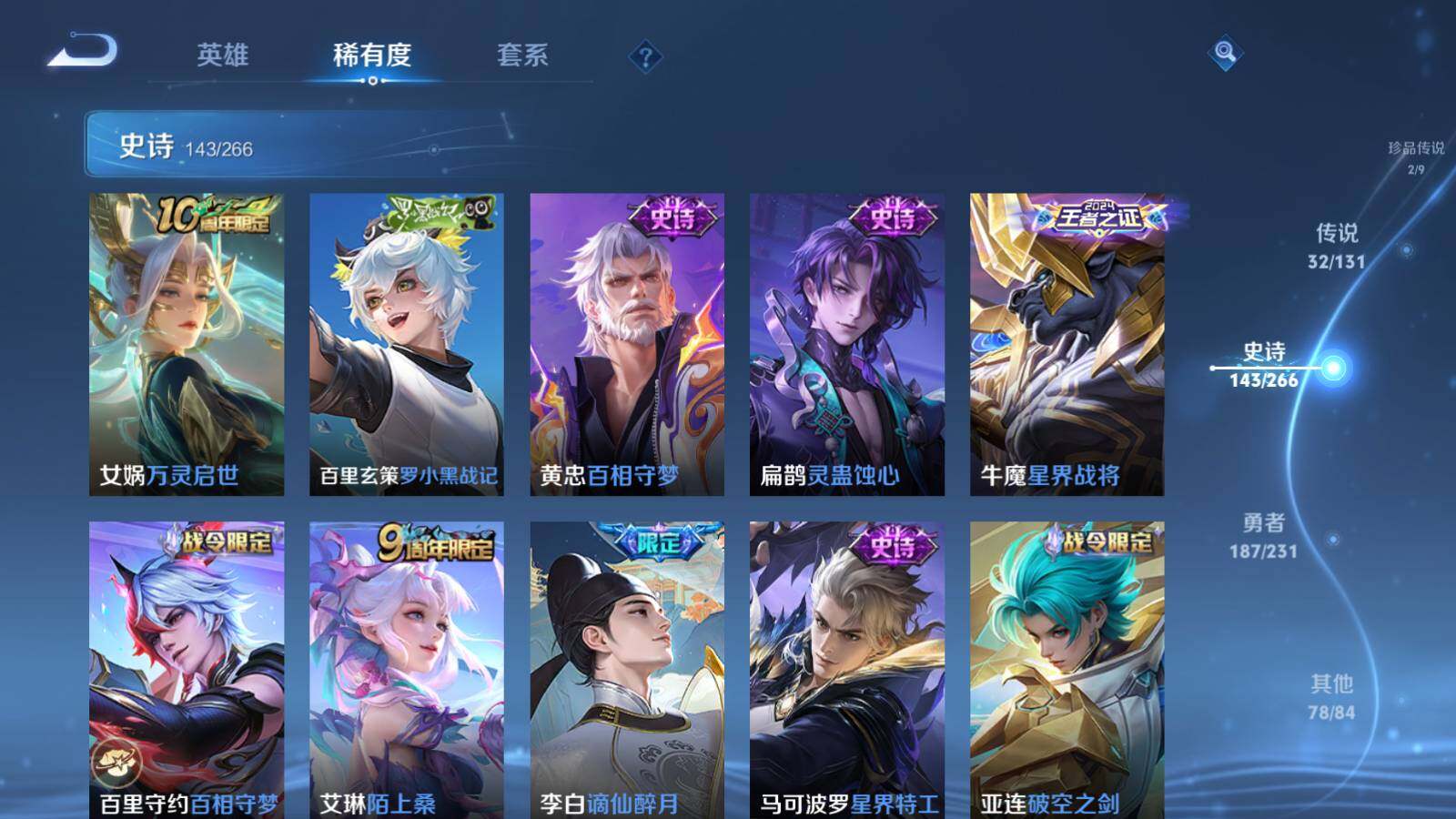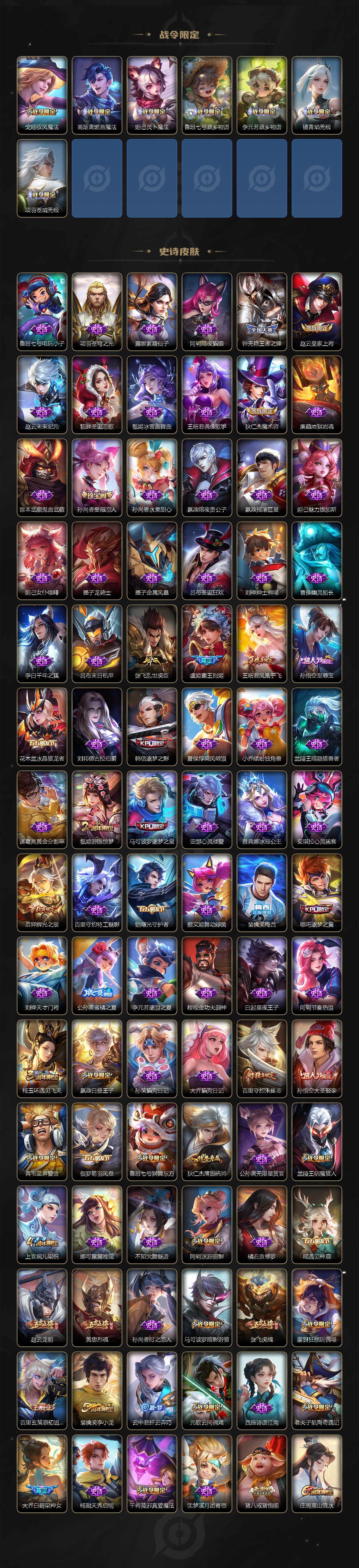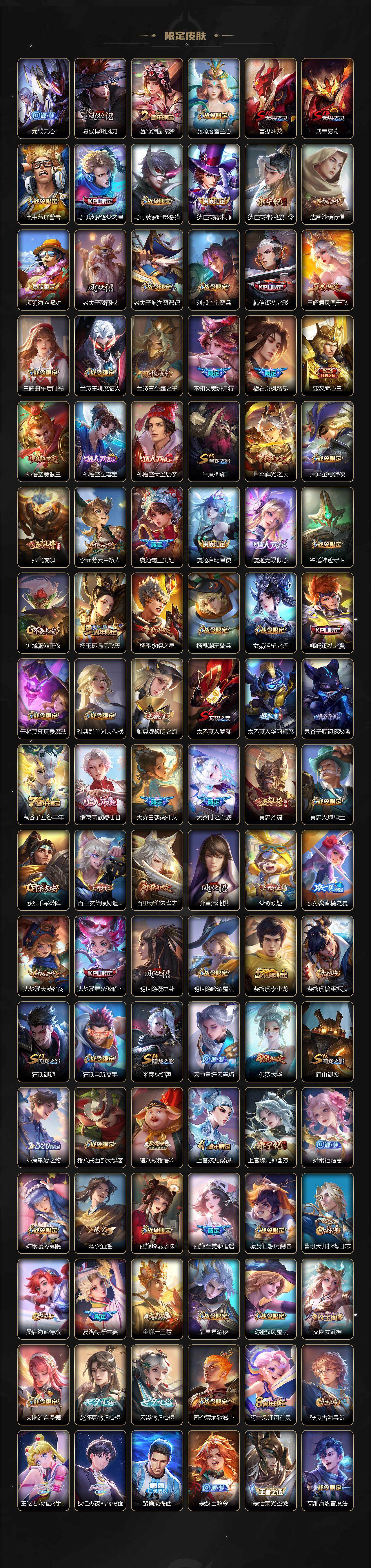 【限定皮肤】:白起狰,公孙离离恨烟,夏侯惇霜北刀,蒙犽顽岩魄,蔡文姬夏日便利店,大乔绒语心约,虞姬夏日便利店,姜子牙天穹之誓,杨戬破阵退雄兵,李白谪仙醉月,狄仁杰阴阳师,虞姬凯尔特女王,赵云皇家上将,赵云龙胆,墨子神迹守卫,墨子降魔,妲己时之奇旅,嬴政白昼王子,孙尚香蔷薇恋人,鲁班七号狮舞东方,鲁班七号时之奇旅,庄周蜃楼王,庄周高山流水,高渐离死亡摇滚,阿轲迷踪丽影,钟无艳王者之锤,钟无艳超时空战士,孙膑妖精王,扁鹊炼金王,扁鹊奇幻香踪,白起夜都怪侠,芈月重明,芈月幻夜卜梦,吕布猎兽之王,周瑜赤莲之焰,元歌云间偶戏,元歌无心,夏侯惇朔风刀,甄姬游园惊梦,甄姬落雪兰心,曹操烛龙,典韦穷奇,典韦蓝屏警告,马可波罗逐梦之星,马可波罗暗影游猎,狄仁杰魔术师,狄仁杰神器狴犴令,达摩沙漠行僧,项羽海滩派对,老夫子醍醐杖,老夫子航海奇遇记,刘邦夺宝奇兵,韩信逐梦之影,王昭君凤凰于飞,王昭君午后时光,兰陵王驯魔猎人,兰陵王金庭之子,不知火舞绯月行,橘右京枫霜尽,亚瑟狮心王,孙悟空美猴王,孙悟空至尊宝,孙悟空大圣娶亲,牛魔御旌,后羿辉光之辰,后羿圣弓游侠,张飞虎魄,李元芳云中旅人,虞姬霸王别姬,虞姬启明星使,虞姬无