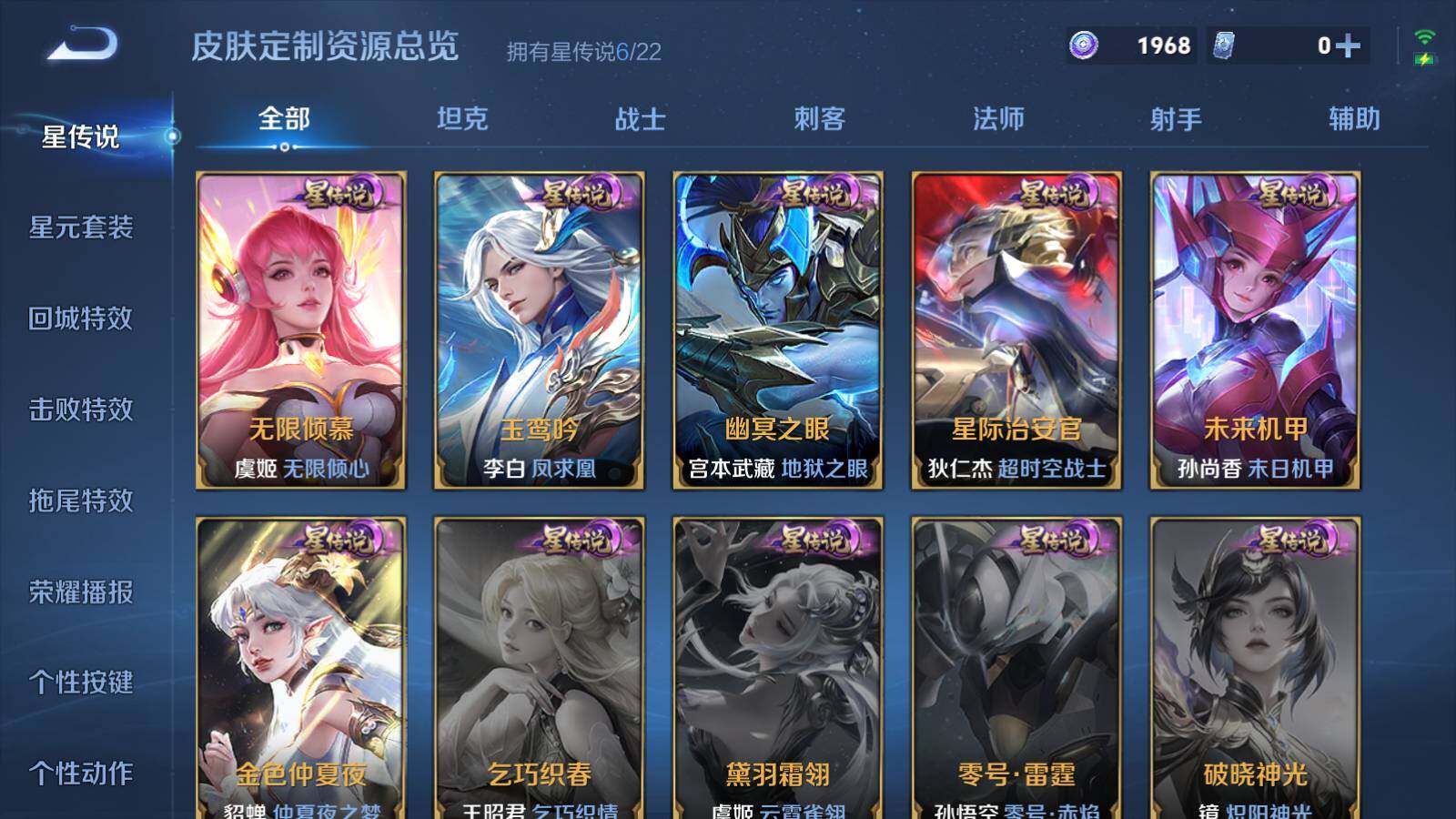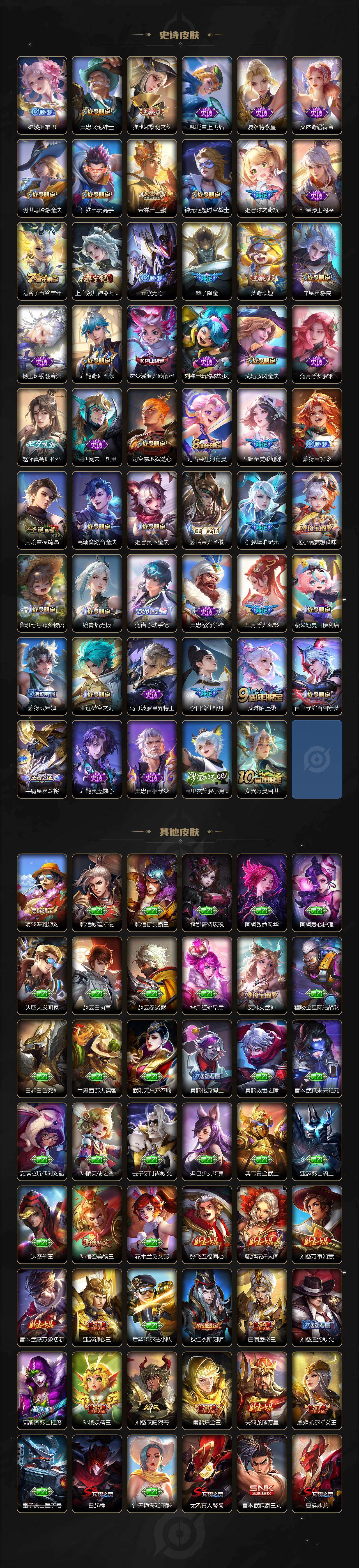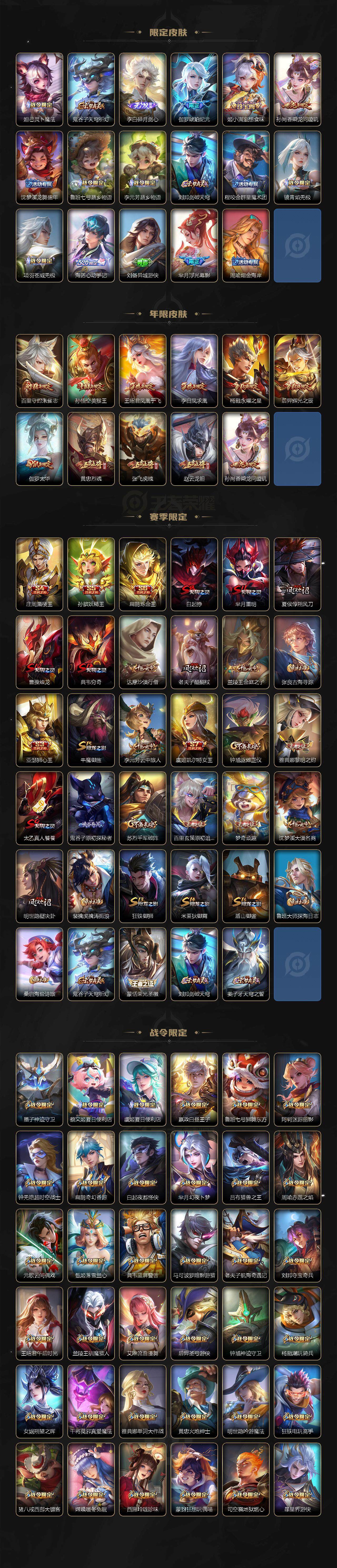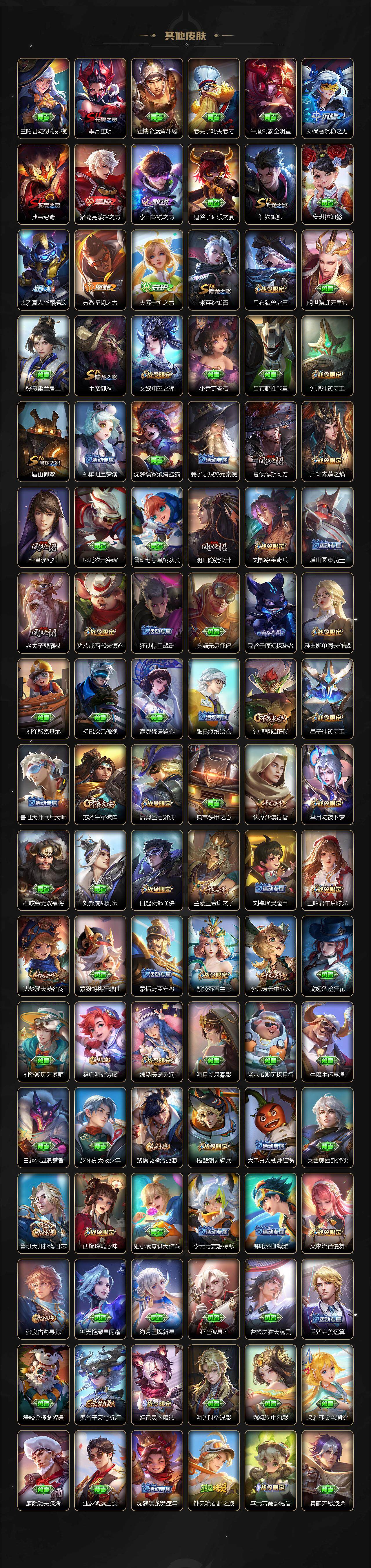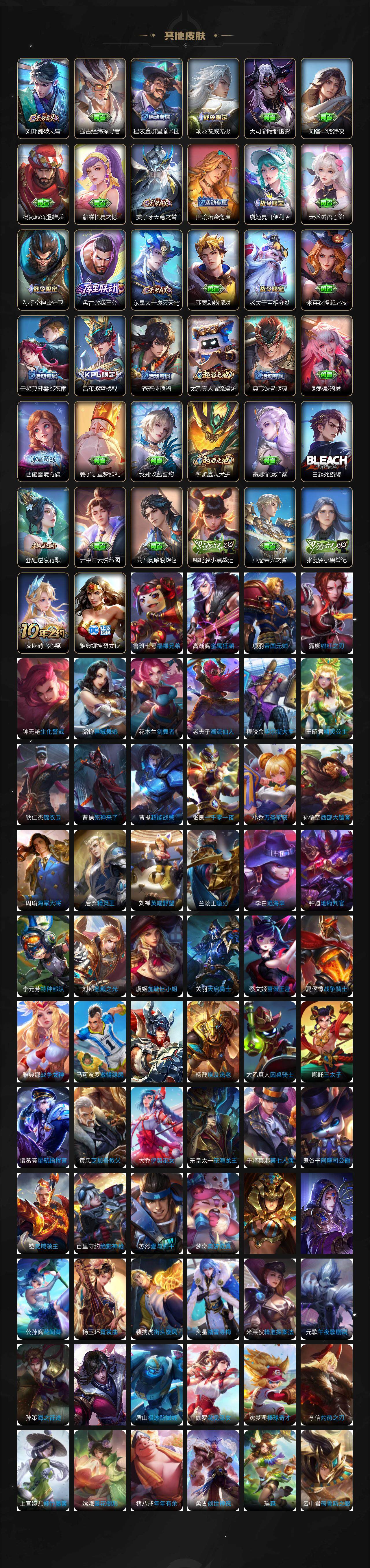 瑶遇见神鹿,娜可露露晚萤,伽罗箭羽风息,李元芳逐浪之夏,不知火舞魅语,公孙离无限星赏官,大乔猫狗日记,孙策猫狗日记,阿轲节奏热浪,露娜紫霞仙子,诸葛亮黄金分割率,王昭君偶像歌手,项羽苍穹之光,孙尚香时之恋人,阿轲暗夜猫娘,雅典娜冰冠公主,吕布末日机甲,鲁班七号电玩小子,橘右京修罗,墨子龙骑士,嬴政摇滚巨星,刘禅绅士熊喵,刘禅天才门将,白起星夜王子,安琪拉心灵骇客,程咬金功夫厨神,刘邦德古拉伯爵,兰陵王暗隐猎兽者,曹操幽灵船长,宫本武藏鬼剑武藏,亚瑟心灵战警,杨戬天秀·启明,蔡文姬舞动绿茵,廉颇地狱岩魂,西施诗语江南,小乔缤纷独角兽,夏侯惇乘风破浪,花木兰水晶猎龙者,铠曙光守护者,墨子金属风暴,百里玄策原初追逐者,吕布圣诞狂欢,貂蝉圣诞恋歌,百里守约特工魅影,嬴政暗夜贵公子,嫦娥拒霜思,雅典娜黎明之约,李白千年之狐,哪吒雪上飞焰,夏洛特永昼,艾琳奇遇舞章,弈星滕王阁序,杨玉环银翎春语,沈梦溪匿光破解者,刘禅电玩·爆裂旋风,海月浮梦罗烟,赵怀真鹤归松栖,莱西奥末日机甲,蒙犽百解令,周瑜雪夜绮愿,高渐离燃音魔法,伽罗琥珀纪元,海诺心动手记,李白谪仙醉月