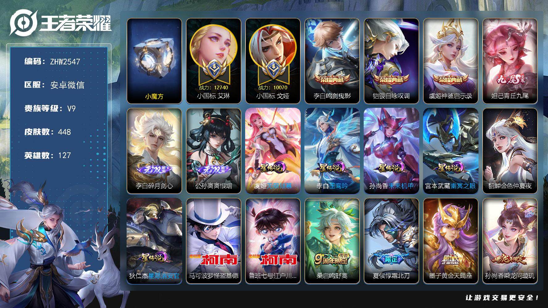 [15251075]安卓WX-发育路59段!小魔方!2小国!艾琳,戈娅!128037积分!V9-127英雄-448皮肤-3典藏皮肤-3无双-2珍品传说-32传说-142史诗-6星元 【英雄全皮】:墨子全皮,扁鹊全皮,李白全皮,刘邦全皮,橘右京全皮,哪吒全皮,太乙真人全皮,黄忠全皮,猪八戒全皮,夏洛特全皮,金蝉全皮,戈娅全皮,影全皮,海诺全皮 【荣耀典藏】:李白鸣剑曳影,铠银白咏叹调,虞姬神鉴启示录 【无双皮肤】:妲己青丘九尾,李白碎月剑心,公孙离离恨烟 【珍品传说】:马可波罗怪盗基德,鲁班七号江户川柯南 【传说皮肤】:桑启鸣野蒿,夏侯惇霜北刀,墨子黄金天蝎座,孙尚香乘龙问璇玑,狄仁杰夜礼服假面,王昭君永恒水手月亮,大乔时之奇旅,鲁班七号时之奇旅,云缨鹤归松栖,东皇太一灼幽烈阳,公孙离记忆之芯,夏洛特浮生妄,虞姬无限倾心,李白诗剑行,狄仁杰神器狴犴令,不知火舞绯月行,橘右京枫霜尽,孙尚香音你闪耀,孙策挚爱之约,曜李逍遥 ,虞姬启明星使,曜云鹰飞将,伽罗太华,虞姬云霓雀翎,达摩黄金狮子座,后羿黄金射手座,杨戬永曜之星,诸葛亮武陵仙君,貂蝉仲夏夜之梦,李白凤求凰,孙尚香末日机甲,狄仁杰超时空战士 【限定皮肤】:白起狰,公孙离离恨烟,夏侯惇霜北刀,蒙犽顽岩魄,蔡文姬夏日便利店,大乔绒语心约,虞姬夏日便利店,姜子牙天穹之誓,杨戬破阵退雄兵,李白谪仙醉月,狄仁杰阴阳师,虞姬凯尔特女王,赵云皇家上将,赵云龙胆,墨子神迹守卫,墨子降魔,妲己时之奇旅,嬴政白昼王子,孙尚香蔷薇恋人,鲁班七号狮舞东方,鲁班七号时之奇旅,庄周蜃楼王,庄周高山流水,高渐离死亡摇滚,阿轲迷踪丽影,钟无艳王者之锤,钟无艳超时空战士,孙膑妖精王,扁鹊炼金王,扁鹊奇幻香踪,白起夜都怪侠,芈月重明,芈月幻夜卜梦,吕布猎兽之王,周瑜赤莲之焰,元歌云间偶戏,元歌无心,夏侯惇朔风刀,甄姬游园惊梦,甄姬落雪兰心,曹操烛龙,典韦穷奇,典韦蓝屏警告,马可波罗逐梦之星,马可波罗暗影游猎,狄仁杰魔术师,狄仁杰神器狴犴令,达摩沙漠行僧,项羽海滩派对,老夫子醍醐杖,老夫子航海奇遇记,刘邦夺宝奇兵,韩信逐梦之影,王昭君凤凰于飞,王昭君午后时光,兰陵王驯魔猎人,兰陵王金庭之子,不知火舞绯月行,橘右京枫霜尽,亚瑟狮心王,孙悟空美猴王,孙悟空至尊宝,孙悟空大圣娶亲,牛魔御旌,后羿辉光之辰,后羿圣弓游侠,张飞虎魄,李元芳云中旅人,虞姬霸王别姬,虞姬启明星使,虞姬无