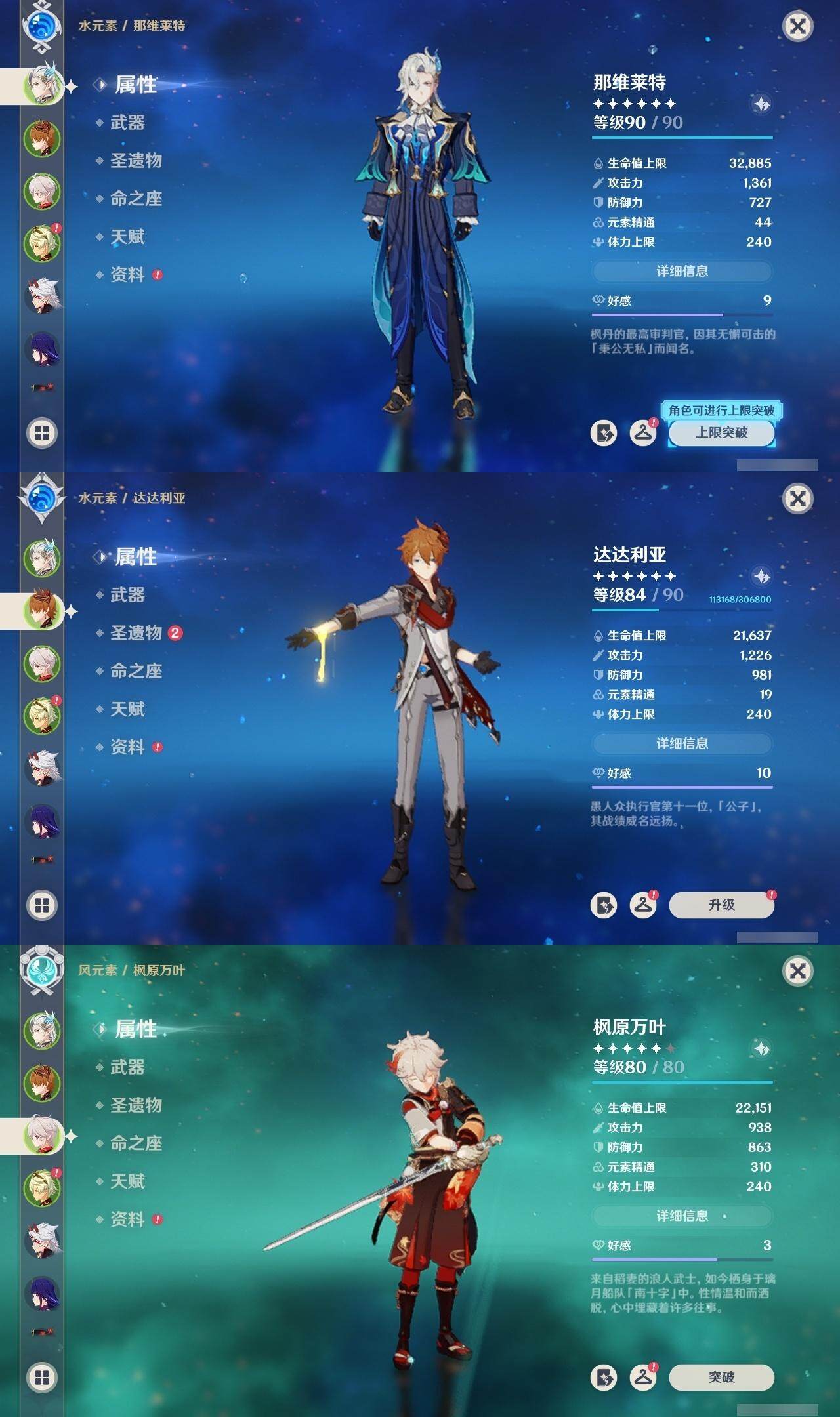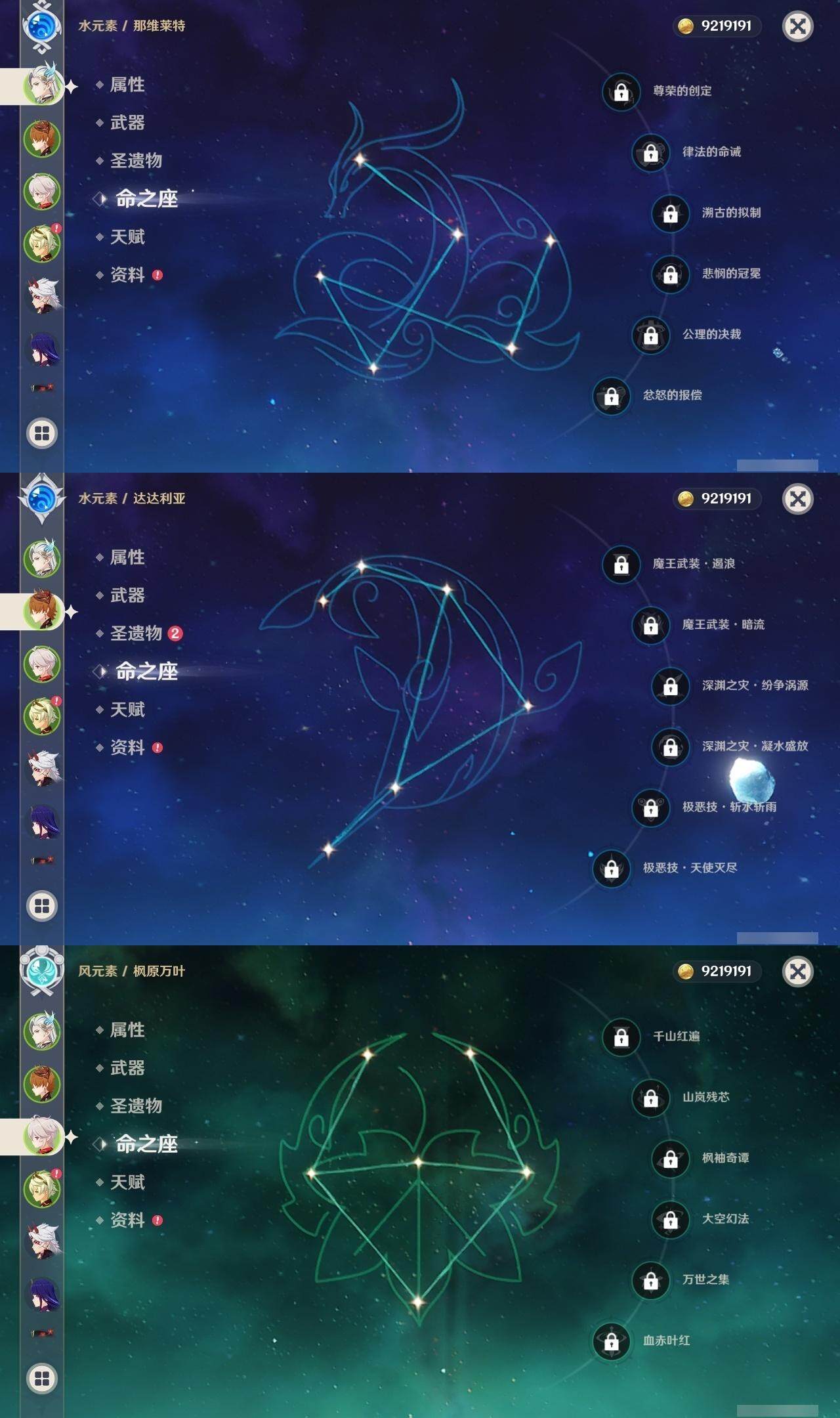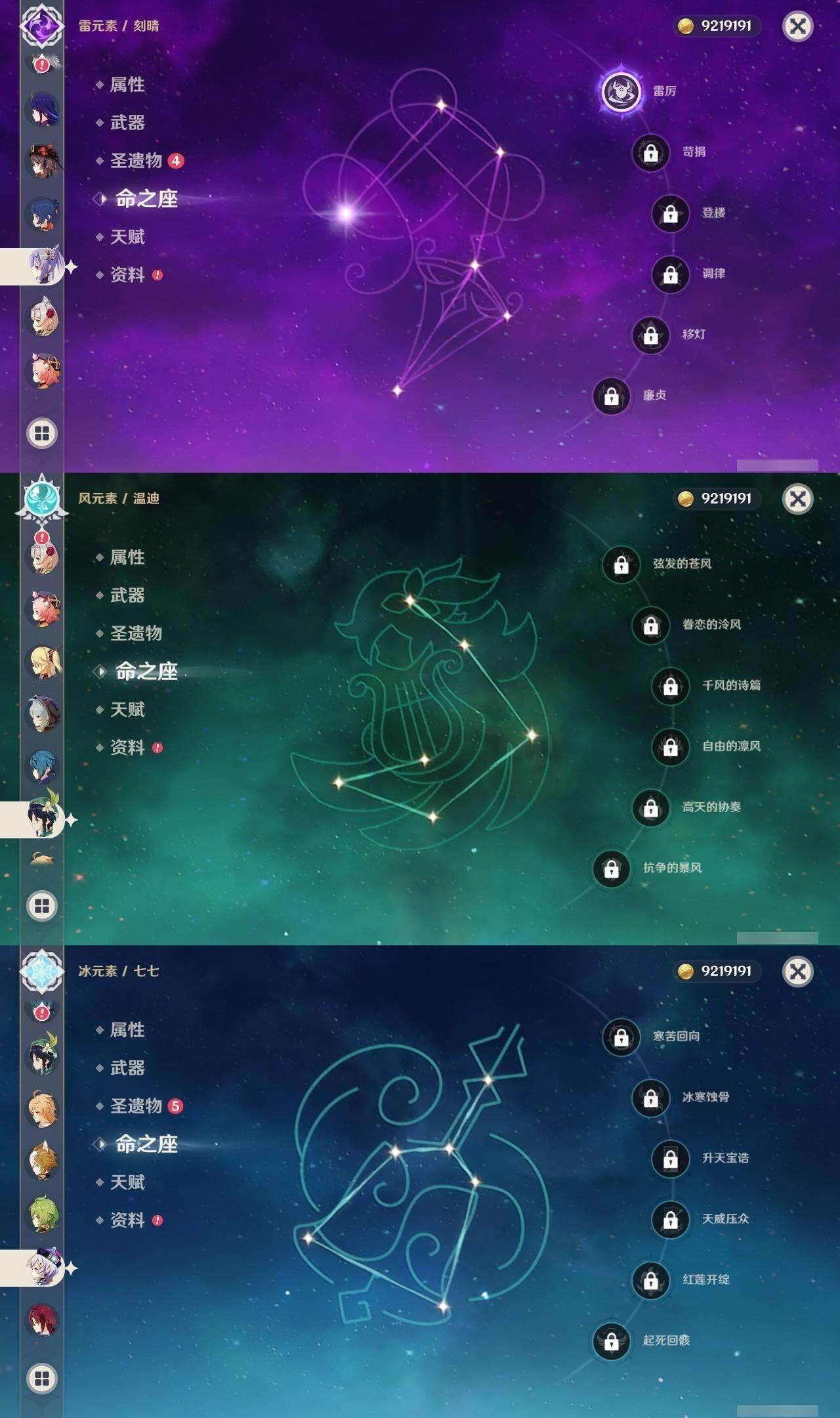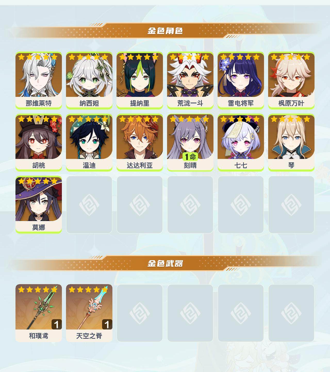 0命那维莱特,0命纳西妲,0命提纳里,0命荒泷一斗,0命雷电将军,0命枫原万叶,0命胡桃,0命温迪,0命达达利亚,1命刻晴,0命七七,0命琴,0命莫娜,精1和璞鸢,精1天空之脊
