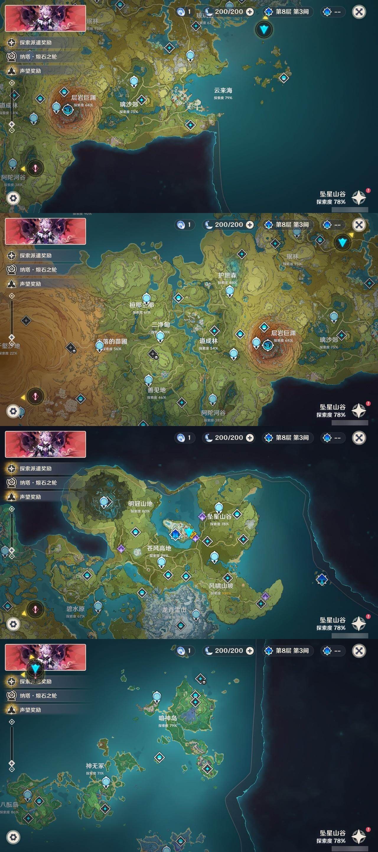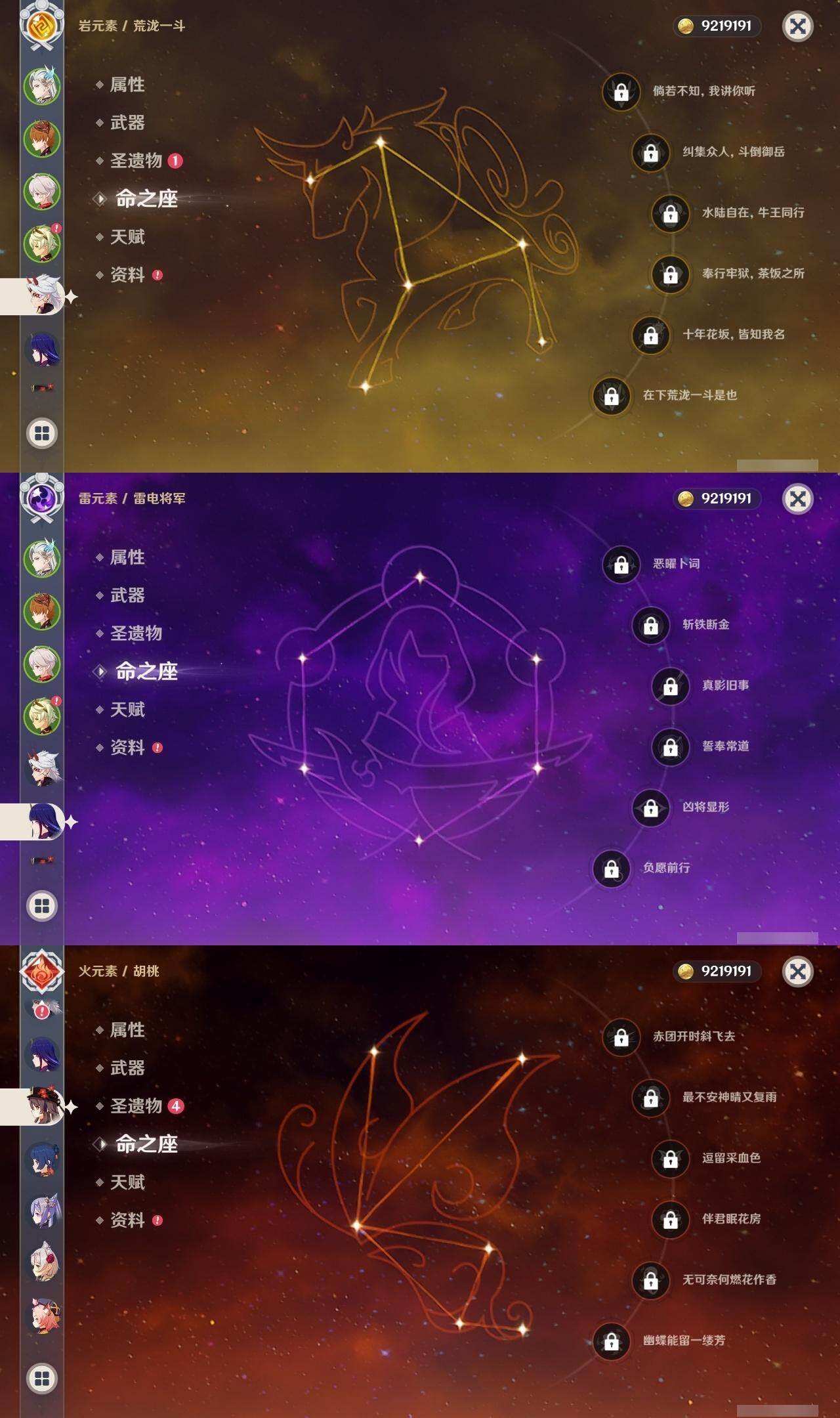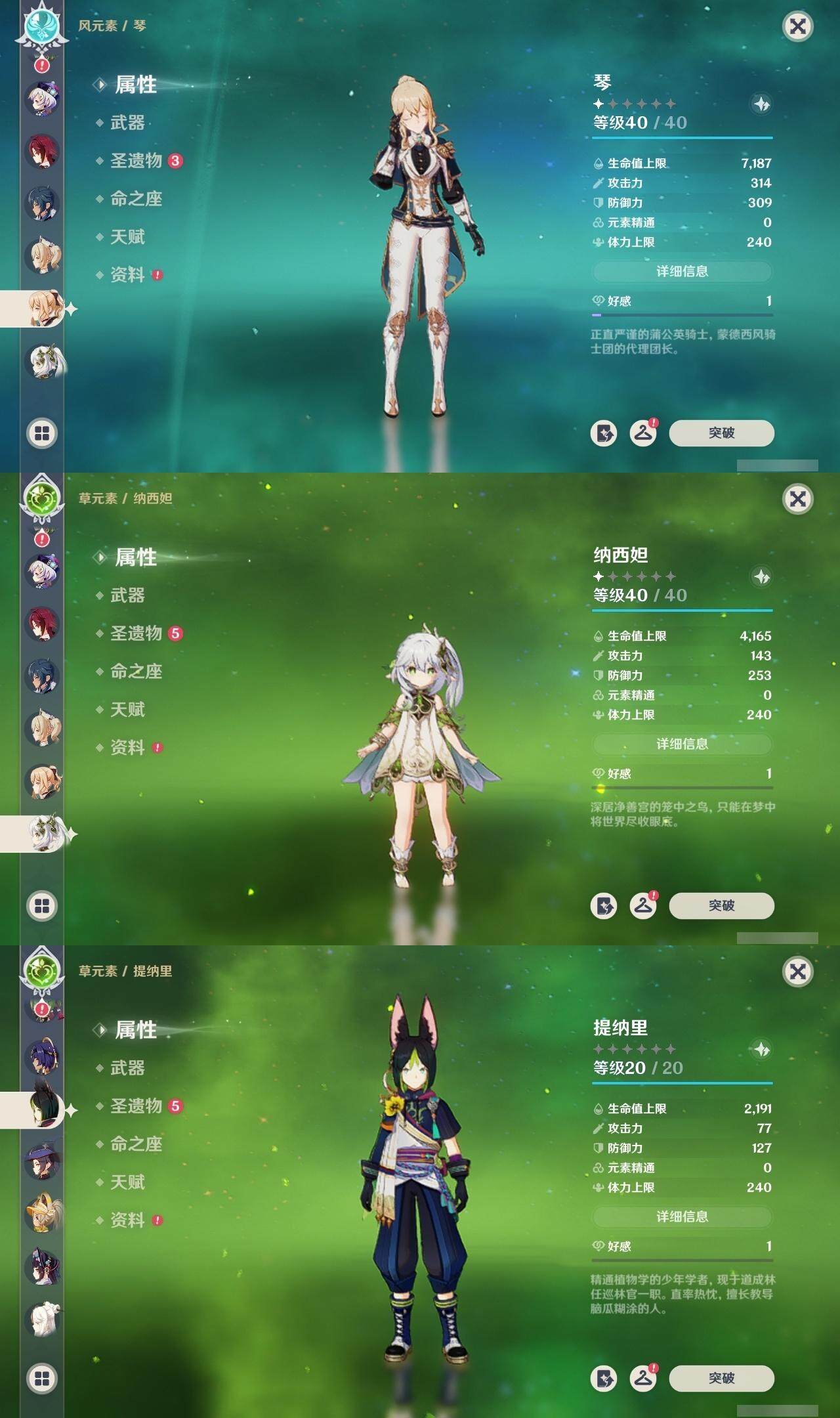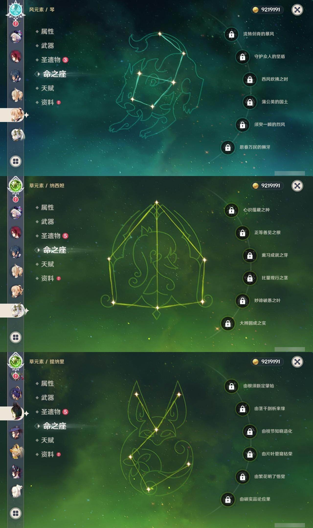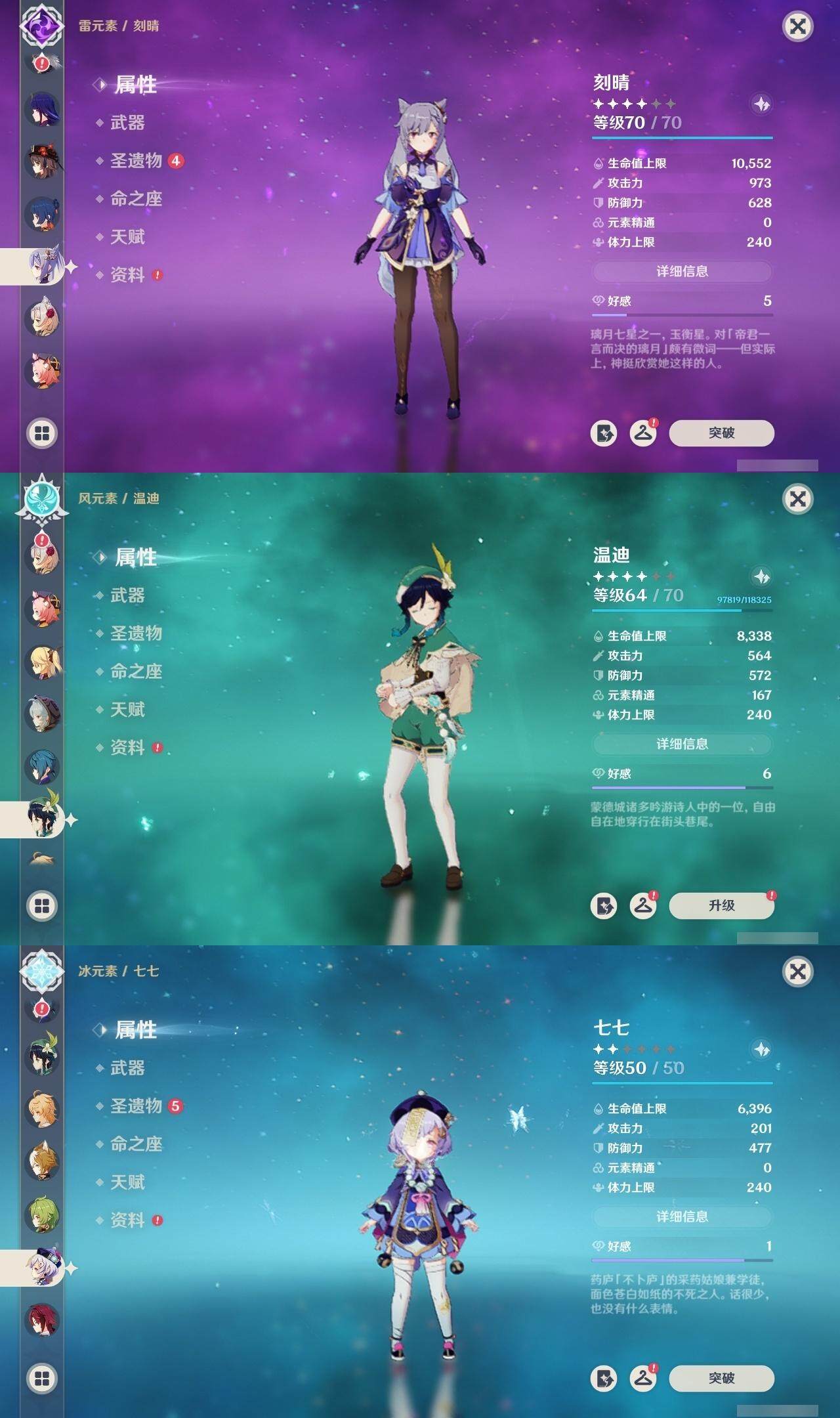 0命那维莱特,0命纳西妲,0命提纳里,0命荒泷一斗,0命雷电将军,0命枫原万叶,0命胡桃,0命温迪,0命达达利亚,1命刻晴,0命七七,0命琴,0命莫娜,精1和璞鸢,精1天空之脊
