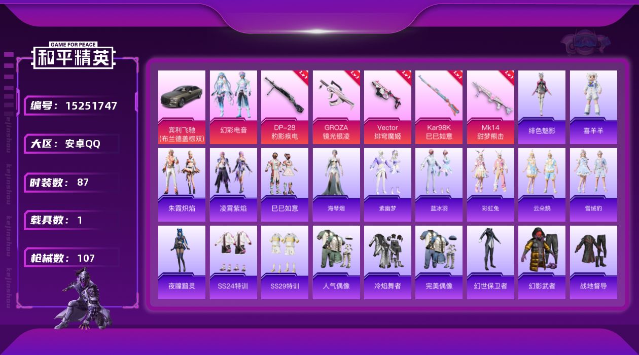 [15251747]安卓 手Q-1粉装-5特效枪-1载具-0粉色飞行器-29726热力值-6王牌印记-87套装-107枪皮【粉色载具】:宾利飞驰(布罗德盖棕双色)【粉色套装】:粉装-幻彩电音【粉色枪皮等级】:GROZA-镜光银凌(一级),Vector-绯穹魔姬(一级),Kar98K-巳巳如意(一级),Mk14-甜梦熊击(一级),DP-28-豹影疾电(一级)【粉色枪皮】:GROZA-镜光银凌,Vector-绯穹魔姬,Kar98K-巳巳如意,Mk14-甜梦熊击,DP-28-豹影疾电