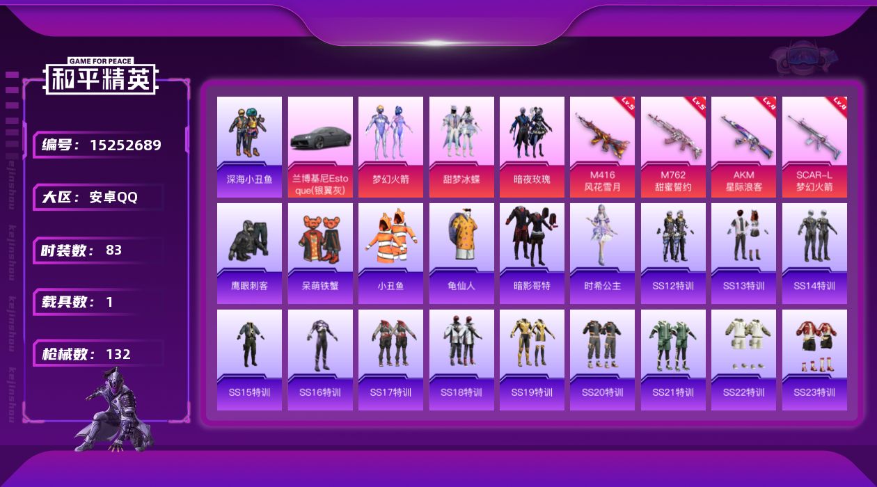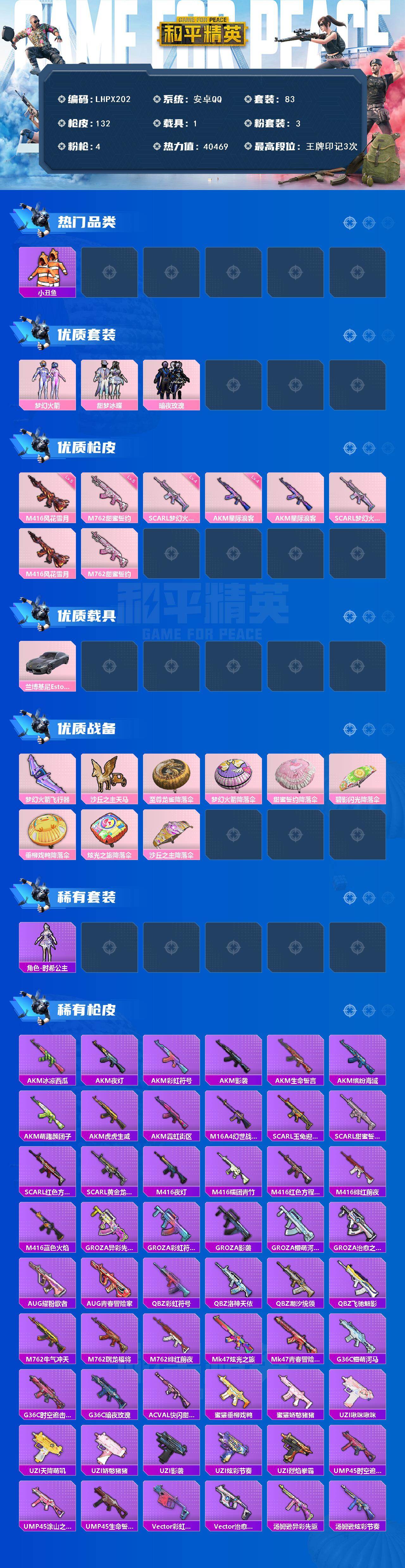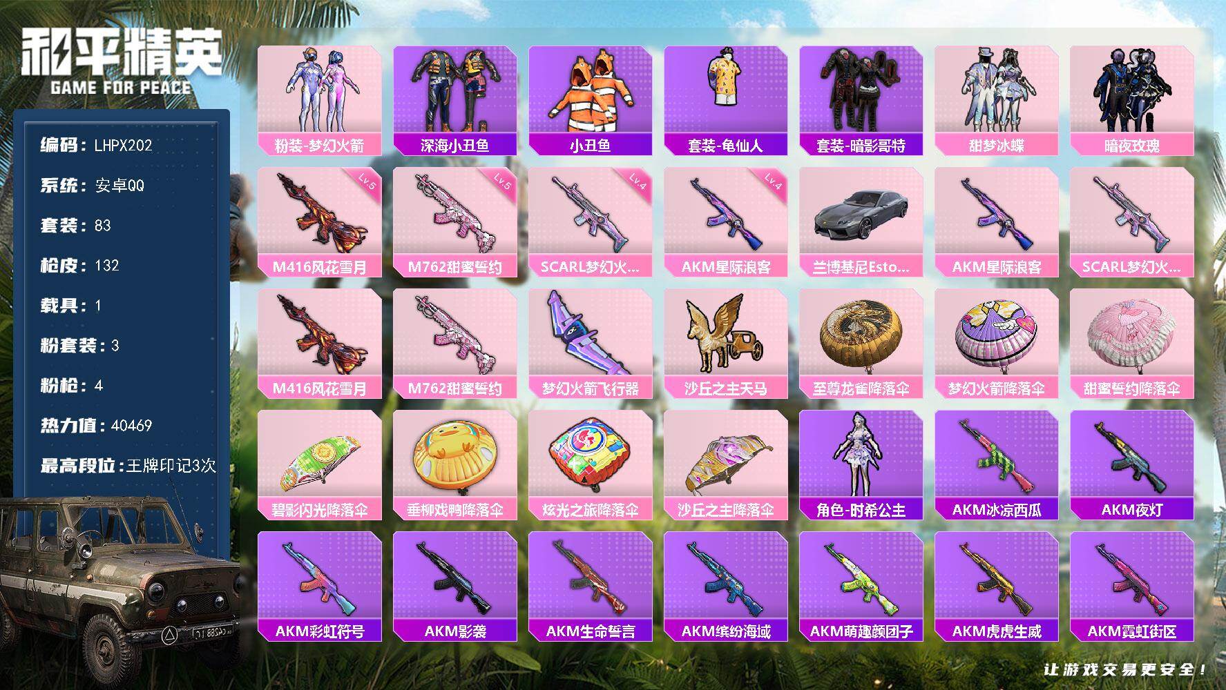 [15252689]【特价出售/店主推荐】安卓 手Q-3粉装-4特效枪-1载具-2粉色飞行器-40469热力值-3王牌印记-83套装-132枪皮 【热门品类】:粉装-梦幻火箭,套装-深海小丑鱼,套装-小丑鱼,套装-龟仙人,套装-暗影哥特 【粉色套装】:粉装-梦幻火箭,粉装-甜梦冰蝶,粉装-暗夜玫瑰 【粉色枪皮等级】:AKM-星际浪客(四级),SCAR-L-梦幻火箭(四级),M416-风花雪月(五级),M762-甜蜜誓约(五级) 【粉色载具】:兰博基尼Estoque(银翼灰) 【粉色枪皮】:AKM-星际浪客,SCAR-L-梦幻火箭,M416-风花雪月,M762-甜蜜誓约 【粉色飞行器】:梦幻火箭飞行器,沙丘之主天马 【粉色降落伞】:至尊龙雀降落伞,梦幻火箭降落伞,甜蜜誓约降落伞,碧影闪光降落伞,垂柳戏鸭降落伞,炫光之旅降落伞,沙丘之主降落伞 【稀有套装】:套装-龟仙人,角色-时希公主 【稀有枪皮】:AKM-冰凉西瓜,AKM-夜灯,AKM-彩虹符号,AKM-影袭,AKM-生命誓言,AKM-缤纷海域,AKM-萌趣颜团子,AKM-虎虎生威,AKM-霓虹街区,M16A4-幻世战舞者,SCAR-L-玉兔迎春,SCAR-L-甜蜜誓约,SCAR-L-红色方程式,SCAR-L-黄金龙骨,M416-夜灯,M416-糯团青竹,M416-红色方程式,M416-绯红前夜,M416-蓝色火焰,GROZA-异彩先驱,GROZA-彩虹符号,GROZA-影袭,GROZA-懵萌河马,GROZA-治愈之星,AUG-耀粉歌者,AUG-青春冒险家,QBZ-彩虹符号,QBZ-洛神天依,QBZ-潮汐统领,QBZ-飞驰魅影,M762-牛气冲天,M762-瑞龙福将,M762-绯红前夜,Mk47-炫光之旅,Mk47-青春冒险家,G36C-懵萌河马,G36C-时空追击者,G36C-暗夜玫瑰,AC-VAL-快闪甜心,蜜獾-垂柳戏鸭,蜜獾-娇憨猪猪,UZI-啾咪啾咪,UZI-天降萌叽,UZI-娇憨猪猪,UZI-影袭,UZI-炫彩节奏,UZI-烈焰拳霸,UMP45-时空追击者,UMP45-涂山之恋,UMP45-生命誓言,Vector-彩虹符号,Vector-治愈之星,汤姆逊-异彩先驱,汤姆逊-炫彩节奏,汤姆逊-耀粉歌者,野牛-夜灯,野牛-青春冒险家,MP5K-异彩先驱,MP5K-甜蜜誓约,MP5K-蓝莓炮弹,P90-快闪甜心,P90-飞驰魅影
