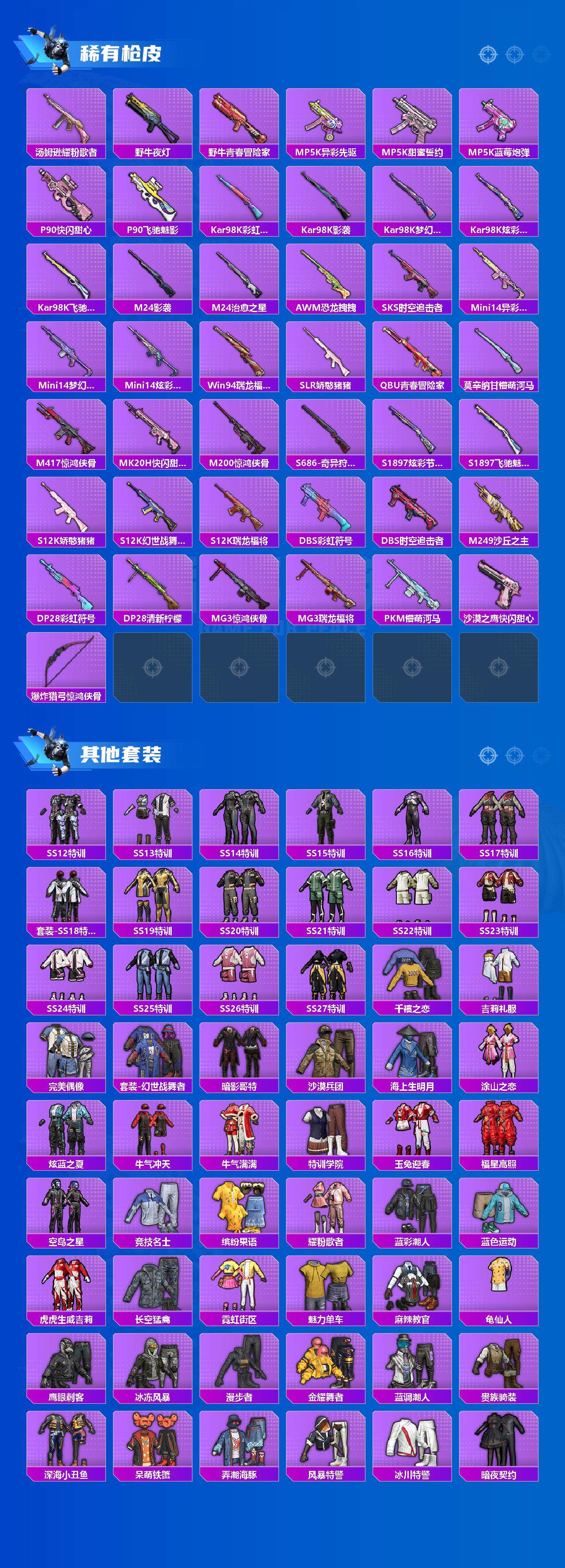 【稀有枪皮】:AKM-冰凉西瓜,AKM-夜灯,AKM-彩虹符号,AKM-影袭,AKM-生命誓言,AKM-缤纷海域,AKM-萌趣颜团子,AKM-虎虎生威,AKM-霓虹街区,M16A4-幻世战舞者,SCAR-L-玉兔迎春,SCAR-L-甜蜜誓约,SCAR-L-红色方程式,SCAR-L-黄金龙骨,M416-夜灯,M416-糯团青竹,M416-红色方程式,M416-绯红前夜,M416-蓝色火焰,GROZA-异彩先驱,GROZA-彩虹符号,GROZA-影袭,GROZA-懵萌河马,GROZA-治愈之星,AUG-耀粉歌者,AUG-青春冒险家,QBZ-彩虹符号,QBZ-洛神天依,QBZ-潮汐统领,QBZ-飞驰魅影,M762-牛气冲天,M762-瑞龙福将,M762-绯红前夜,Mk47-炫光之旅,Mk47-青春冒险家,G36C-懵萌河马,G36C-时空追击者,G36C-暗夜玫瑰,AC-VAL-快闪甜心,蜜獾-垂柳戏鸭,蜜獾-娇憨猪猪,UZI-啾咪啾咪,UZI-天降萌叽,UZI-娇憨猪猪,UZI-影袭,UZI-炫彩节奏,UZI-烈焰拳霸,UMP45-时空追击者,UMP45-涂山之恋,UMP45-生命誓言,Vector-彩虹符号,Vector-治愈之星,汤姆逊-异彩先驱,汤姆逊-炫彩节奏,汤姆逊-耀粉歌者,野牛-夜灯,野牛-青春冒险家,MP5K-异彩先驱,MP5K-甜蜜誓约,MP5K-蓝莓炮弹,P90-快闪甜心,P90-飞驰魅影