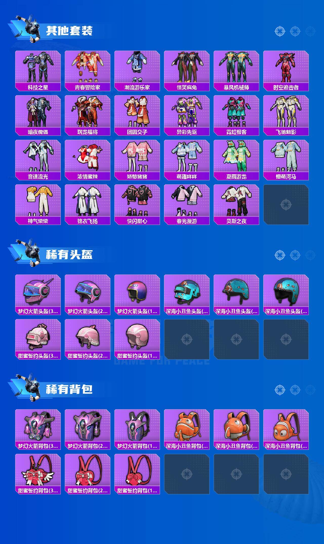 套装-梦幻火箭,套装-深海小丑鱼,套装-甜梦冰蝶,套装-暗夜玫瑰,套装-鹰眼刺客,套装-呆萌铁蟹