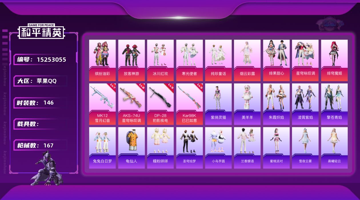 [15253055]【店主推荐捡漏号!可直接换绑】 苹果 手Q-9粉装-4特效枪-4粉色飞行器-5.4w热力值-8王牌印记-146套装-167枪皮【热门品类】:粉装-缤纷油彩,套装-龟仙人,套装-糯粉咩咩【粉色套装】:粉装-缤纷油彩,粉装-放客神游,粉装-冰川红玫,粉装-寒光使者,粉装-纯珍童话,角色-烟云彩露,粉装-绯果甜心,粉装-星穹咏叹调,角色-绯穹魔姬【粉色枪皮等级】:AKS-74U-星穹咏叹调(六级),Kar98K-巳巳如意(五级),MK12-雪月幻音(七级),DP-28-豹影疾电(五级)【粉色飞行器】:太空嘟嘟飞行器,萌物绒绒飞行器,电糖天使飞行器,绯果甜心飞行器