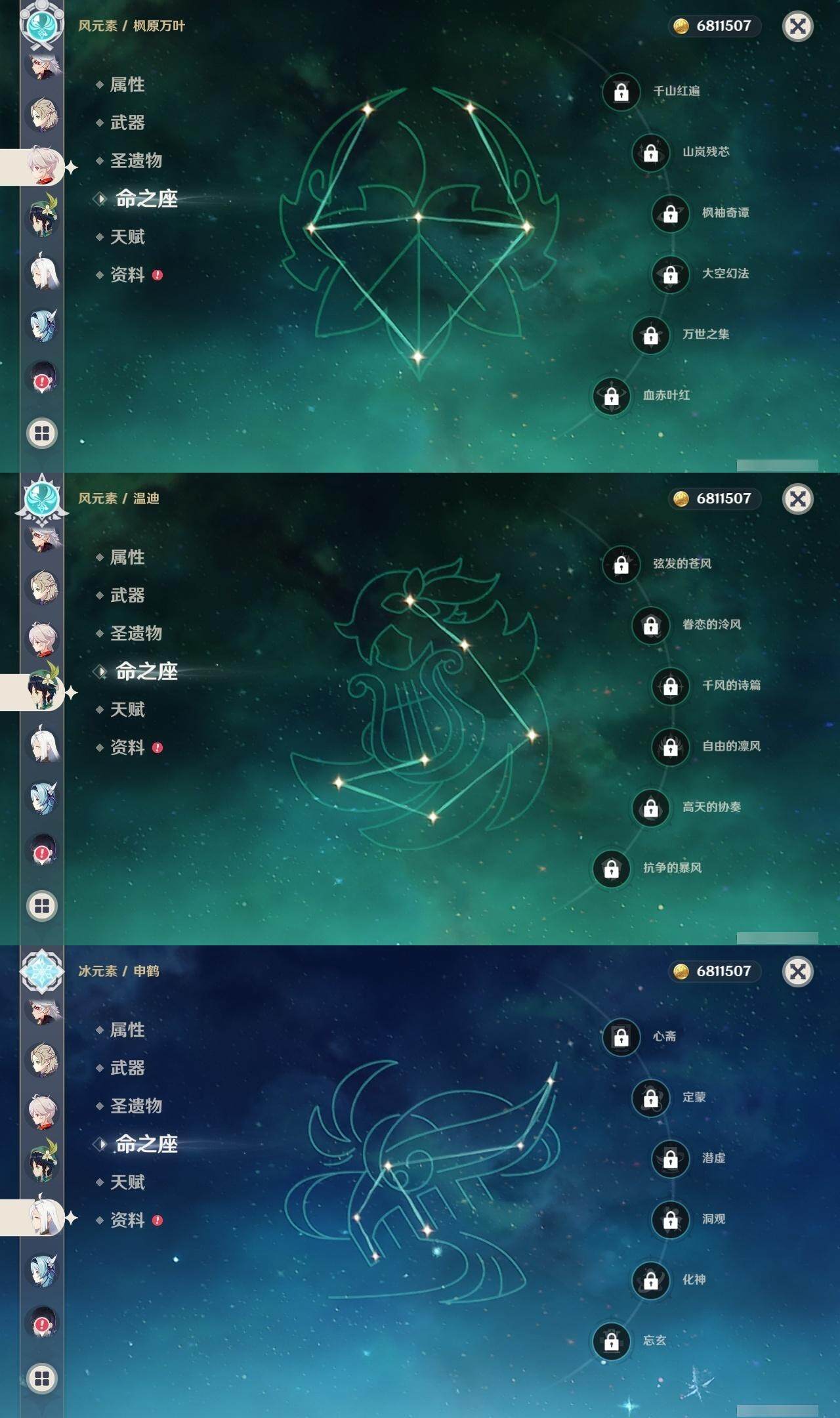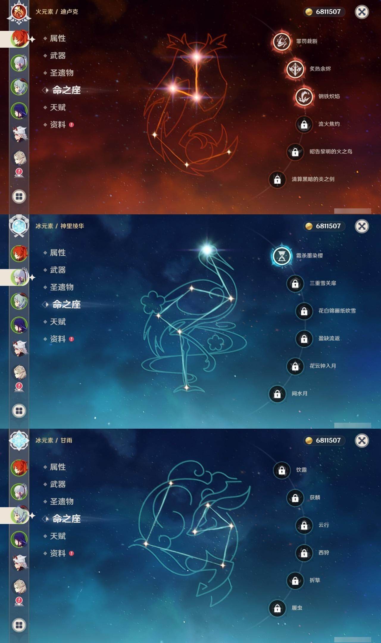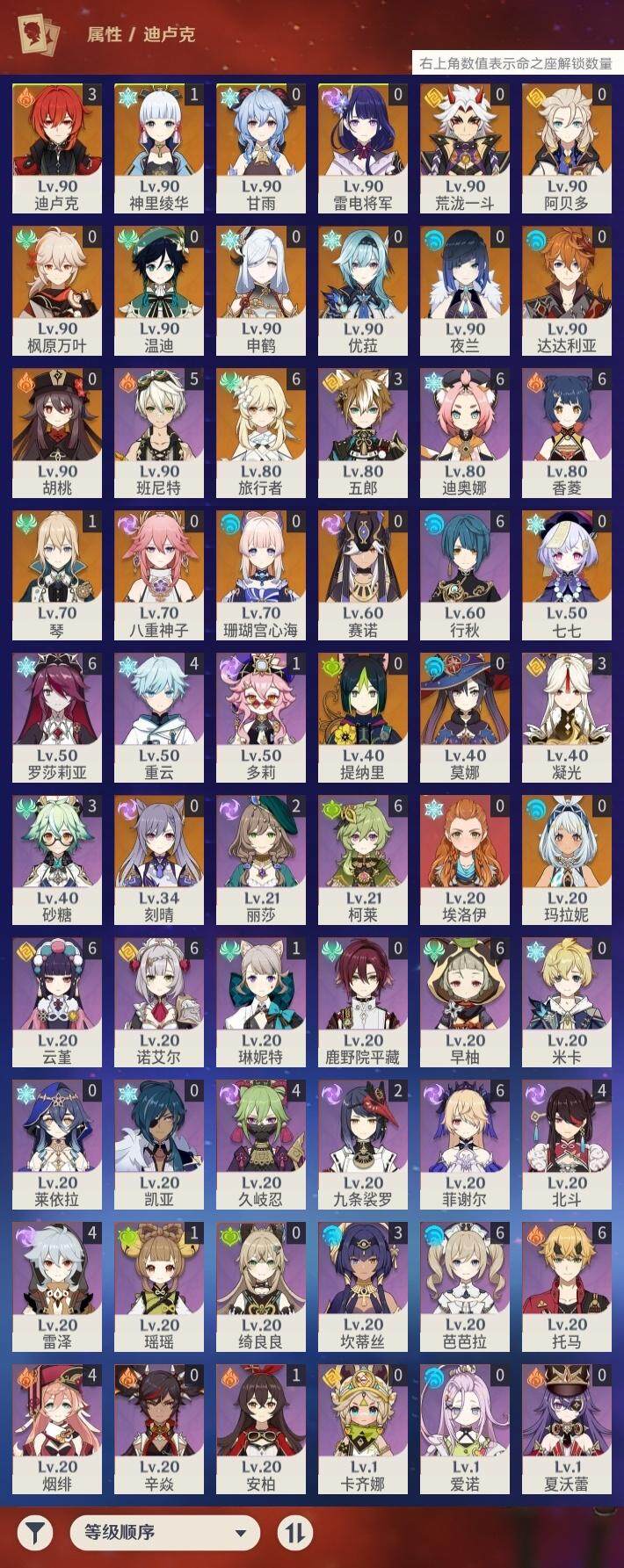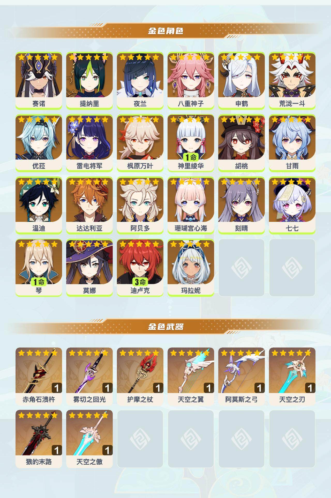 0命赛诺,0命提纳里,0命夜兰,0命八重神子,0命申鹤,0命荒泷一斗,0命优菈,0命雷电将军,0命枫原万叶,1命神里绫华,0命胡桃,0命甘雨,0命温迪,0命达达利亚,0命阿贝多,0命珊瑚宫心海,0命刻晴,0命七七,1命琴,0命莫娜,3命迪卢克,0命玛拉妮,精1赤角石溃杵,精1雾切之回光,精1护摩之杖,精1天空之翼,精1阿莫斯之弓,精1天空之刃,精1狼的末路,精1天空之傲