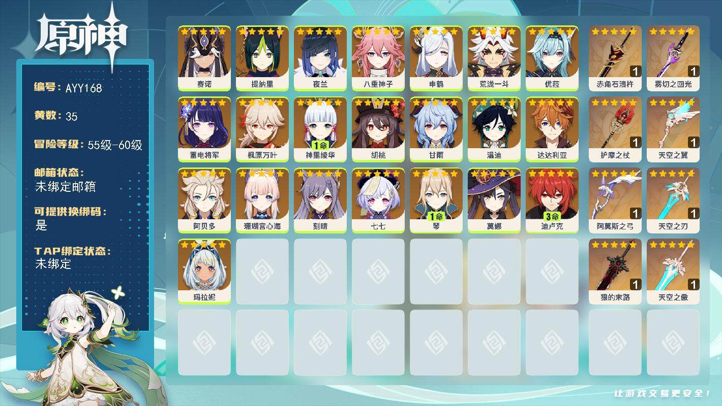 [15255734]58级/35黄/女主/22个五星角色/8个五星武器 0命赛诺,0命提纳里,0命夜兰,0命八重神子,0命申鹤,0命荒泷一斗,0命优菈,0命雷电将军,0命枫原万叶,1命神里绫华,0命胡桃,0命甘雨,0命温迪,0命达达利亚,0命阿贝多,0命珊瑚宫心海,0命刻晴,0命七七,1命琴,0命莫娜,3命迪卢克,0命玛拉妮,精1赤角石溃杵,精1雾切之回光,精1护摩之杖,精1天空之翼,精1阿莫斯之弓,精1天空之刃,精1狼的末路,精1天空之傲