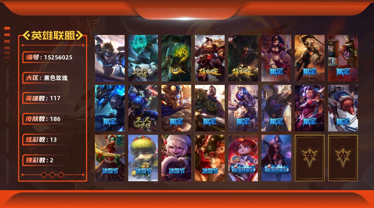 未定级段位-117英雄-186皮肤-13炫彩-1终极-1神话-25限定-18传说-52史诗