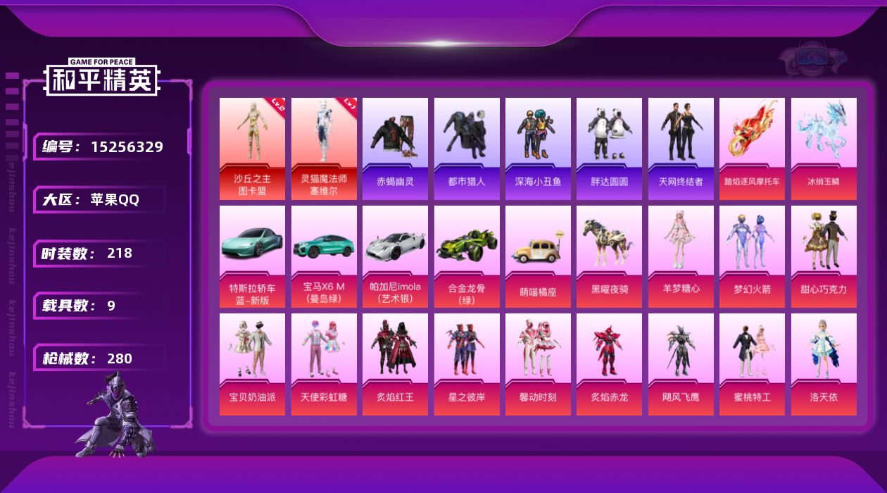 [15256329]素材身法号 苹果 手Q-2神装-17粉装-14特效枪-9载具-9粉色飞行器-10.5w热力值-13王牌印记-218套装-280枪皮【红色神装等级】:灵猫魔法师-塞维尔(一级),沙丘之主-图卡盟(二级)【热门品类】:粉装-梦幻火箭,套装-浪漫天命,套装-赤蝎幽灵,套装-都市猎人,套装-深海小丑鱼,套装-胖达圆圆,套装-天网终结者,套装-AG战队服,套装-潮萌小黄鸭,套装-暗影哥特,角色-Mark.06,套装-红熊茄茄【粉色载具】:特斯拉Roadster(水滴蓝),宝马X6 M(曼岛绿),帕加尼imola(艺术银),合金龙骨(绿),萌喵橘座,踏焰逐风摩托车,僚机-萌兔起飞,黑曜夜骑,冰绡玉鳞【粉色套装】:粉装-甜心巧克力,粉装-宝贝奶油派,粉装-天使彩虹糖,粉装-梦幻火箭,粉装-炙焰红王,粉装-星之彼岸,粉装-馨动时刻,粉装-炙焰赤龙,粉装-飓风飞鹰,粉装-蜜桃特工,角色-洛天依,粉装-桃粉嫣然,角色-宁雨蝶,角色-罗征,角色-荧海星豚,角色-绯穹魔姬,角色-羊梦糖心【粉色枪皮等级】:AKM-甜心宝贝(六级),AKM-梦之光华(二级),SCAR-L-青春物语(一级),SCAR-L-魔童闹海 哪吒(三级),M416-心之恋语(一级),M416-灵猫魔法师(三级),蜜獾-荧海星豚(三级),UMP45-相思残雪(七级),Vector-绯穹魔姬(三级),P90-沙丘之主(三级),P90-魔童闹海 敖丙(一级),Kar98K-巳巳如意(五级),M24-镜域双华(二级),DP-28-豹影疾电(五级)【粉色飞行器】:酣梦熊熊飞行器,梦幻火箭飞行器,沙丘之主天马,镜域双华-灵镜之阶,龙翔九天飞行器,灵猫魔法师飞行器,飞天猪飞行器,灵