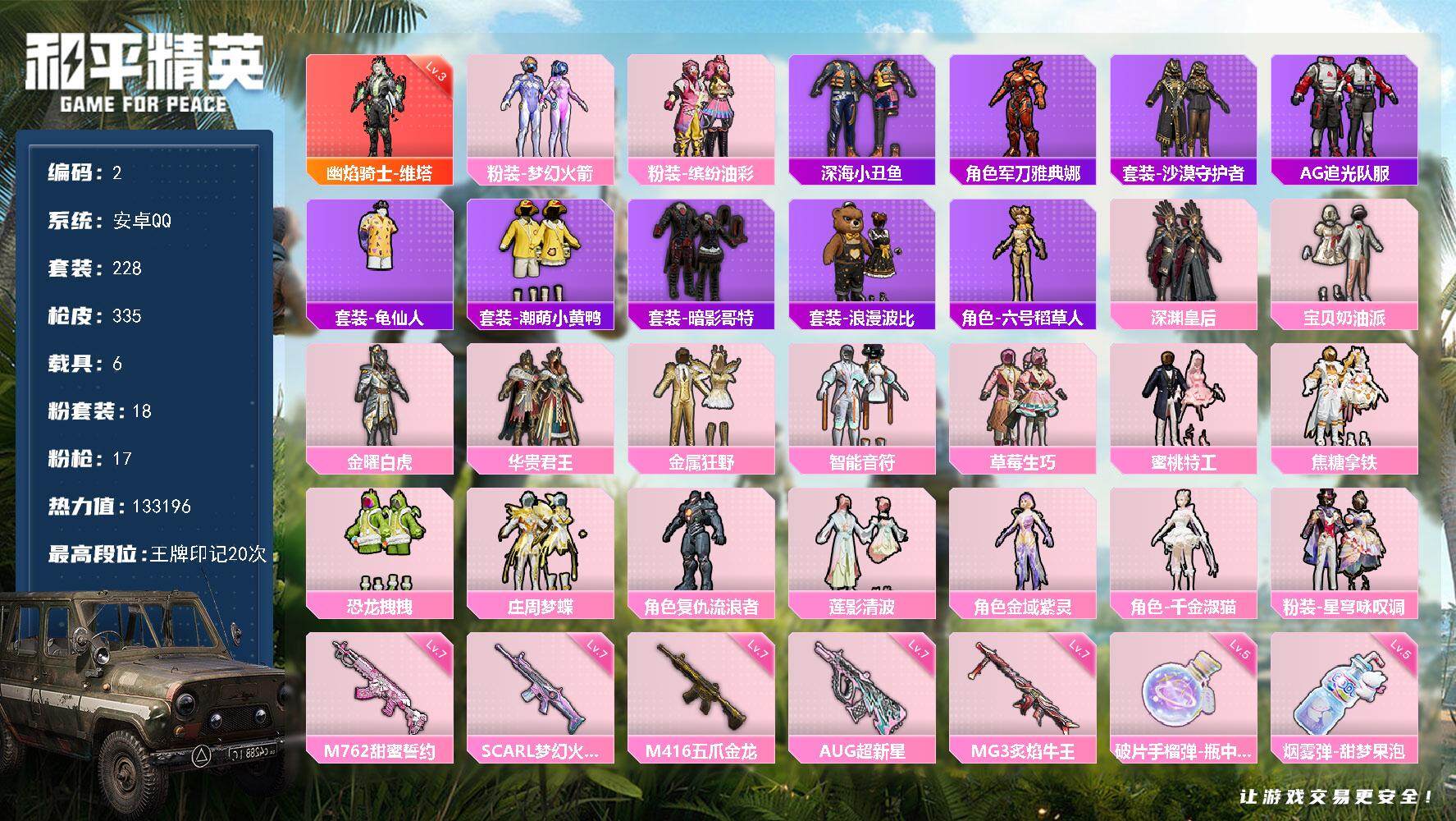 [15256521]【特价出售/店主推荐】 安卓 手Q-1神装-18粉装-17特效枪-6载具-10粉色飞行器-133196热力值-20王牌印记-228套装-335枪皮【红色神装等级】:幽焰骑士-维塔(三级)【红色角色神装】:幽焰骑士-维塔【热门品类】:粉装-梦幻火箭,粉装-缤纷油彩,套装-深海小丑鱼,角色-军刀雅典娜,套装-沙漠守护者,套装-AG追光队服,套装-龟仙人,套装-潮萌小黄鸭,套装-暗影哥特,套装-浪漫波比,角色-六号稻草人【粉色套装】:粉装-深渊皇后,粉装-宝贝奶油派,粉装-金曜白虎,粉装-梦幻火箭,粉装-华贵君王,粉装-金属狂野,粉装-智能音符,粉装-缤纷油彩,粉装-草莓生巧,粉装-蜜桃特工,粉装-焦糖拿铁,粉装-恐龙拽拽,粉装-庄周梦蝶,角色-复仇流浪者,粉装-莲影清波,角色-金域紫灵,角色-千金淑猫,粉装-星穹咏叹调【粉色枪皮等级】:AKM-炫紫旋律(四级),AKM-幽焰骑士(三级),SCAR-L-梦幻火箭(七级),M416-五爪金龙(七级),GROZA-焦糖拿铁(四级),AUG-超新星(七级),M762-甜蜜誓约(七级),UZI-绮梦青鸾(四级),UMP45-恐龙拽拽(四级),Vector-环太平洋(四级),AKS-74U-星穹咏叹调(四级),Kar98K-巳巳如意(四级),M24-镜域双华(三级),DP-28-豹影疾电(五级),MG3-炙焰牛王(七级),烟雾弹-甜梦果泡(五级),破片手榴弹-瓶中星球(五级)【粉色载具】:特斯拉Model X(珍珠白),玛莎拉蒂Ghibli(粉),时空跃影(星辉银),海龙奔腾,杜卡迪 Panigale V4(杜卡迪红),僚机-永恒黄蜂【粉色枪皮】:AKM-炫紫旋律,AKM-幽焰骑士,SCAR-L-梦幻火箭,M416-五爪金龙,GROZA-焦糖拿铁,AUG-超新星,M762-甜蜜誓约,UZI-绮梦青鸾,UMP45-恐龙拽拽,Vector-环太平洋,AKS-74U-星穹咏叹调,Kar98K-巳巳如意,M24-镜域双华,DP-28-豹影疾电,MG3-炙焰牛王,烟雾弹-甜梦果泡,破片手榴弹-瓶中星球【粉色飞行器】:春暖花开飞行器,梦幻火箭飞行器,炫紫旋律飞行器,天之羽翼飞行器,镜域双华-灵镜之阶,幽焰列车飞行器,脆鲨七海飞行器,极意拳锋飞行器