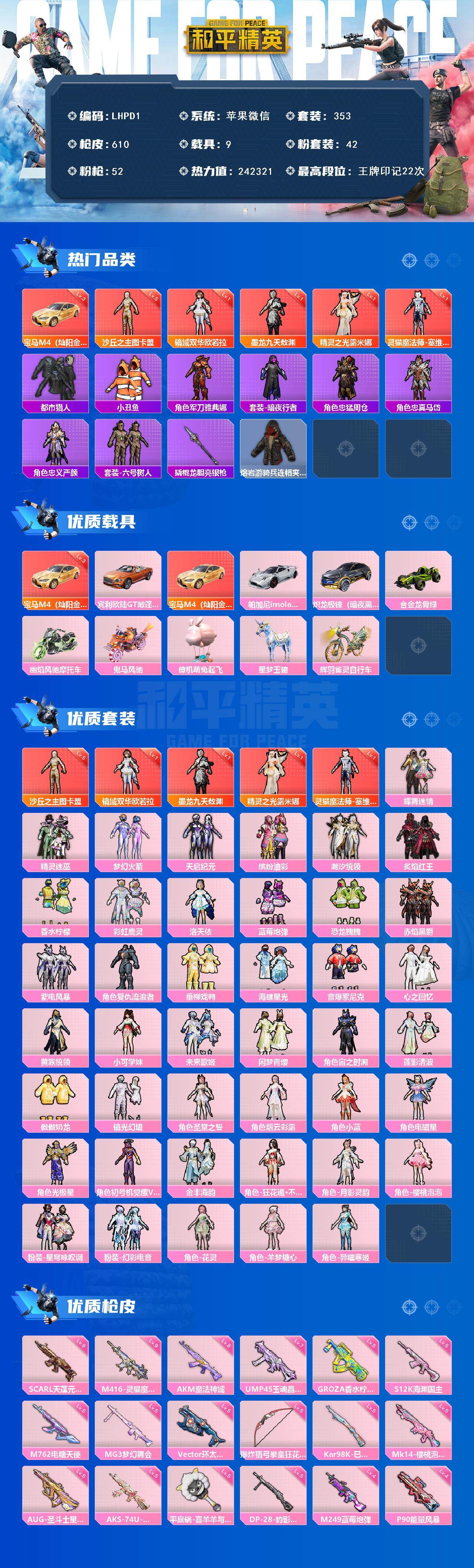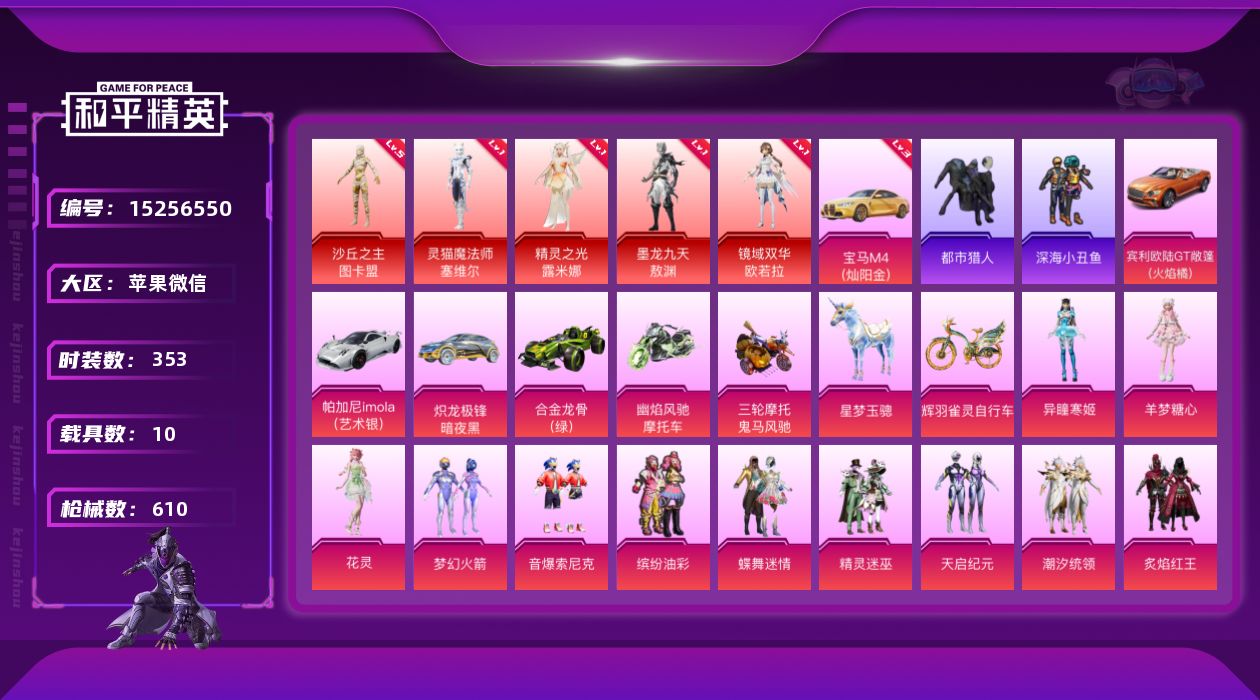 [15256550]【特价出售/店主推荐】 地铁满天赋苹果 微信-5神装-42粉装-52特效枪-10载具-31粉色飞行器-242321热力值-22王牌印记-353套装-610枪皮【红色载具】:宝马M4(灿阳金)(三级)【红色神装等级】:灵猫魔法师-塞维尔(一级),精灵之光-露米娜(一级),墨龙九天-敖渊(一级),镜域双华-欧若拉(一级),沙丘之主-图卡盟(五级)【红色角色神装】:灵猫魔法师-塞维尔,精灵之光-露米娜,墨龙九天-敖渊,镜域双华-欧若拉,沙丘之主-图卡盟【热门品类】:粉装-梦幻火箭,粉装-音爆索尼克,粉装-缤纷油彩,套装-都市猎人,套装-深海小丑鱼,套装-小丑鱼,角色-军刀雅典娜,套装-暗夜行者,角色-2B战斗服款,角色-2P战斗服款,角色-忠猛周仓,角色-忠真马岱,角色-忠义严颜,套装-六号树人,套装-龟仙人,角色-8号机,角色-Mark.06,大砍刀-青龙偃月刀,撬棍-龙胆亮银枪,熔岩游骑兵连帽夹克【粉色套装】:粉装-蝶舞迷情,粉装-精灵迷巫,粉装-梦幻火箭,粉装-天启纪元,粉装-缤纷油彩,粉装-潮汐统领,粉装-炙焰红王,粉装-香水柠檬,粉装-彩虹鹿灵,角色-洛天依,粉装-蓝莓炮弹,粉装-恐龙拽拽,粉装-赤焰黑爵,粉装-紫电风暴,角色-复仇流浪者,粉装-垂柳戏鸭,粉装-海螺星光,粉装-音爆索尼克,粉装-心之回忆,粉装-黄族统领,角色-小可学妹,粉装-未来歌姬,粉装-闲梦青缨,角色-宙之时溯,粉装-莲影清波,粉装-傲傲奶龙,粉装-镜光幻境,角色-圣堂之誓,角色-烟云彩露,角色-小蓝,角色-电磁星,角色-光极星,角色-初号机 觉醒Ver.,粉装-金丰海韵,角色-狂花道·不知火舞,角色-月影灵韵,角色-樱桃泡泡,粉装-星穹咏叹调,粉装-幻彩电音,角色-花灵,角色-羊梦糖心,角色-异瞳寒姬【粉色枪皮等级】:AKM-梦之光华(一级),AKM-盖世英雄(一级),AKM-魔法神域(八级),AKM-幽焰骑士(一级),M16A4-垂柳戏鸭(一级),SCAR-L-梦幻火箭(一级),SCAR-L-天蓬元帅(九级),M416-五爪金龙(一级),M416-暖熊萌萌(一级),M416-至情至圣(一级),M416-墨龙九天(一级),M416-灵猫魔法师(九级),GROZA-香水柠檬(五级),GROZA-精灵之光(三级),AUG-星之彼岸(一级),AUG-圣斗士星矢(五级),M762-冷魅冰骑(一