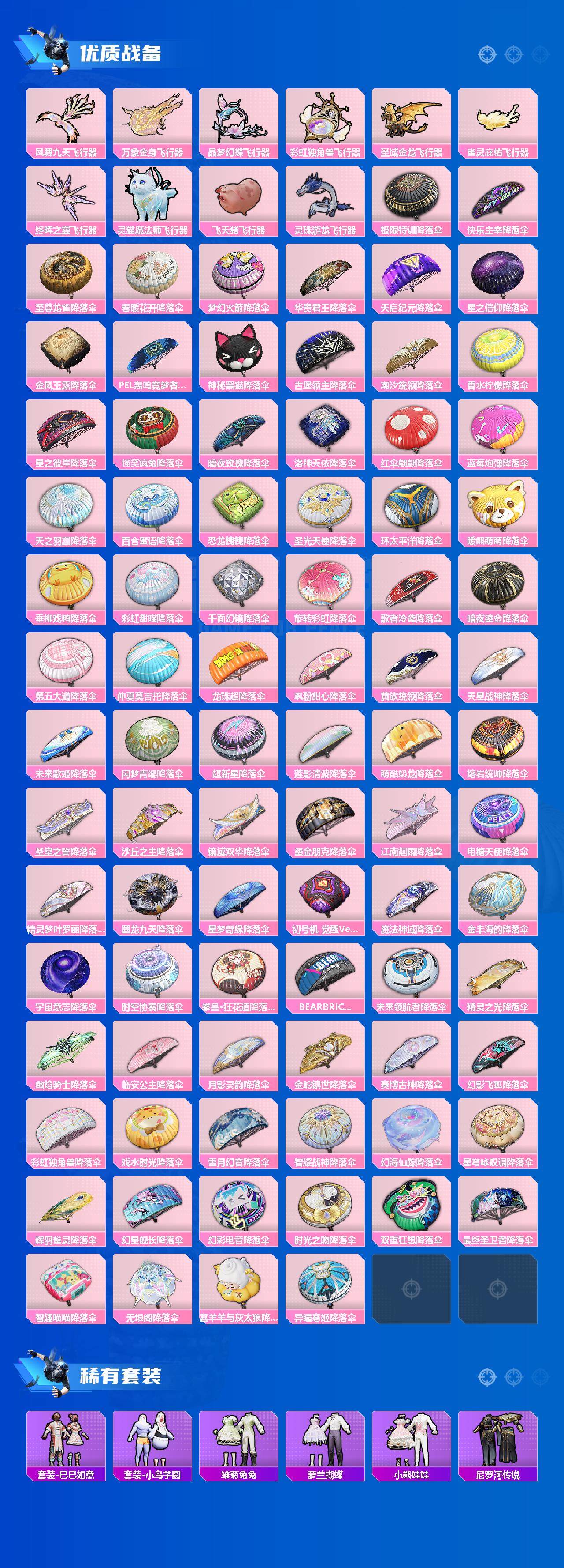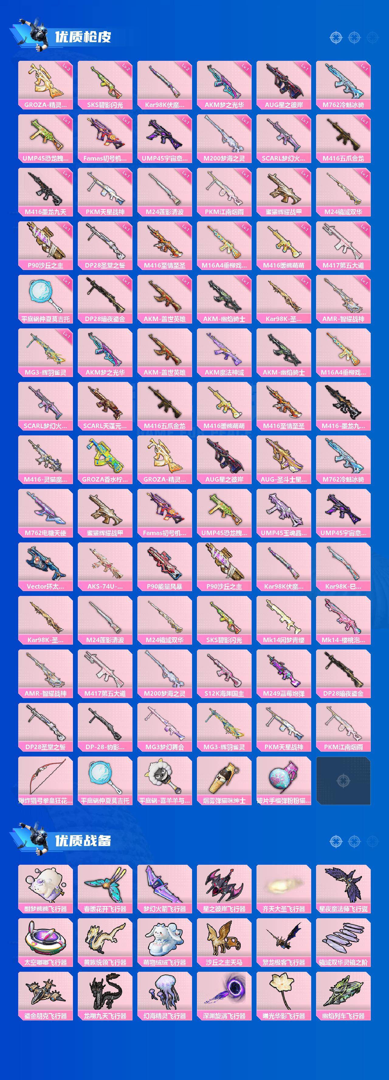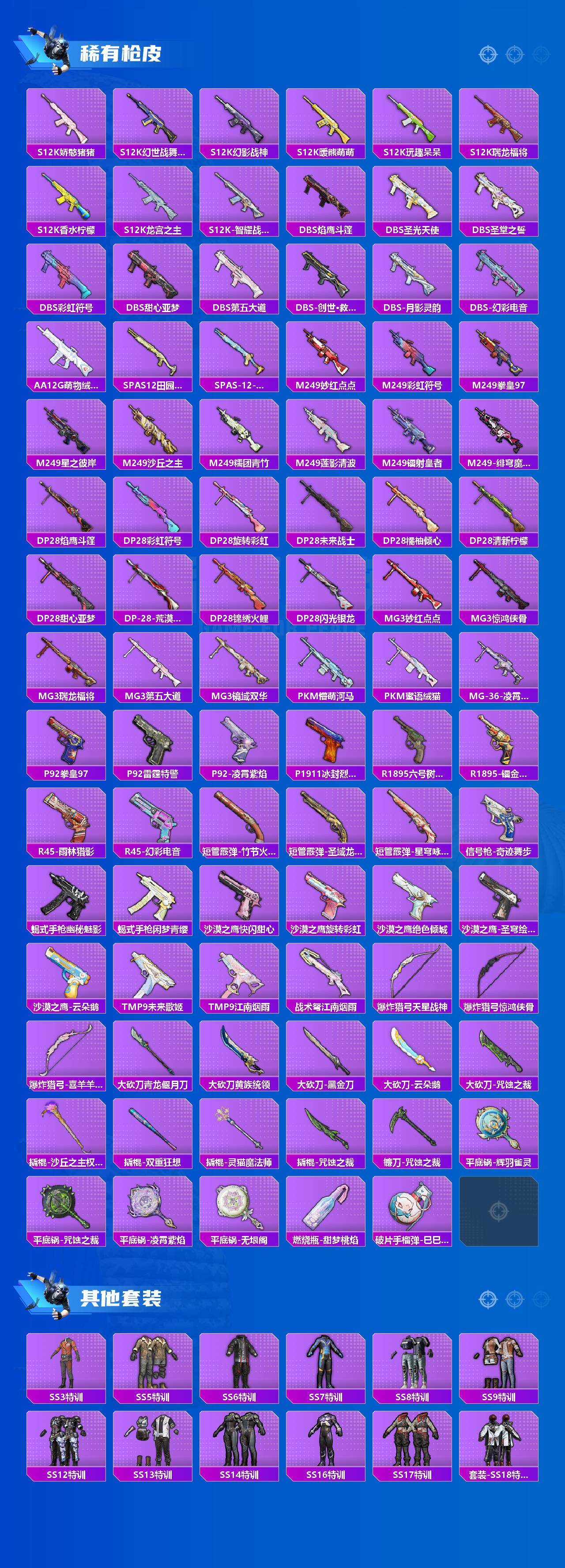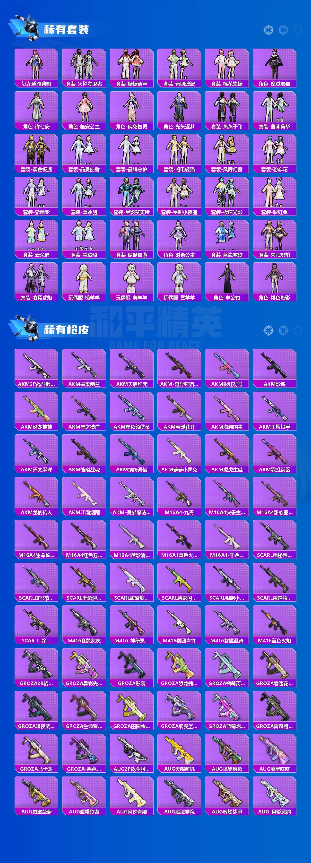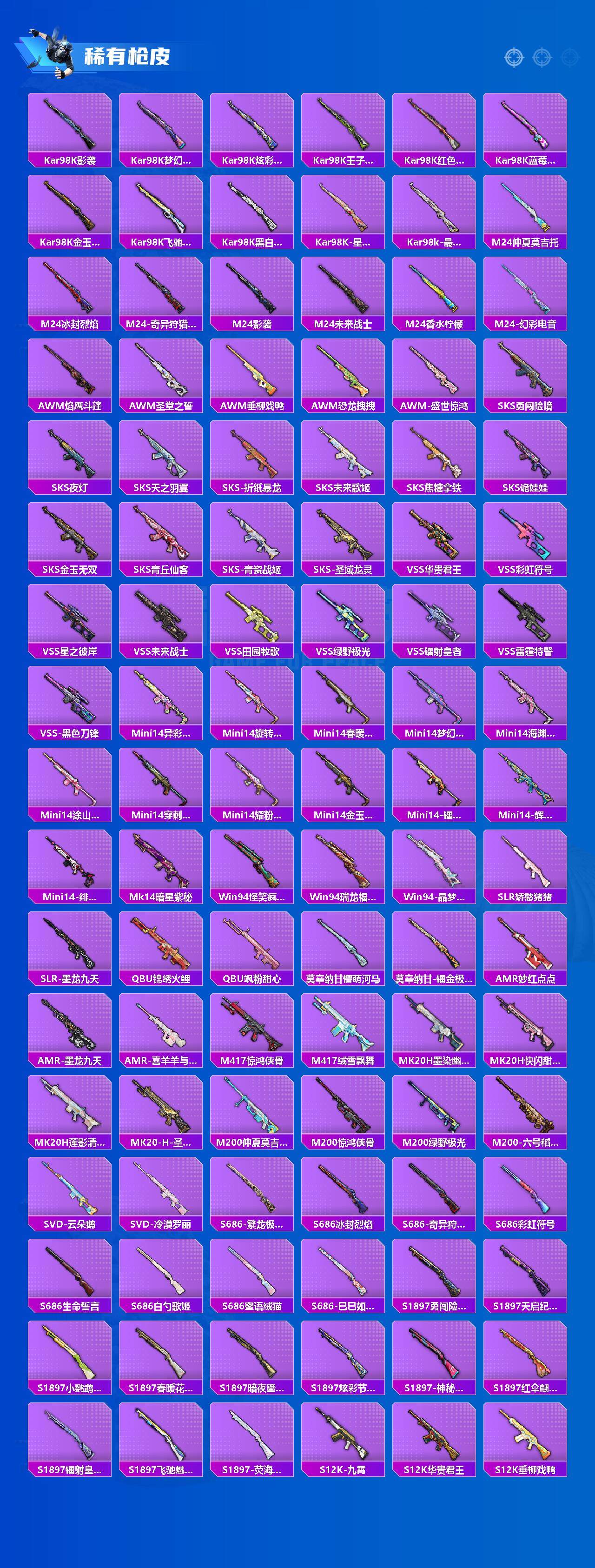 AKM-梦之光华,AKM-盖世英雄,AKM-魔法神域,AKM-幽焰骑士,M16A4-垂柳戏鸭,SCAR-L-梦幻火箭,SCAR-L-天蓬元帅,M416-五爪金龙,M416-暖熊萌萌,M416-至情至圣,M416-墨龙九天,GROZA-香水柠檬,GROZA-精灵之光,AUG-星之彼岸,M762-冷魅冰骑,M762-电糖天使,蜜獾-辉耀战甲,Famas-觉醒初号机,UMP45-恐龙拽拽,UMP45-玉魂晶魄,UMP45-宇宙意志,Vector-环太平洋,P90-能量风暴,P90-沙丘之主,Kar98K-伏魔团,Kar98K-巳巳如意,Kar98K-圣域龙灵,M24-莲影清波,M24-镜域双华,SKS-碧影闪光,Mk14-闲梦青缨,Mk14-樱桃泡泡,M417-第五大道,M200-梦海之灵,S12K-海渊国主,M249-蓝莓炮弹,DP-28-暗夜鎏金,DP-28-圣堂之誓,MG3-梦幻舞会,PKM-天星战神,PKM-江南烟雨,爆炸猎弓-拳皇·狂花道,平底锅-仲夏莫吉托,烟雾弹-猫咪绅士,破片手榴弹-粉粉猫爪