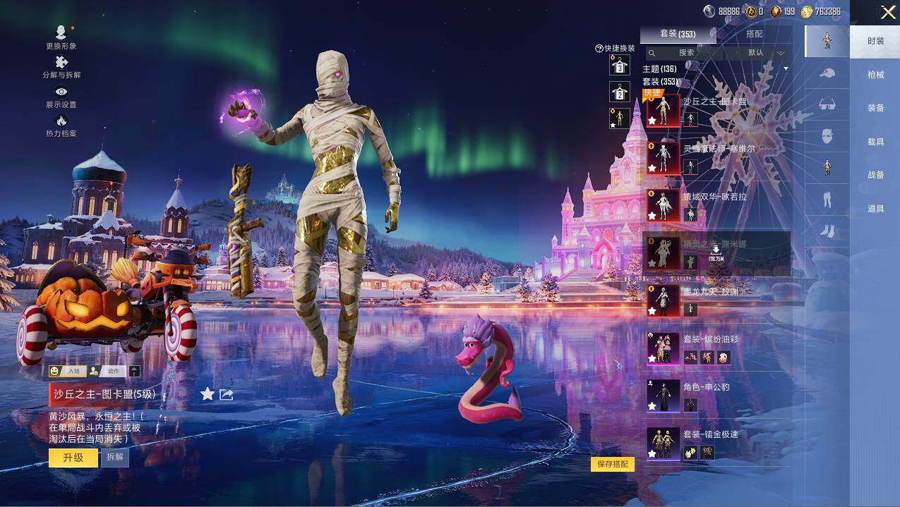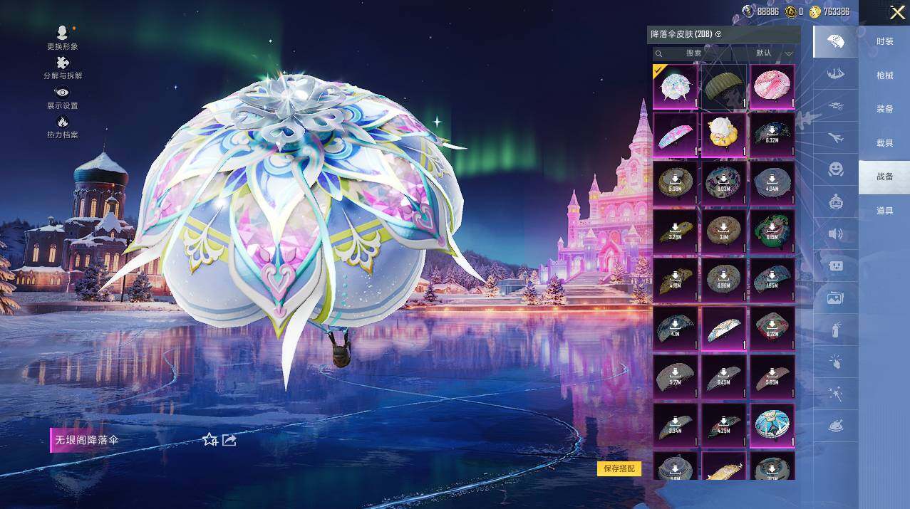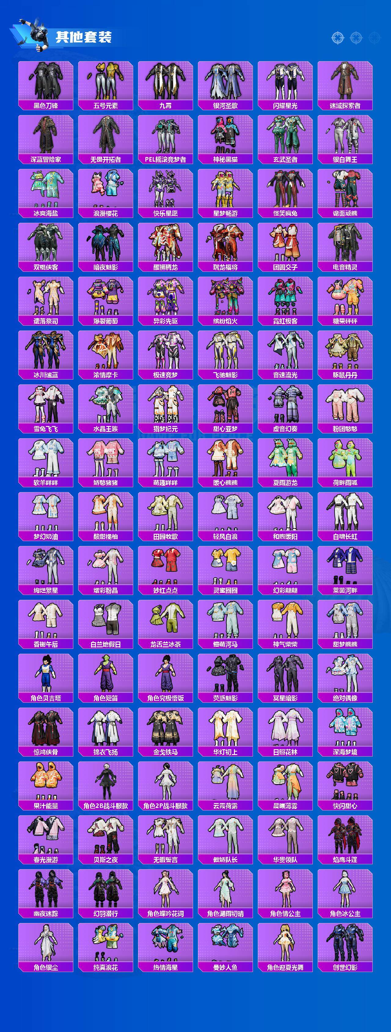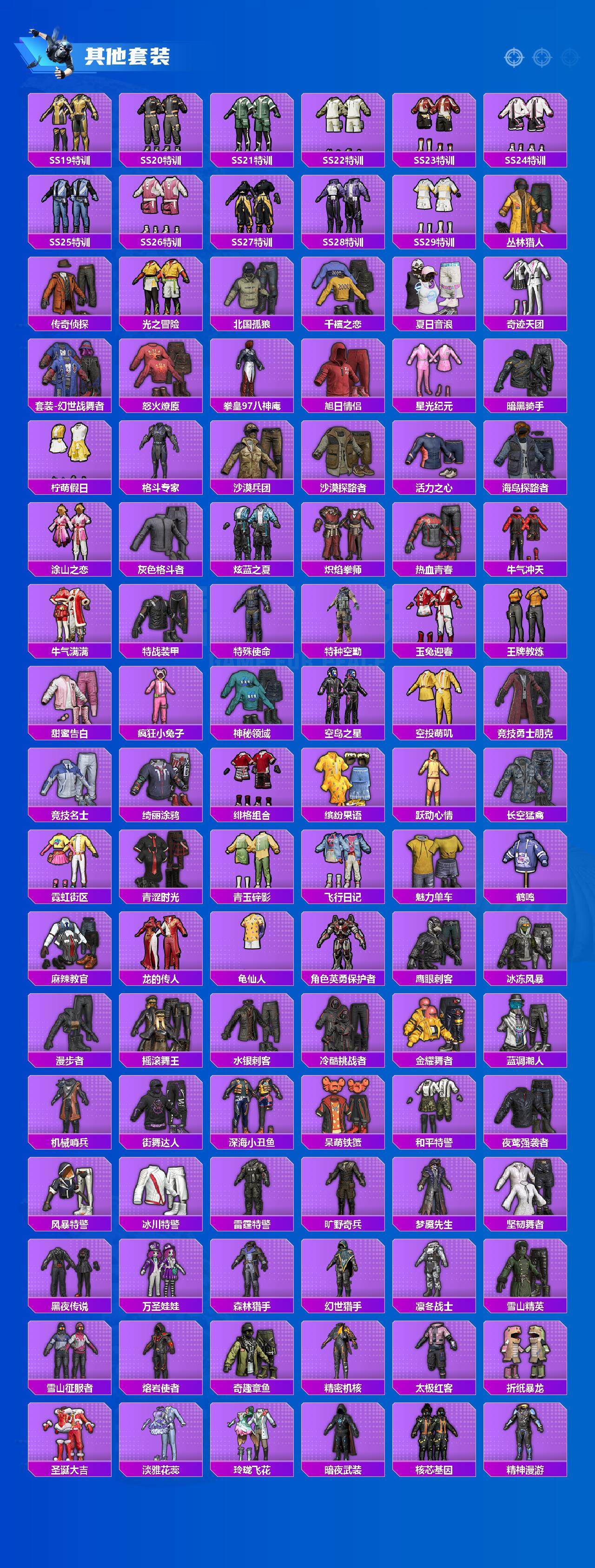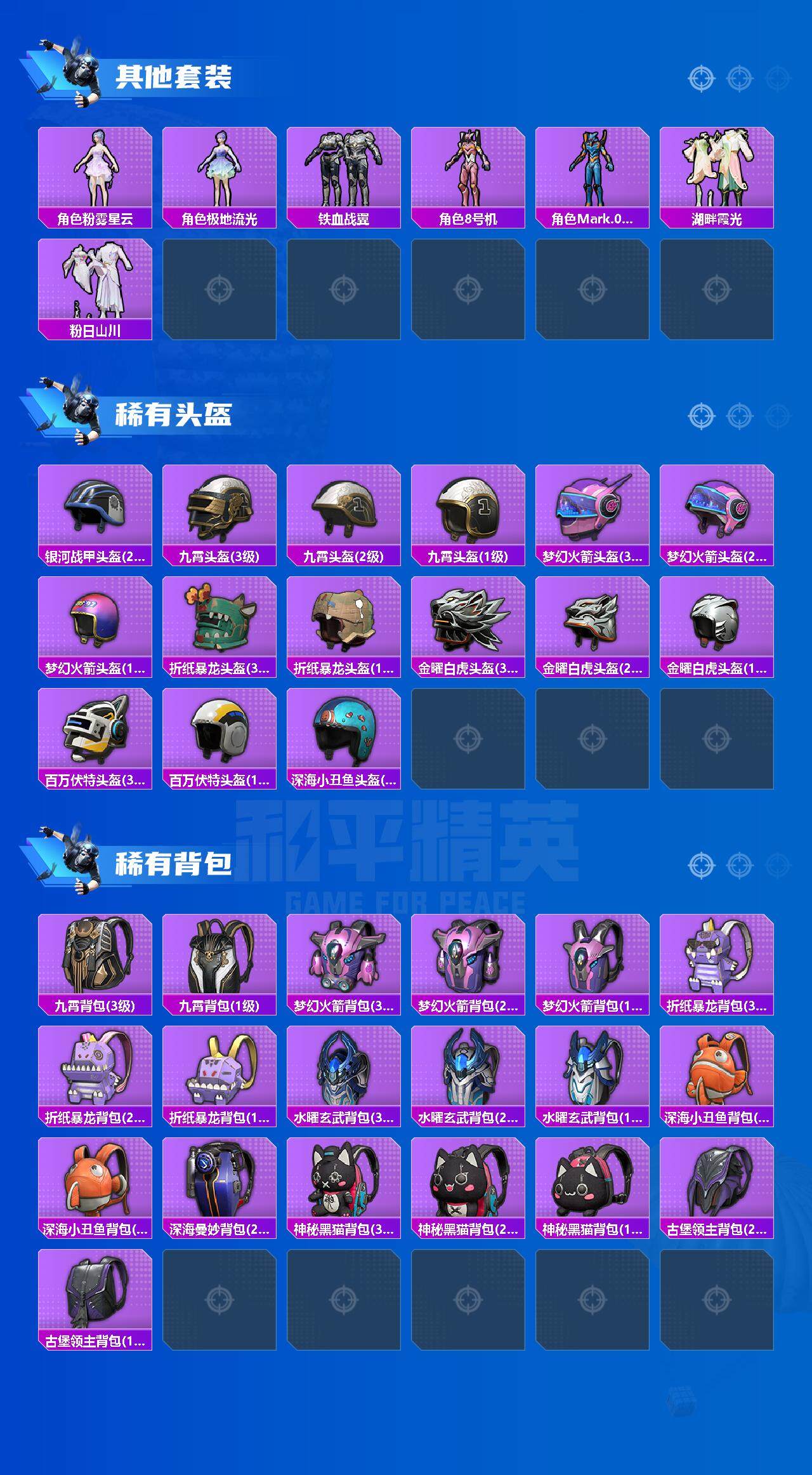 AKM-梦之光华,AKM-盖世英雄,AKM-魔法神域,AKM-幽焰骑士,M16A4-垂柳戏鸭,SCAR-L-梦幻火箭,SCAR-L-天蓬元帅,M416-五爪金龙,M416-暖熊萌萌,M416-至情至圣,M416-墨龙九天,GROZA-香水柠檬,GROZA-精灵之光,AUG-星之彼岸,M762-冷魅冰骑,M762-电糖天使,蜜獾-辉耀战甲,Famas-觉醒初号机,UMP45-恐龙拽拽,UMP45-玉魂晶魄,UMP45-宇宙意志,Vector-环太平洋,P90-能量风暴,P90-沙丘之主,Kar98K-伏魔团,Kar98K-巳巳如意,Kar98K-圣域龙灵,M24-莲影清波,M24-镜域双华,SKS-碧影闪光,Mk14-闲梦青缨,Mk14-樱桃泡泡,M417-第五大道,M200-梦海之灵,S12K-海渊国主,M249-蓝莓炮弹,DP-28-暗夜鎏金,DP-28-圣堂之誓,MG3-梦幻舞会,PKM-天星战神,PKM-江南烟雨,爆炸猎弓-拳皇·狂花道,平底锅-仲夏莫吉托,烟雾弹-猫咪绅士,破片手榴弹-粉粉猫爪