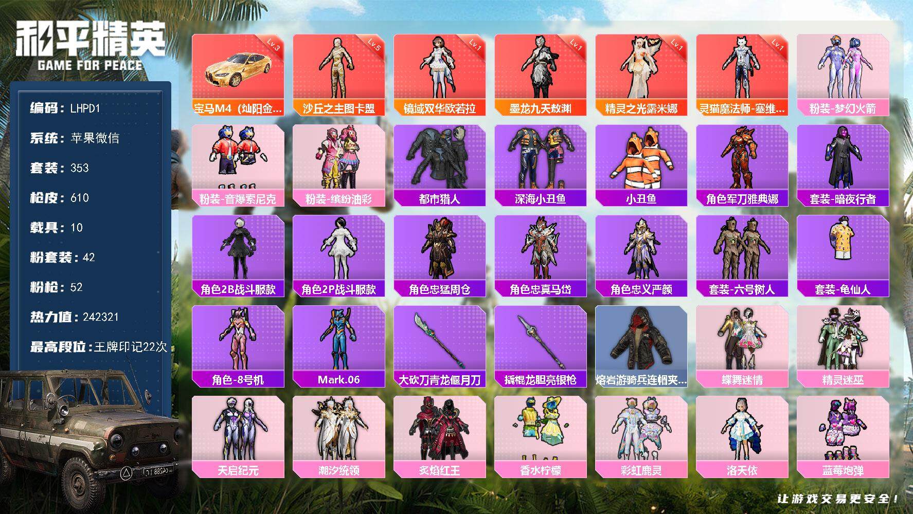 - [15657372]【特价出售/店主推荐】苹果 手Q-1粉装-3特效枪-0载具-0粉色飞行器-13419热力值-2王牌印记-34套装-45枪皮【热门品类】:套装-浪漫天命【粉色套装】:粉装-蜜语绒猫【粉色枪皮等级】:GROZA-镜光银凌(四级),AUG-暖羊咩咩(五级),Kar98K-巳巳如意(五级)【粉色枪皮】:GROZA-镜光银凌,AUG-暖羊咩咩,Kar98K-巳巳如意【稀有套装】:套装-绒宝小鹅,套装-糖糖葫芦,套装-青团波波,套装-棉花软糖,角色-都市丽猫,角色-摩登魅猫,套装-燕燕于飞,套装-鱼渊荷华,角色-蜜桃派对,套装-霓虹热舞,套装-云朵鹅,套装-雪绒豹