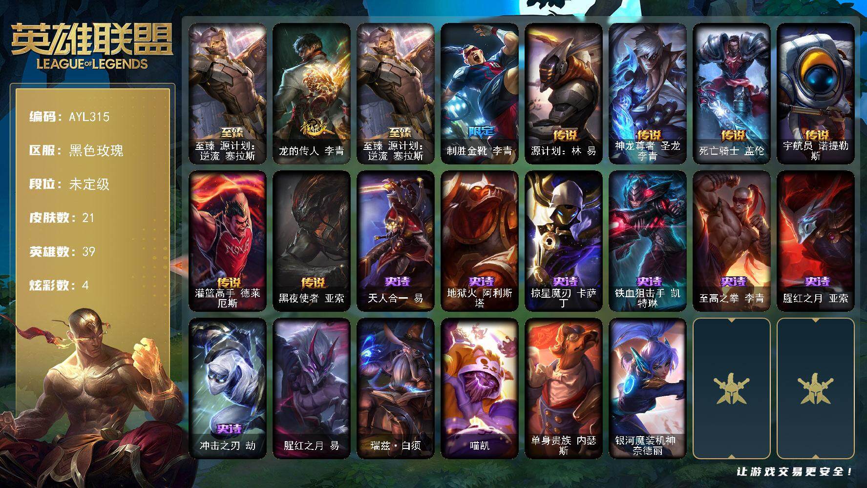 [15258209]可二次【特价出售/店主推荐】未定级段位-39英雄-21皮肤-4炫彩-0终极-1神话-2限定-6传说-7史诗 【至臻皮肤】:至臻源计划逆流塞拉斯 【年限皮肤】:龙的传人李青 【神话皮肤】:至臻源计划逆流塞拉斯 【限定皮肤】:制胜金靴李青 【传说皮肤】:源计划林易,神龙尊者圣龙李青,死亡骑士盖伦,宇航员诺提勒斯,灌篮高手德莱厄斯,黑夜使者亚索 【史诗皮肤】:天人合一易,地狱火阿利斯塔,掠星魔刃卡萨丁,铁血狙击手凯特琳,至高之拳李青,腥红之月亚索,冲击之刃劫 【其他皮肤1】:腥红之月易,瑞兹白须,喵凯,单身贵族内瑟斯,银河魔装机神奈德丽