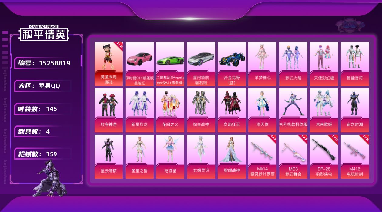 [15258819]【店主推荐捡漏号!可直接换绑】苹果 手Q-1神装-18粉装-9特效枪-4载具-10粉色飞行器-70360热力值-14王牌印记-145套装-159枪皮【红色神装等级】:魔童闹海-哪吒(二级) 【红色角色神装】:魔童闹海-哪吒【热门品类】:粉装-梦幻火箭,套装-小丑鱼,套装-龟仙人,角色-Mark.06【粉色套装】:粉装-天使彩虹糖,粉装-梦幻火箭,粉装-智能音符,粉装-放客神游,粉装-新星烈龙,粉装-花间之火,粉装-绚金战神,粉装-炙焰红王,角色-洛天依,角色-初号机款机体服,粉装-未来歌姬,角色-宙之时溯,角色-星云暗核,角色-圣堂之誓,角色-电磁星,角色-女娲灵识,角色-智耀战神,角色-羊梦糖心【粉色枪皮等级】:SCAR-L-魔童闹海 哪吒(三级),M416-电玩时刻(五级),M416-墨龙九天(三级),Kar98K-巳巳如意(五级),Mk14-精灵梦叶罗丽(七级),DP-28-豹影疾电(五级),MG3-洛神天依(四级),MG3-梦幻舞会(七级),平底锅-仲夏莫吉托(二级) 【粉色载具】:兰博基尼Aventador SVJ(翡翠绿),星河领航(磐石银),保时捷911 敞篷版(星珀红),合金龙骨(蓝)【粉色枪皮】:SCAR-L-魔童闹海 哪吒,M416-电玩时刻,M416-墨龙九天,Kar98K-巳巳如意,Mk14-精灵梦叶罗丽,DP-28-豹影疾电,MG3-洛神天依,MG3-梦幻舞会,平底锅-仲夏莫吉托【粉色飞行器】:梦之光华飞行器,镜光幻境飞行翼,沙丘之主天马,镜域双华-灵镜之阶,绝色倾城飞行器,宁雨蝶飞行器,飞天猪飞行器,灵珠游龙飞行器