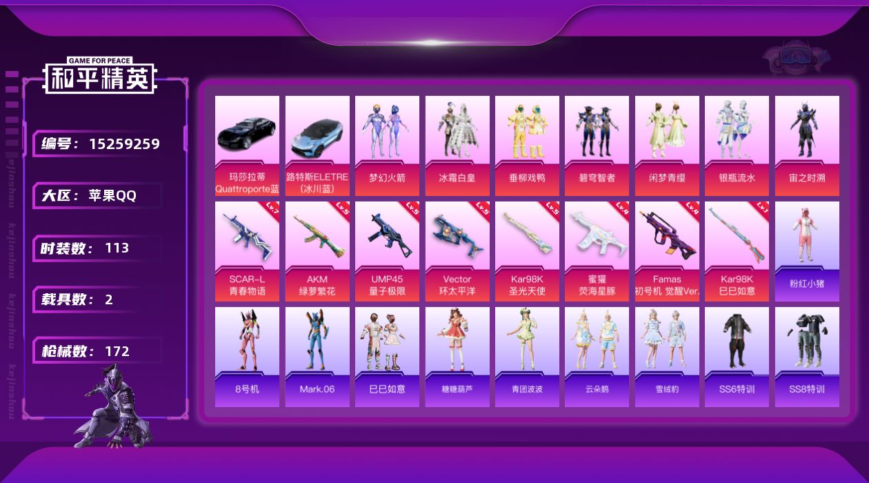 [15259259]【店主推荐捡漏号!可直接换绑】/素材身法号 苹果 手Q-7粉装-8特效枪-2载具-3粉色飞行器-5.3w热力值-5王牌印记-113套装-172枪皮【热门品类】:粉装-梦幻火箭,套装-粉红小猪,角色-8号机,角色-Mark.06【粉色载具】:路特斯ELETRE(冰川蓝),玛莎拉蒂Quattroporte(夜幕蓝)【粉色套装】:粉装-梦幻火箭,粉装-冰霜白皇,粉装-垂柳戏鸭,粉装-碧穹智者,粉装-闲梦青缨,粉装-银瓶流水,角色-宙之时溯【粉色枪皮等级】:AKM-绿萝繁花(五级),SCAR-L-青春物语(七级),蜜獾-荧海星豚(四级),Famas-初号机 觉醒Ver.(四级),UMP45-量子极限(五级),Vector-环太平洋(五级),Kar98K-圣光天使(五级),Kar98K-巳巳如意(一级)【粉色飞行器】:梦幻火箭飞行器,太空嘟嘟飞行器,拂晓神骑飞行器