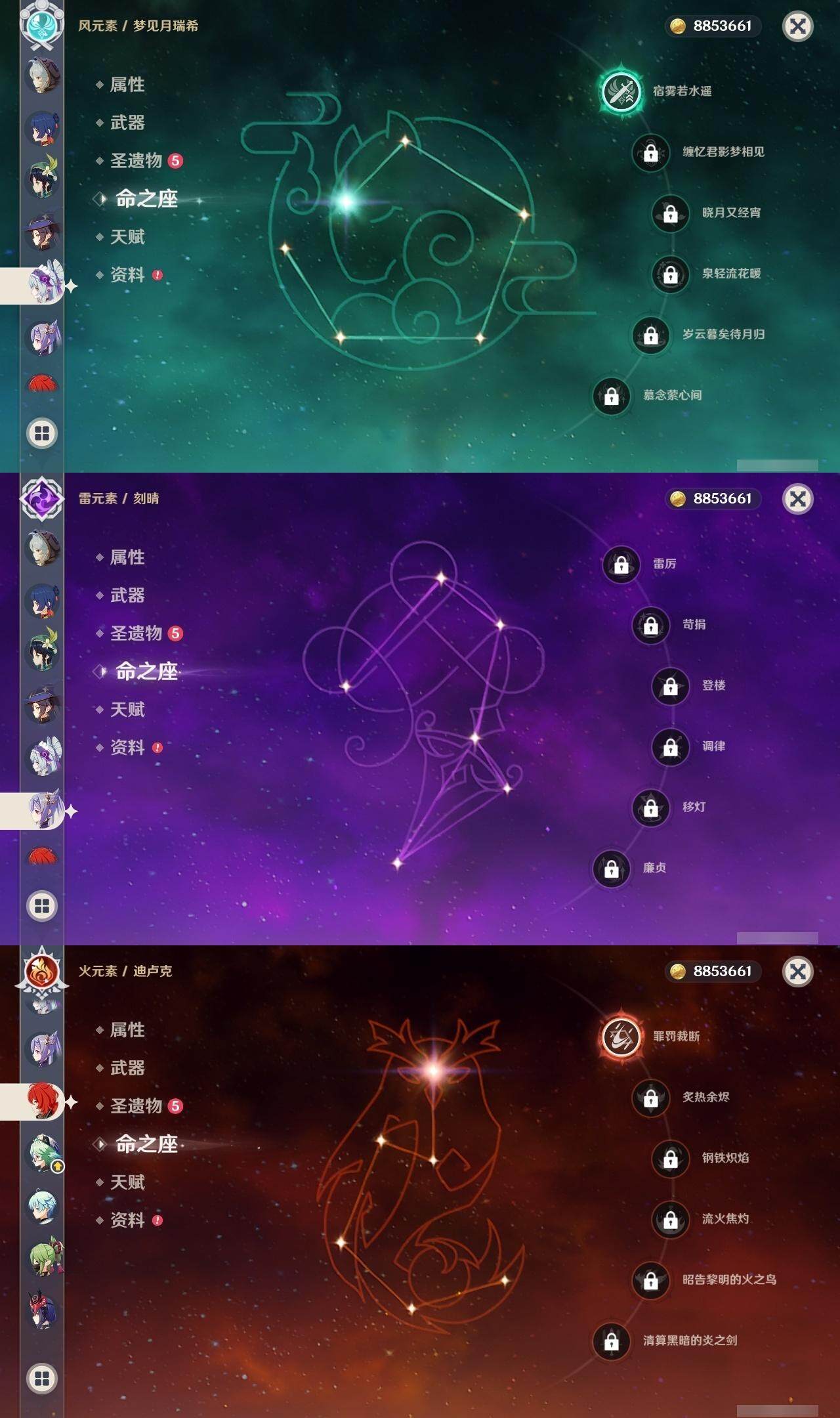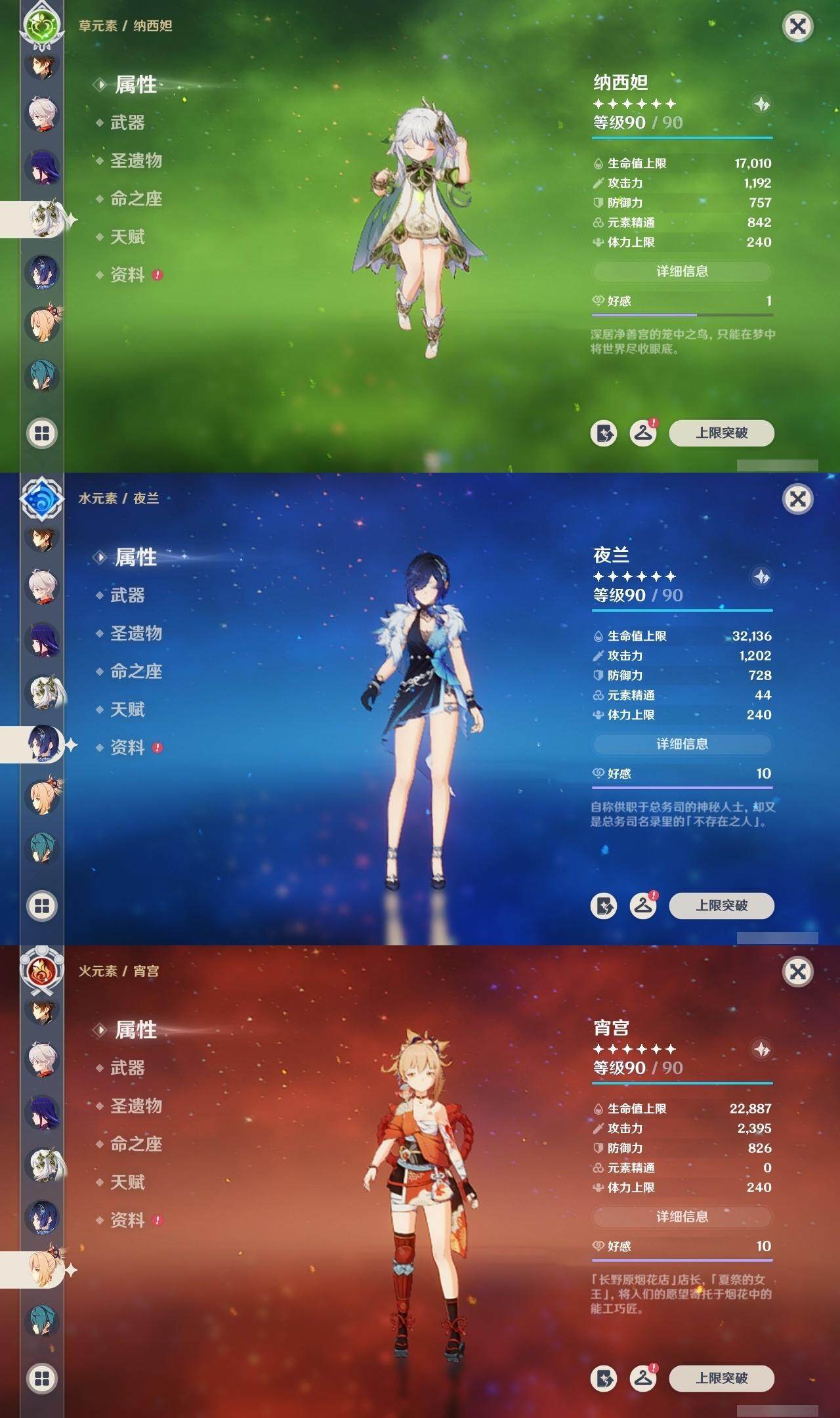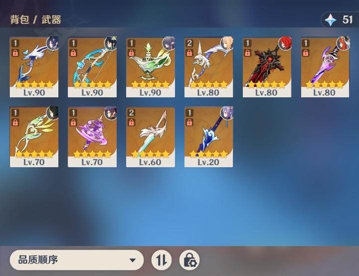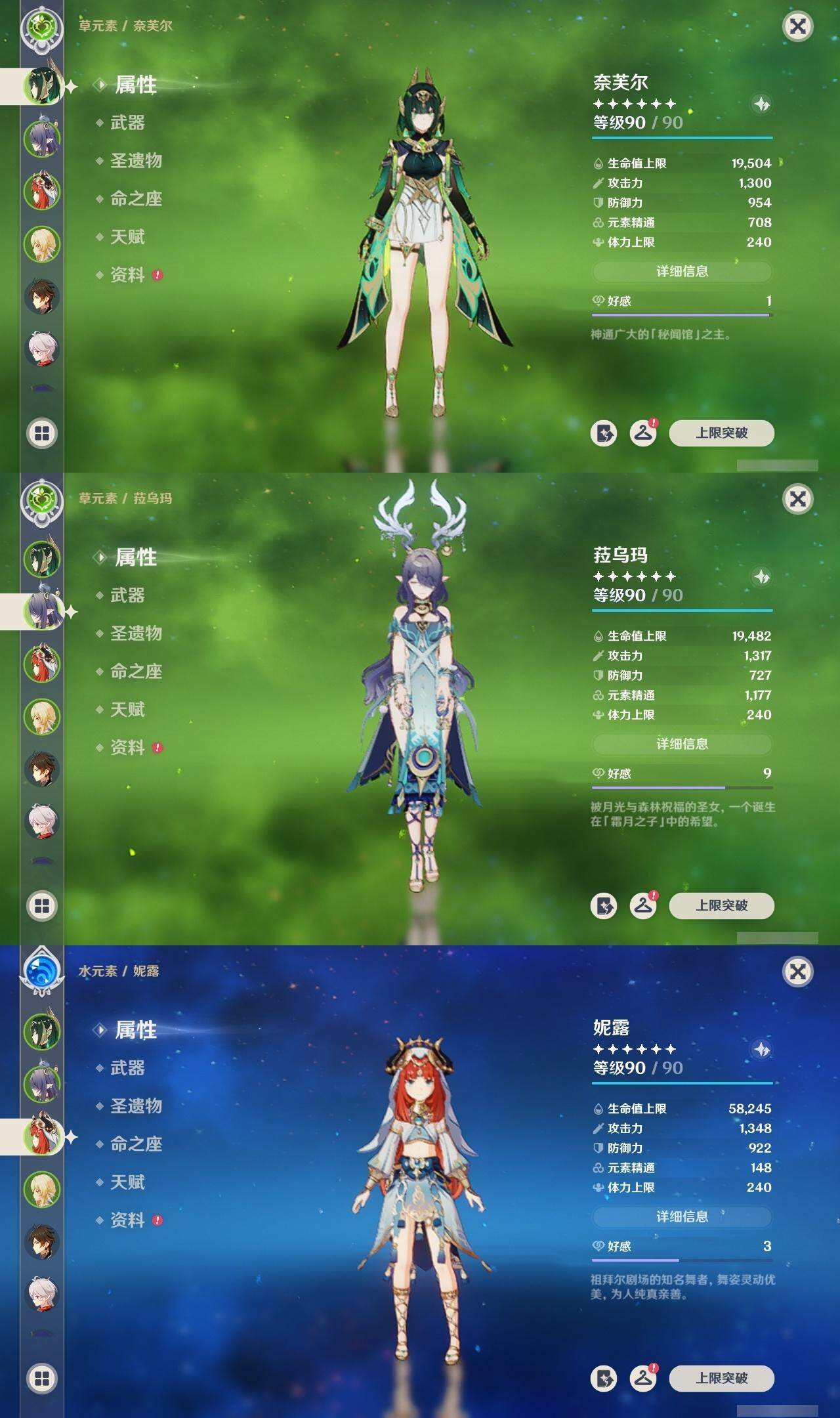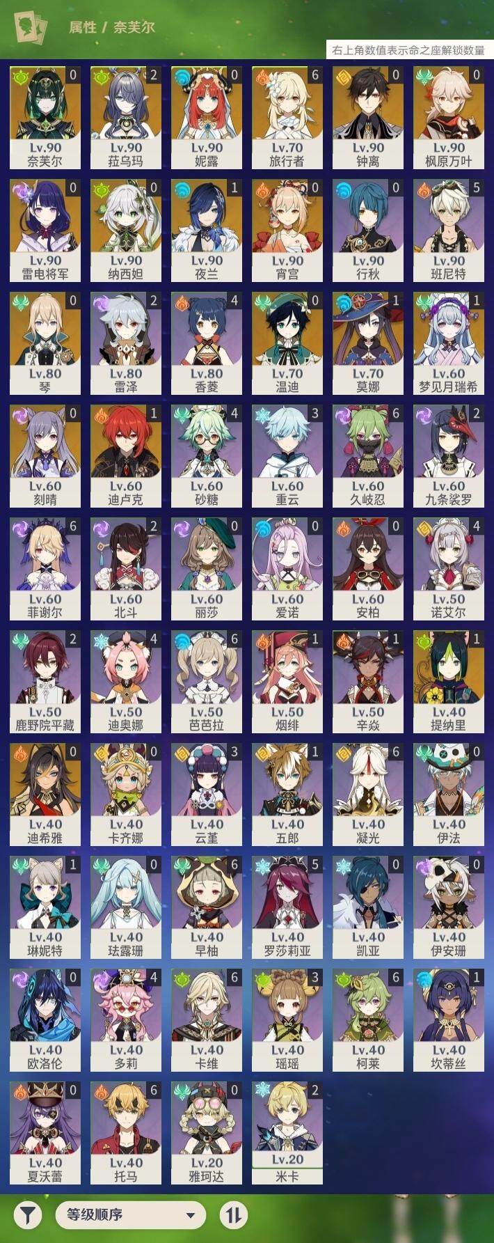 0命迪希雅,0命纳西妲,0命妮露,1命提纳里,1命夜兰,0命雷电将军,0命枫原万叶,0命钟离,0命宵宫,0命温迪,0命刻晴,0命琴,1命莫娜,1命迪卢克,1命梦见月瑞希,2命菈乌玛,0命奈芙尔,精1千夜浮梦,精1猎人之径,精1若水,精1波乱月白经津,精1神乐之真意,精1终末嗟叹之诗,精1雾切之回光,精2阿莫斯之弓,精2风鹰剑,精1狼的末路