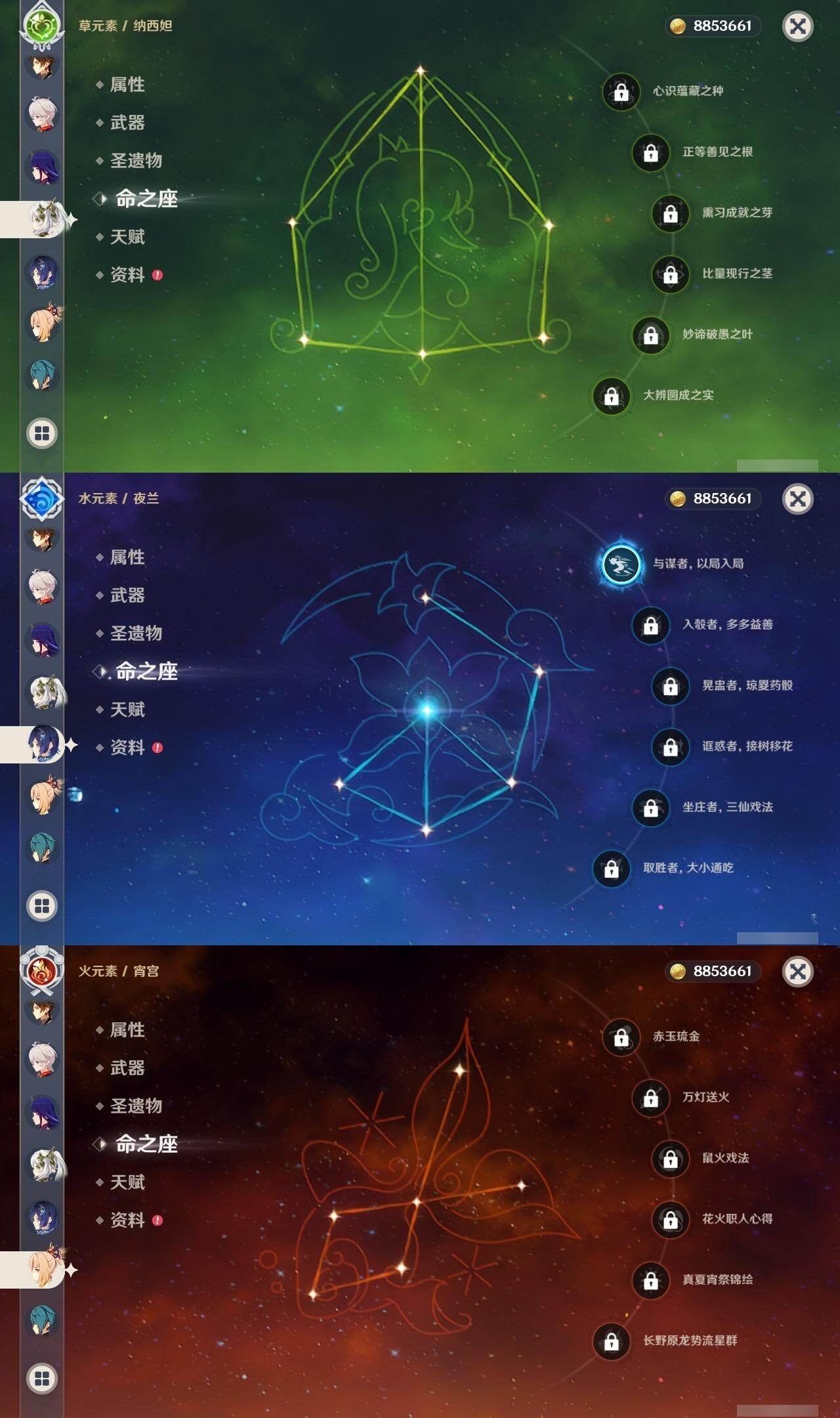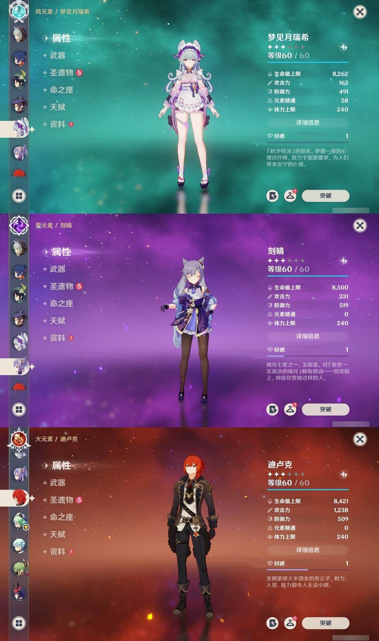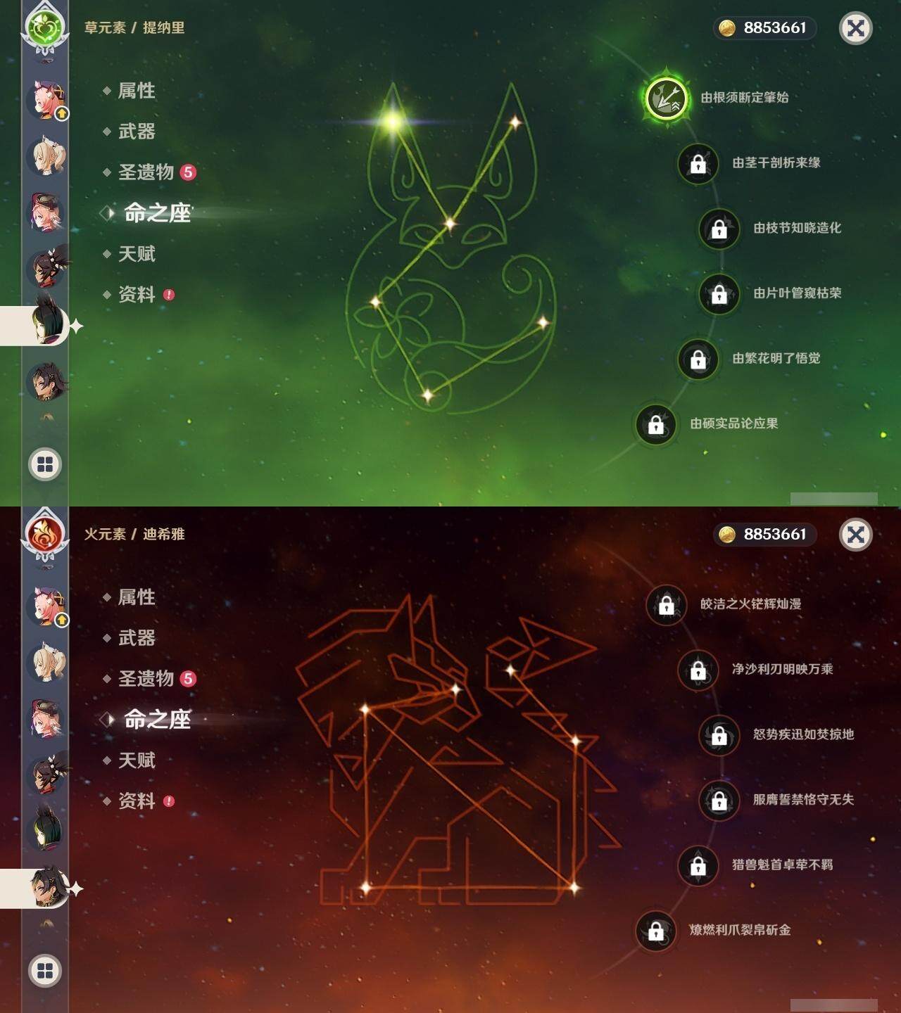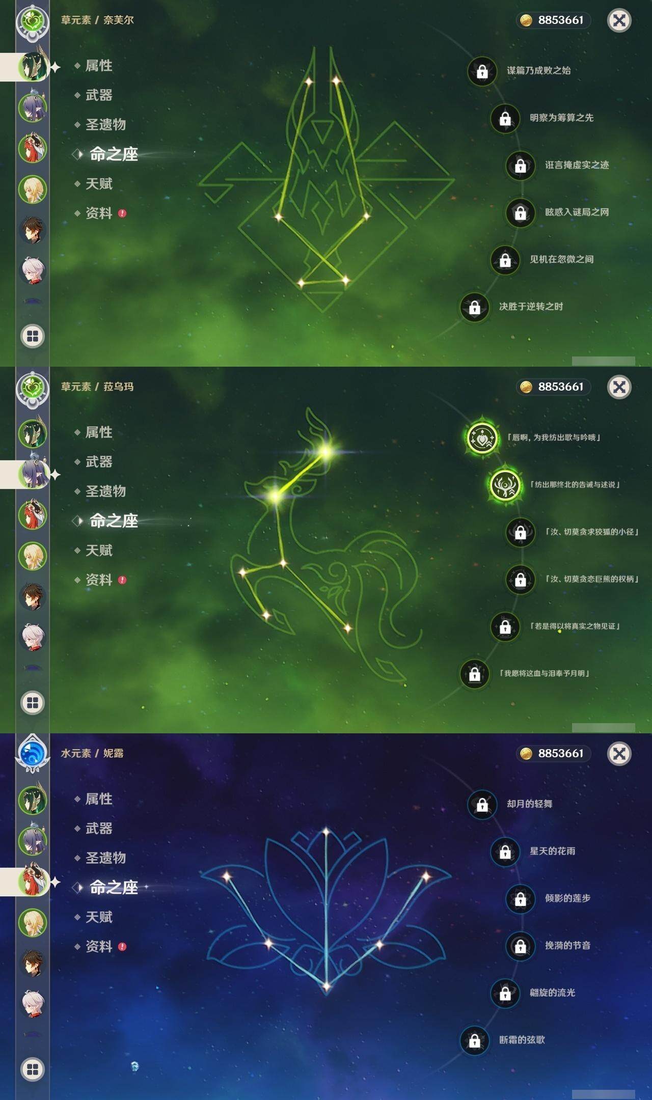 0命迪希雅,0命纳西妲,0命妮露,1命提纳里,1命夜兰,0命雷电将军,0命枫原万叶,0命钟离,0命宵宫,0命温迪,0命刻晴,0命琴,1命莫娜,1命迪卢克,1命梦见月瑞希,2命菈乌玛,0命奈芙尔,精1千夜浮梦,精1猎人之径,精1若水,精1波乱月白经津,精1神乐之真意,精1终末嗟叹之诗,精1雾切之回光,精2阿莫斯之弓,精2风鹰剑,精1狼的末路
