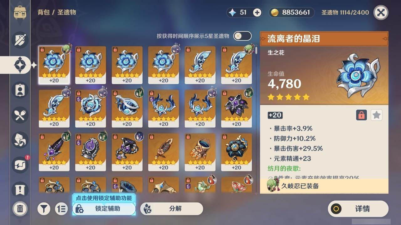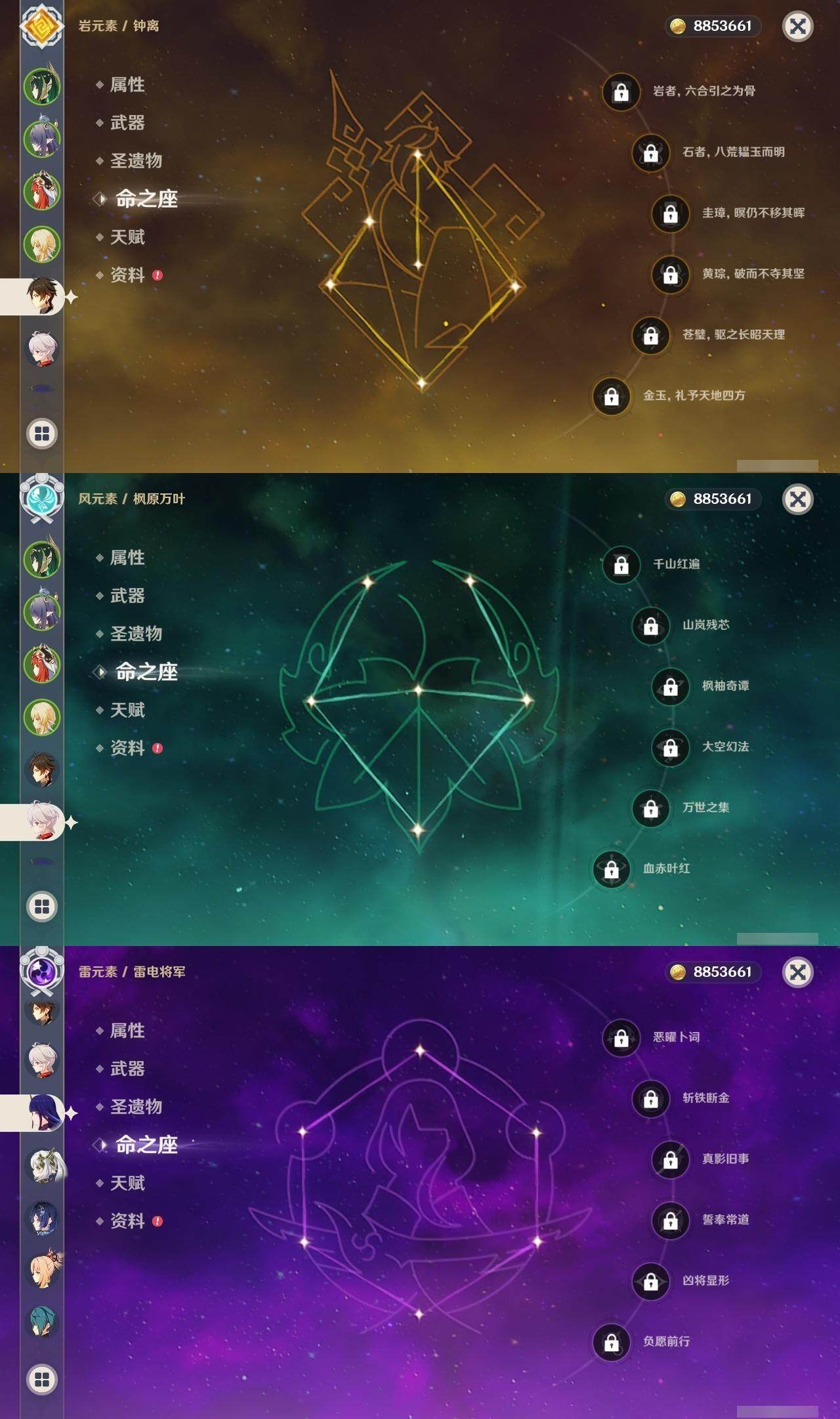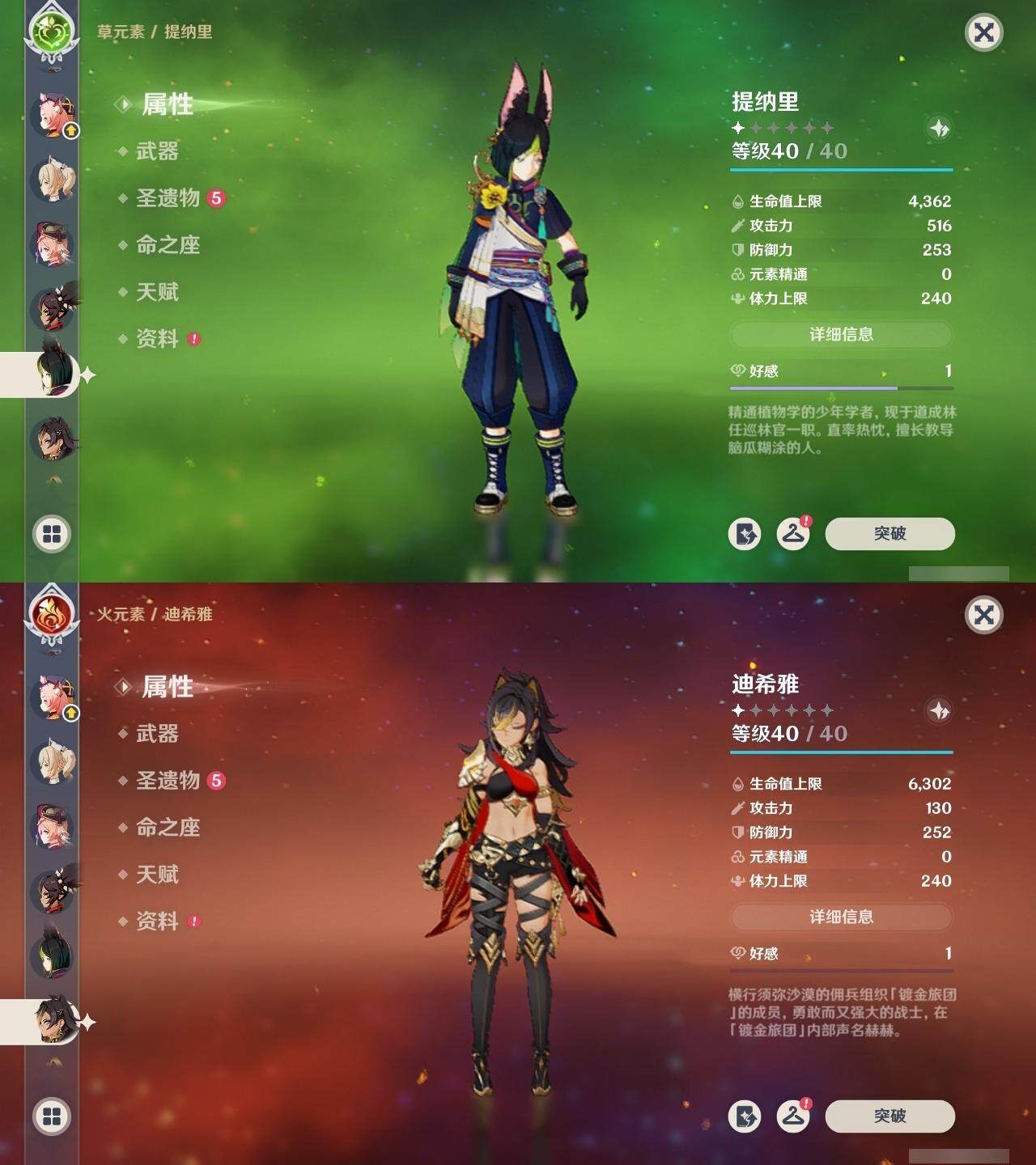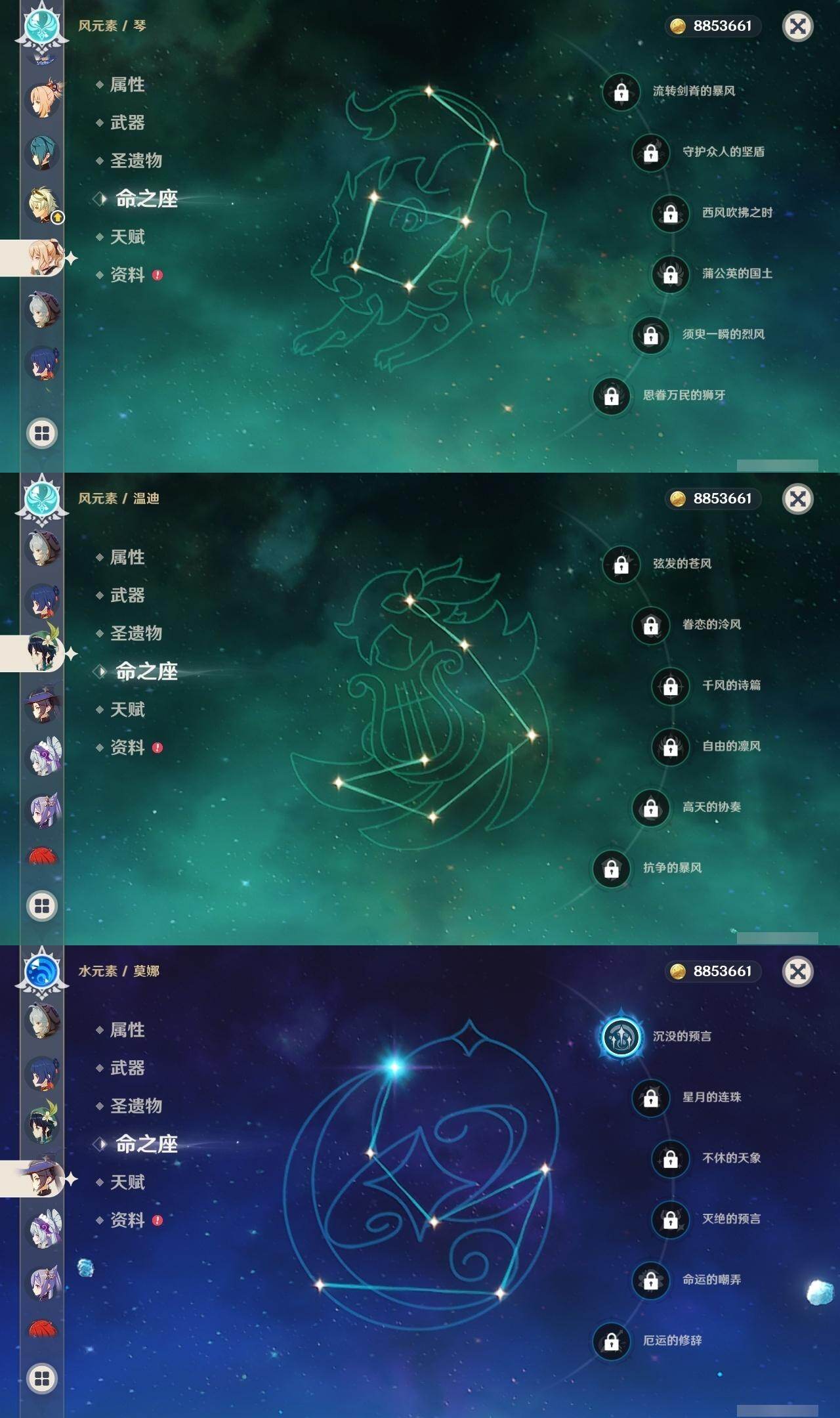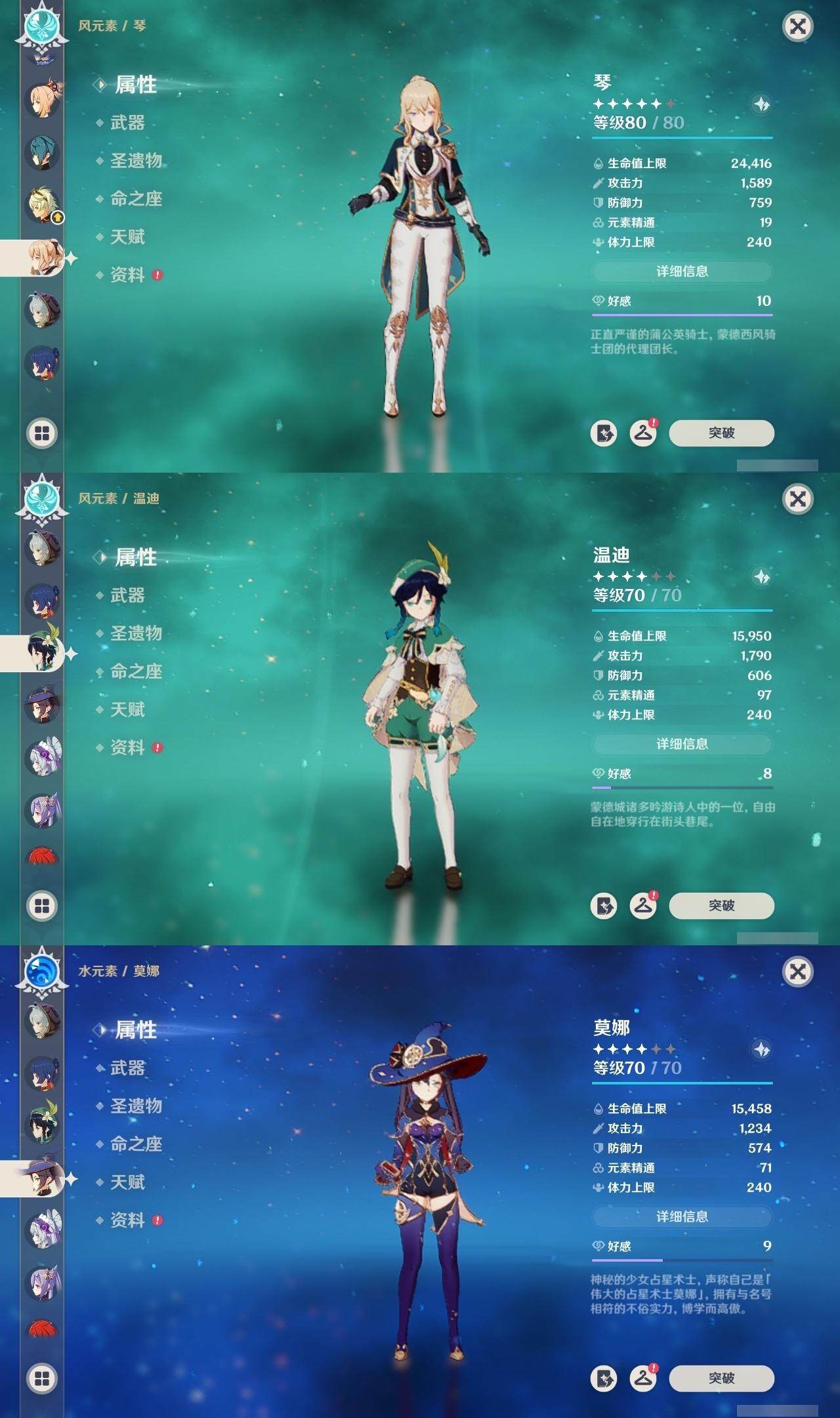 0命迪希雅,0命纳西妲,0命妮露,1命提纳里,1命夜兰,0命雷电将军,0命枫原万叶,0命钟离,0命宵宫,0命温迪,0命刻晴,0命琴,1命莫娜,1命迪卢克,1命梦见月瑞希,2命菈乌玛,0命奈芙尔,精1千夜浮梦,精1猎人之径,精1若水,精1波乱月白经津,精1神乐之真意,精1终末嗟叹之诗,精1雾切之回光,精2阿莫斯之弓,精2风鹰剑,精1狼的末路