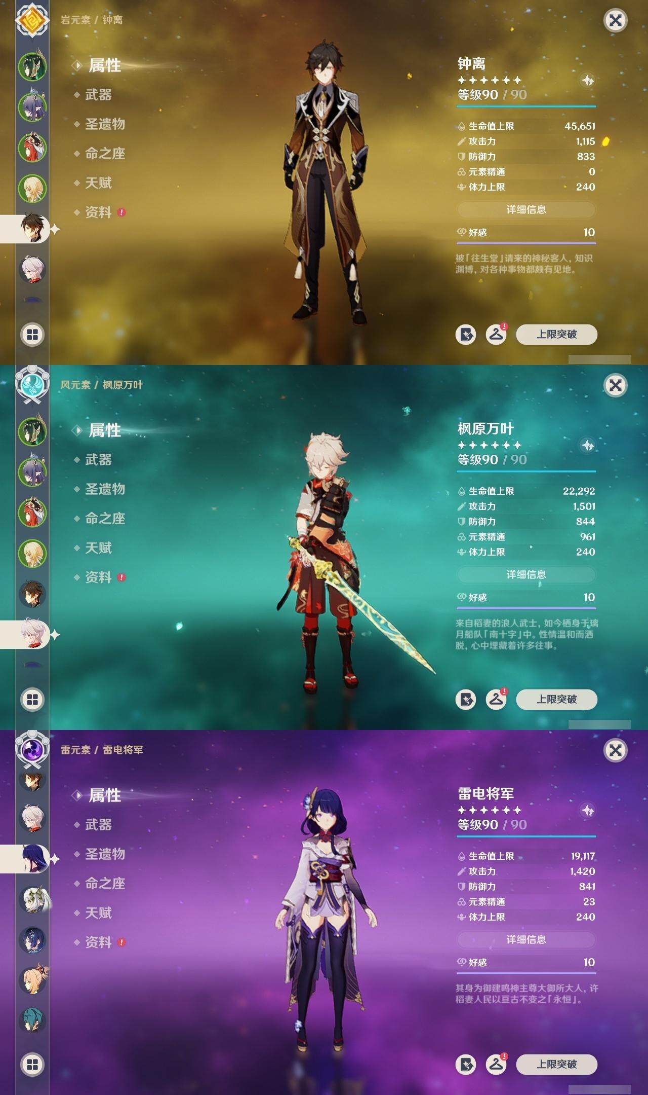 钟离,枫原万叶,雷电将军,宵宫,琴,温迪,莫娜,刻晴,迪卢克
