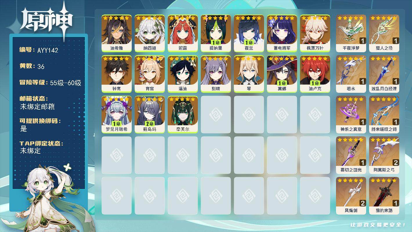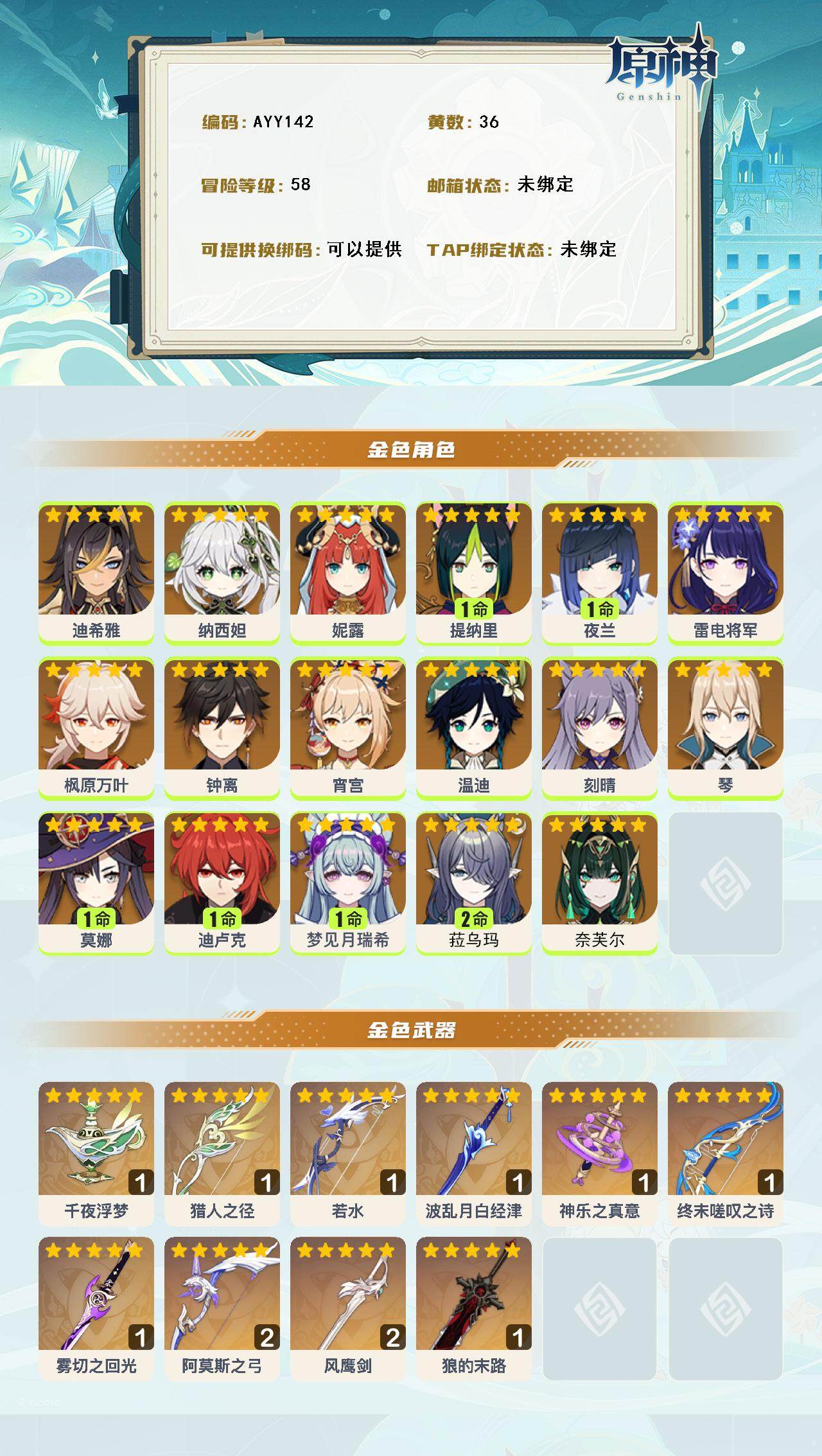 [15259415]58级/36黄/女主/17个五星角色/10个五星武器 0命迪希雅,0命纳西妲,0命妮露,1命提纳里,1命夜兰,0命雷电将军,0命枫原万叶,0命钟离,0命宵宫,0命温迪,0命刻晴,0命琴,1命莫娜,1命迪卢克,1命梦见月瑞希,2命菈乌玛,0命奈芙尔,精1千夜浮梦,精1猎人之径,精1若水,精1波乱月白经津,精1神乐之真意,精1终末嗟叹之诗,精1雾切之回光,精2阿莫斯之弓,精2风鹰剑,精1狼的末路