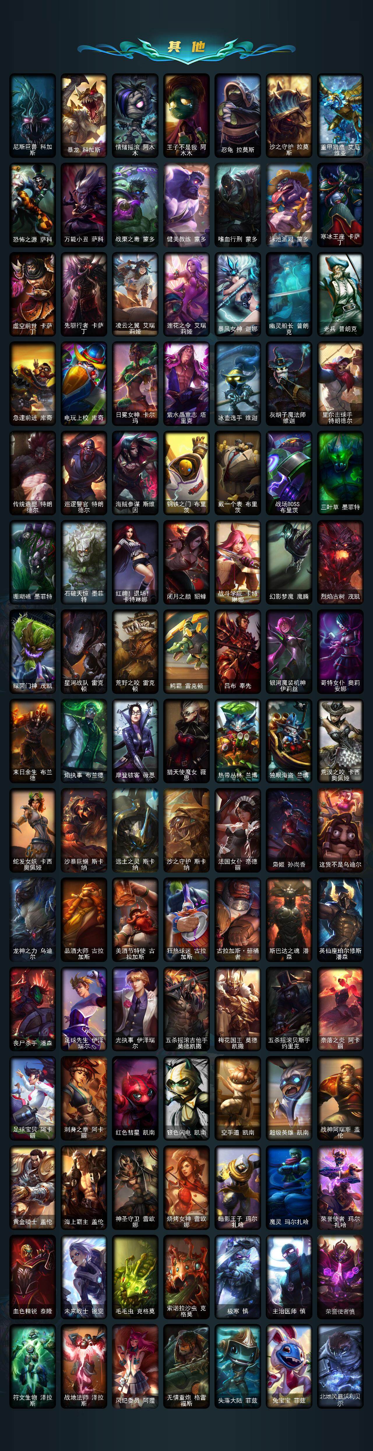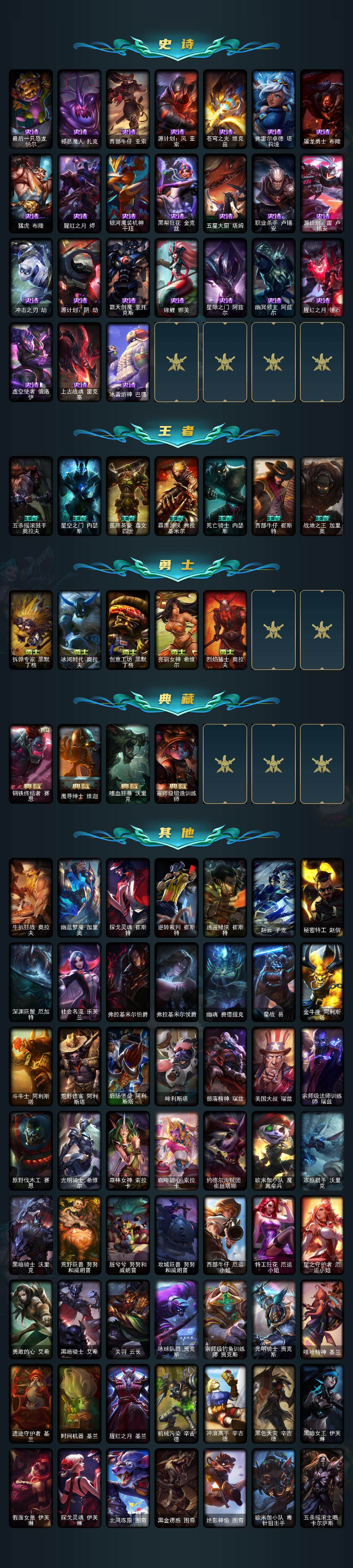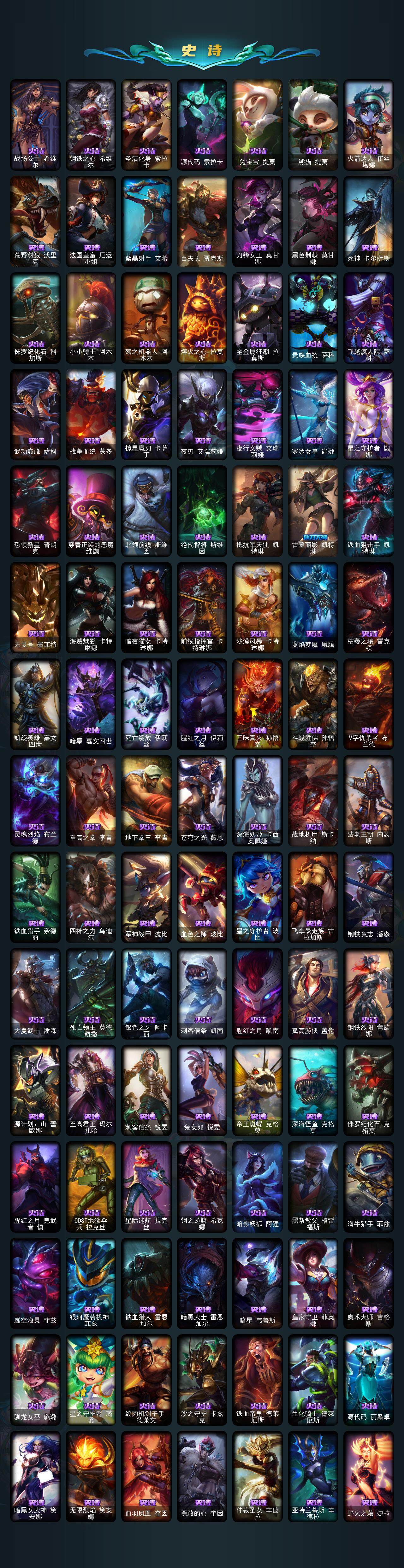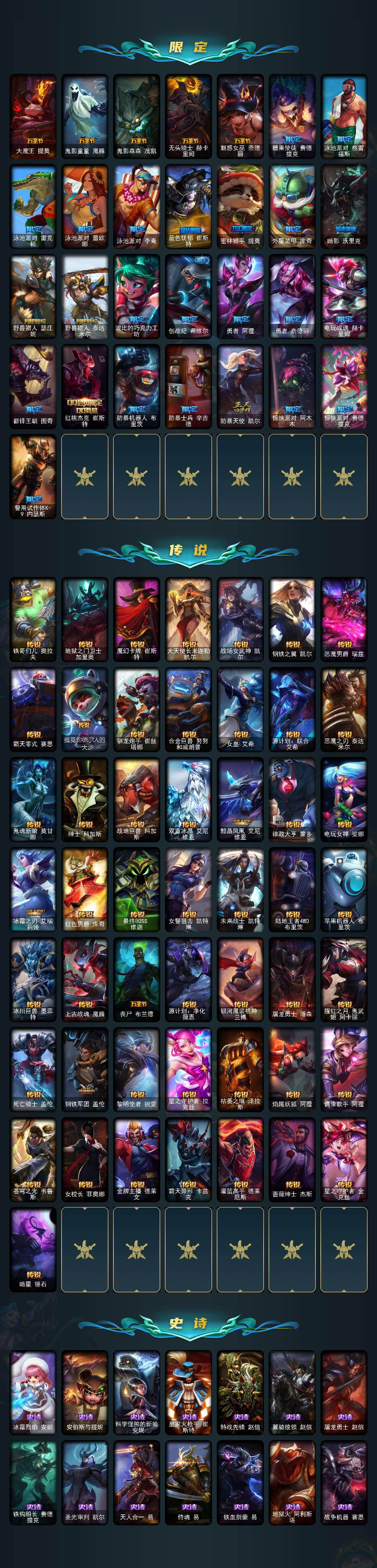 【传说皮肤】:铁哥们儿奥拉夫,地狱之门卫士加里奥,魔幻卡牌崔斯特,大天使长米迦勒凯尔,战场女武神凯尔,钢铁之翼凯尔,恶魔男爵瑞兹,霸天零式赛恩,提莫约德尔人的一大步,驯龙炮手崔丝塔娜,合金巨兽努努和威朗